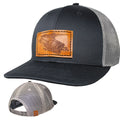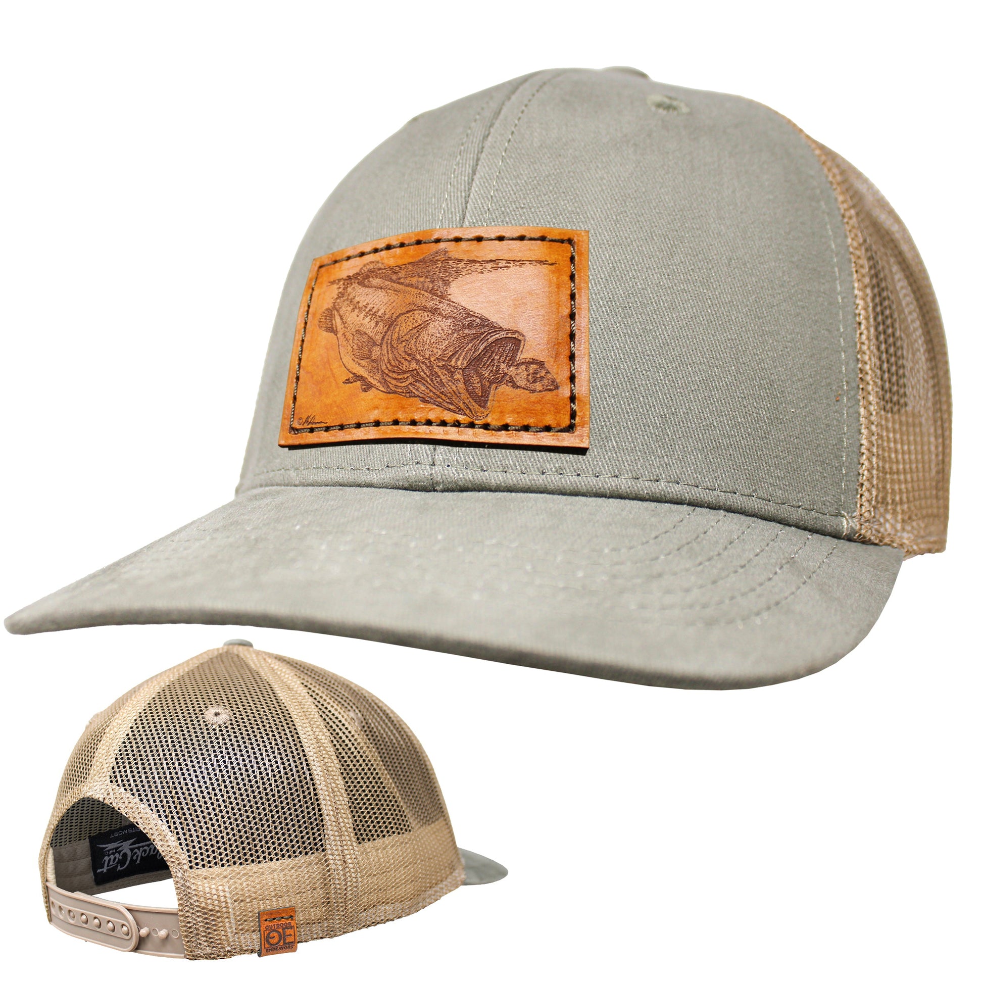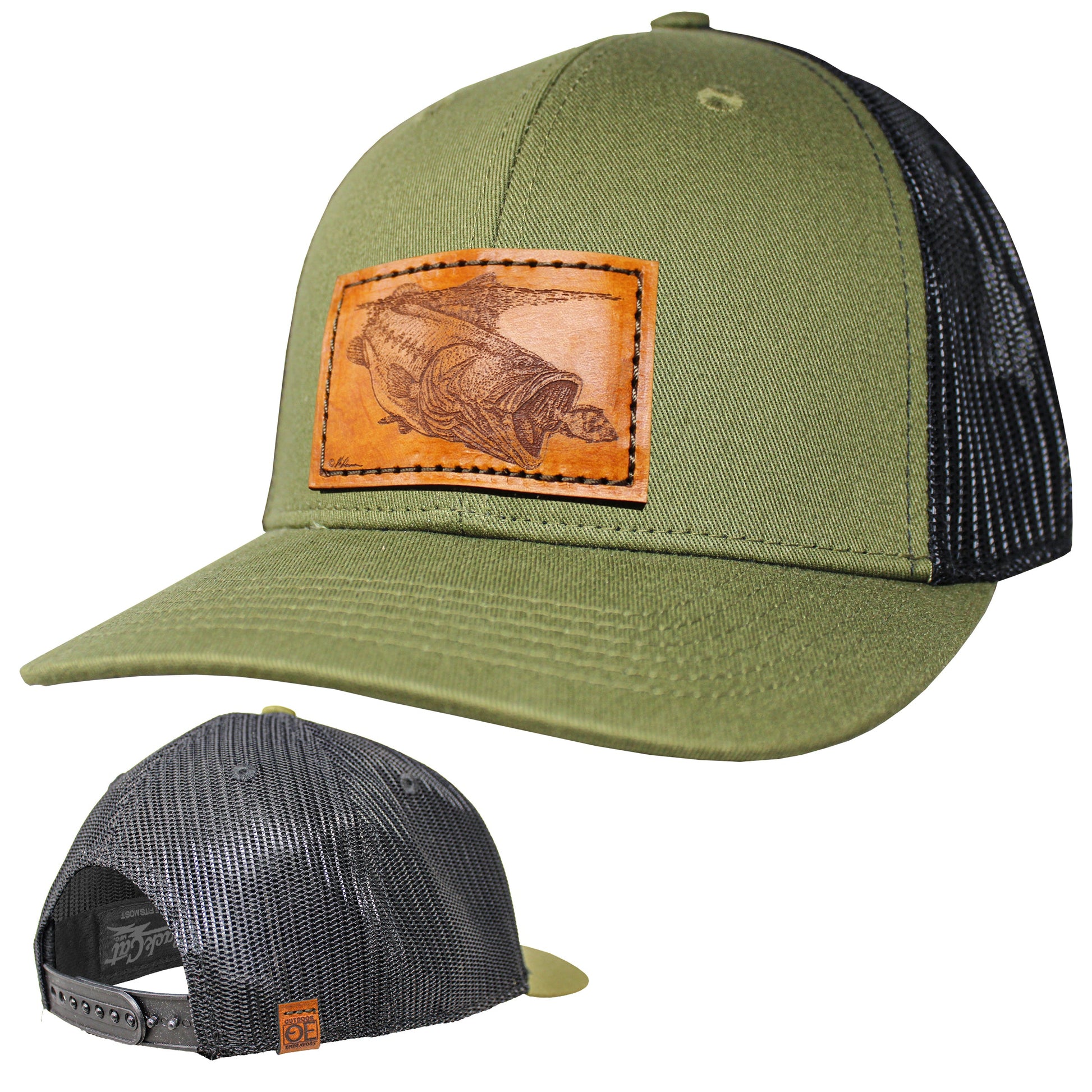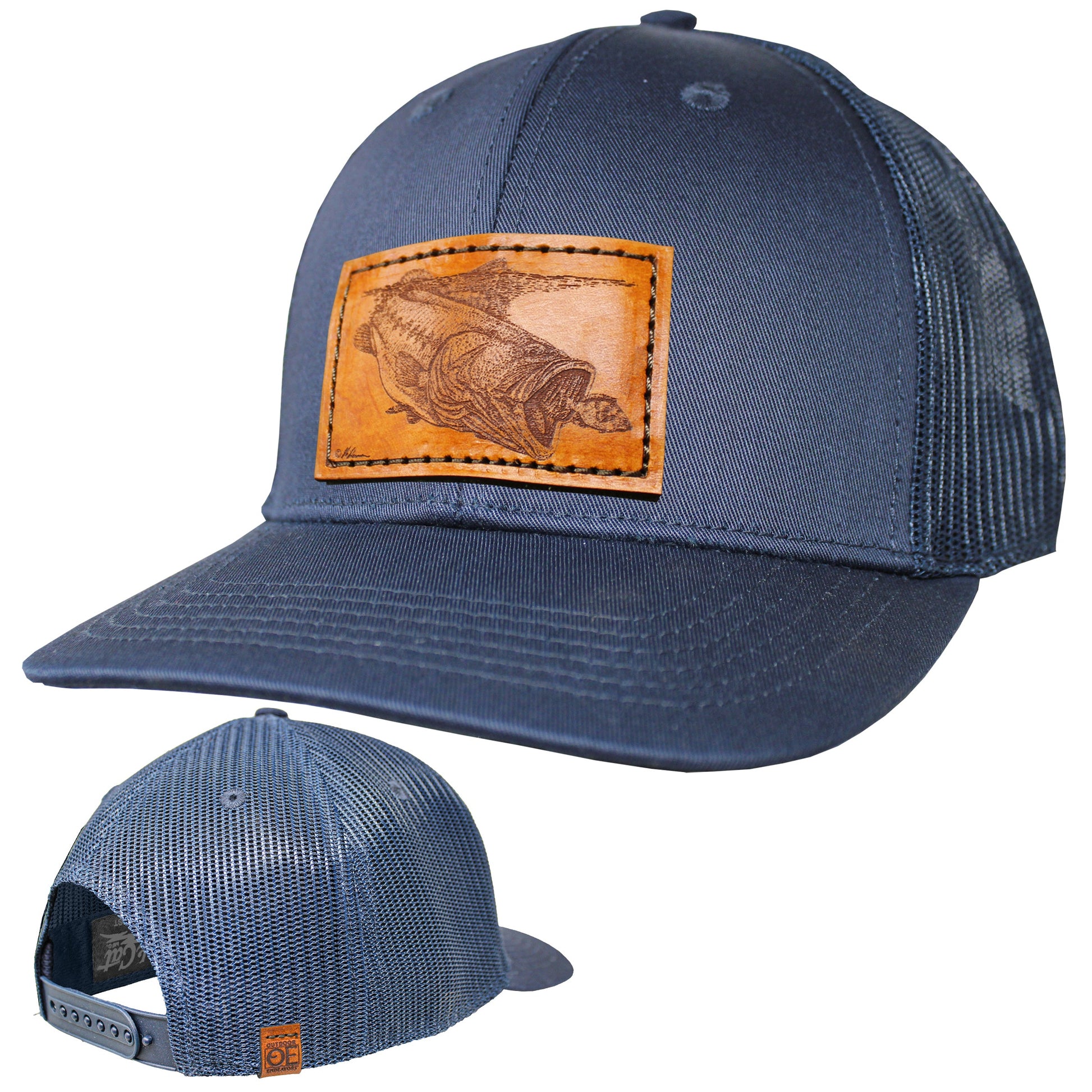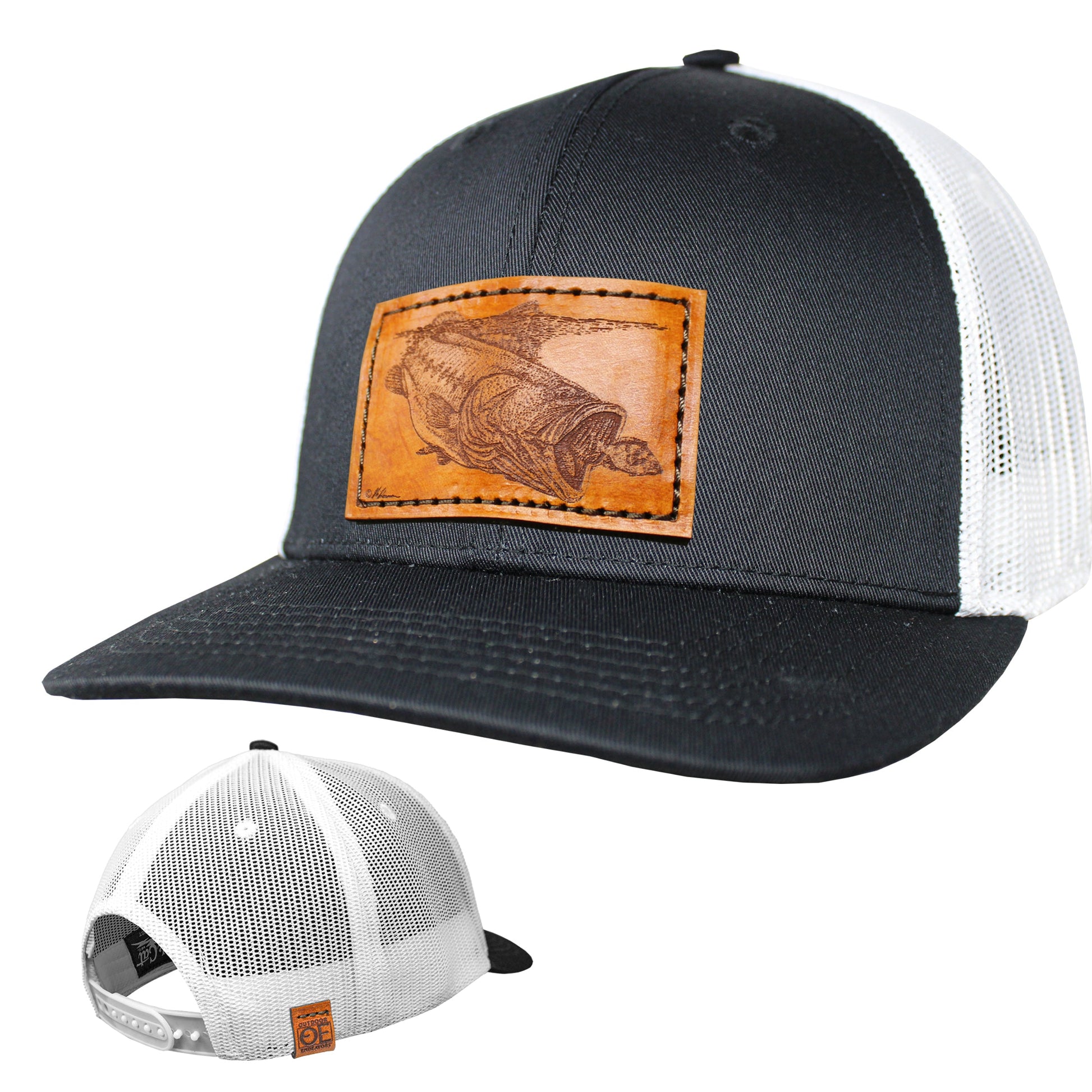 6 panel mid profile trucker cap with plastic closure. Moisture wicking fabrics on sweatband and inner front panel for best performance comfort. Decorated with a quality genuine leather patch with a largemouth bass gulping a brim illustrated by Matt Herman.