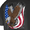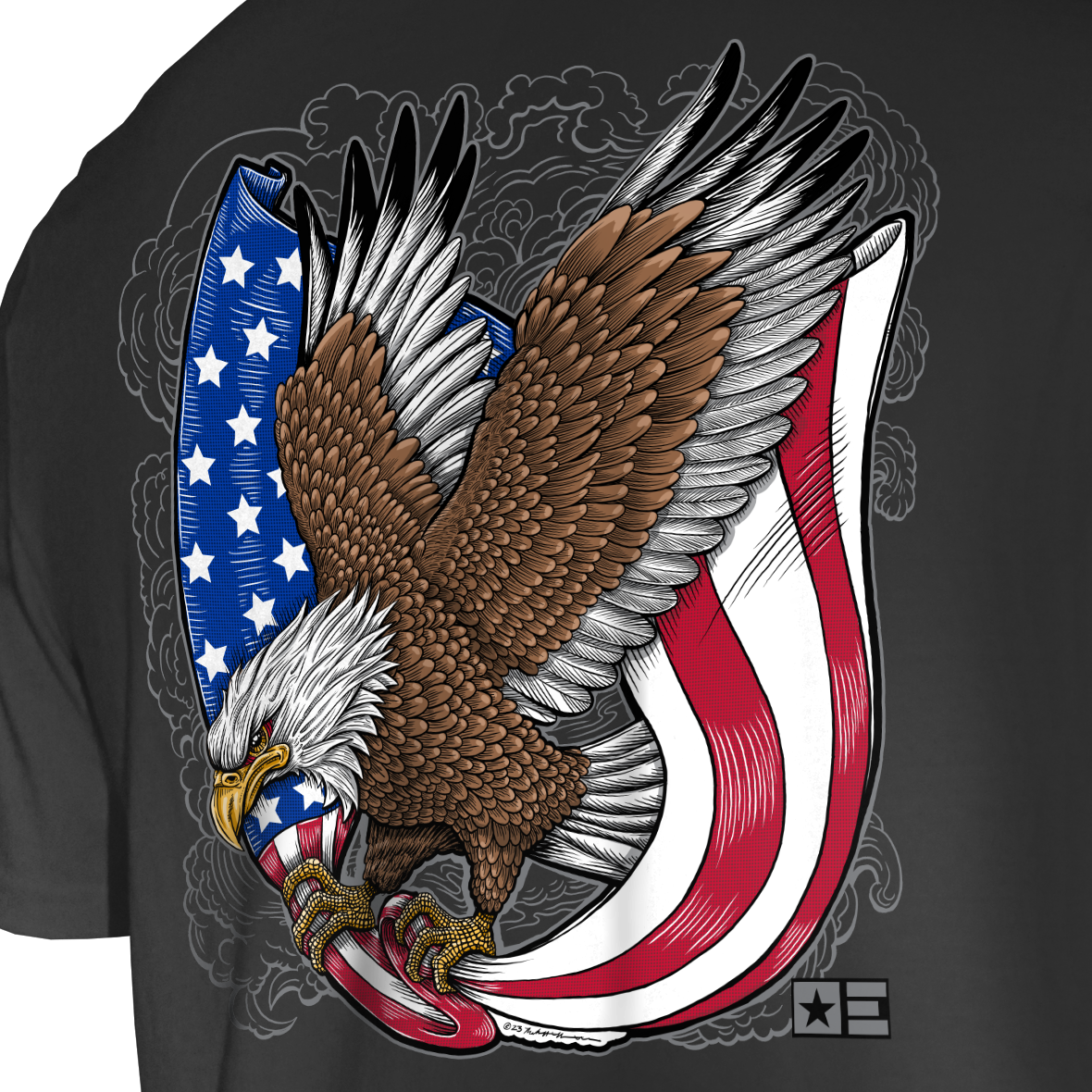 This short sleeve tee design shows our tattoo style eagle clinching our flag in patriotic colors. All illustrations done by Matt Herman. This design is part of the Patriotic collection that represents our passionate patriotic side and our appreciation for the USA.