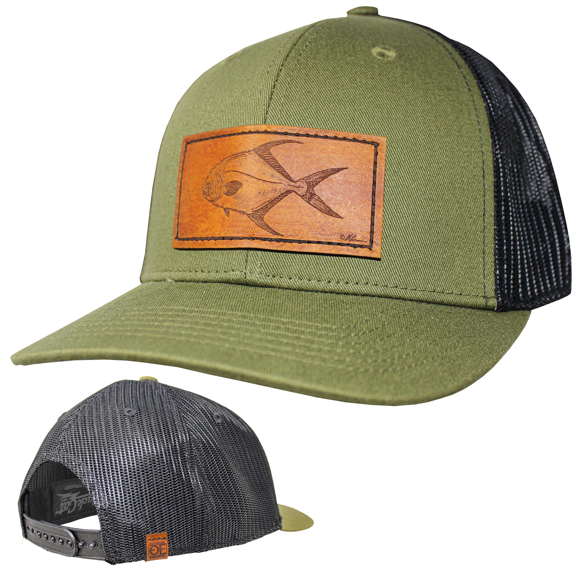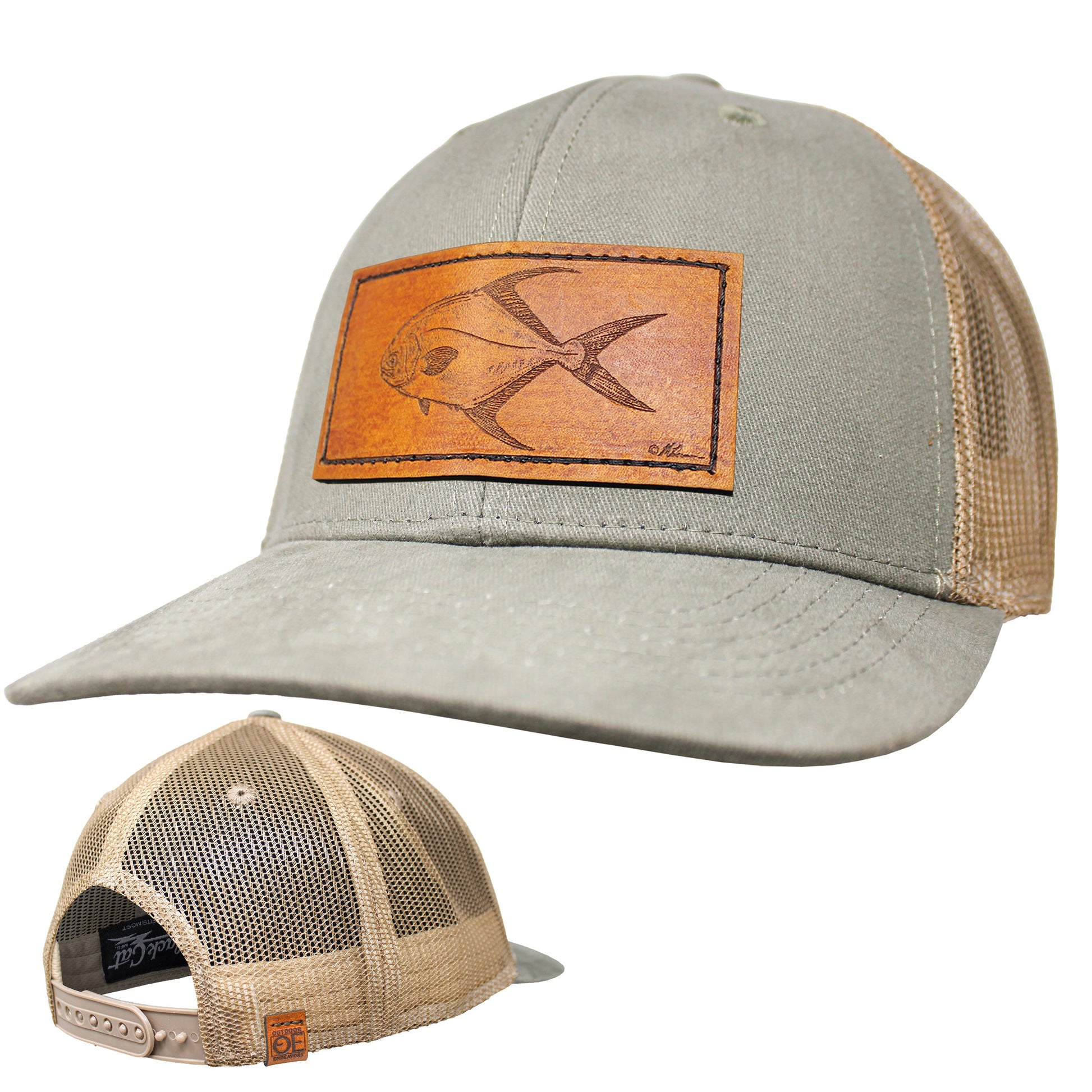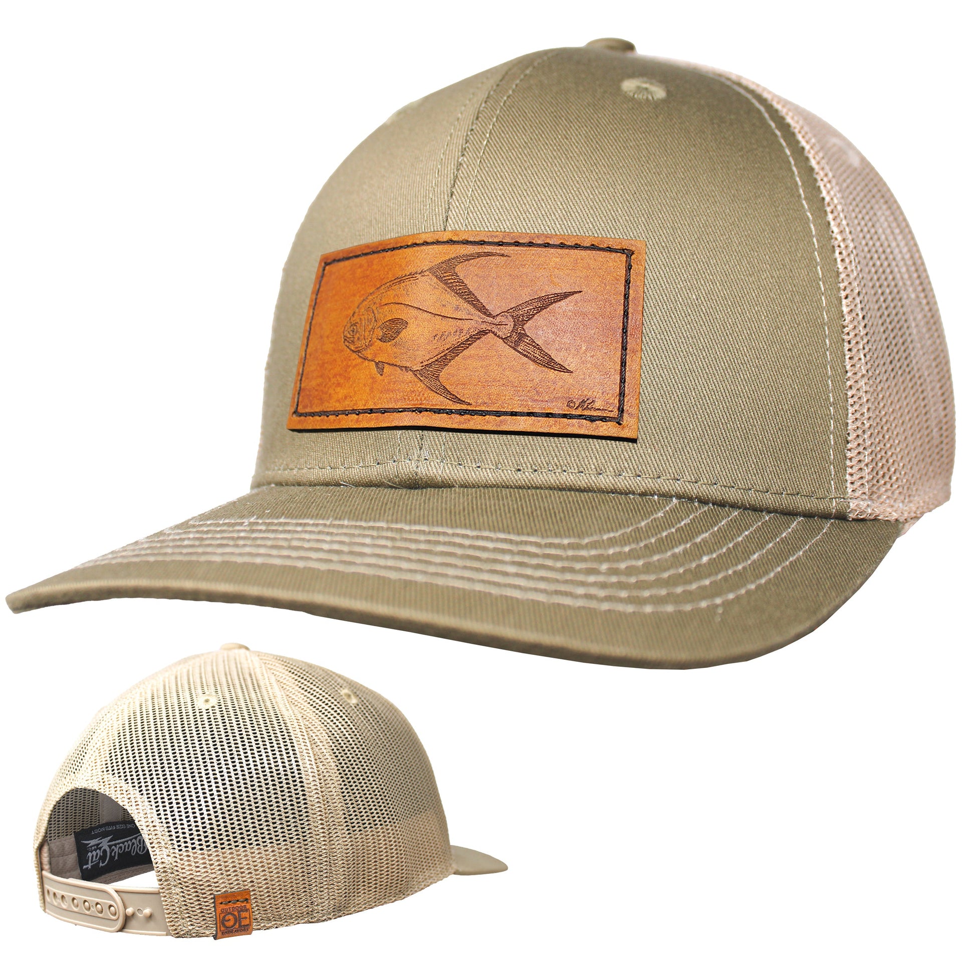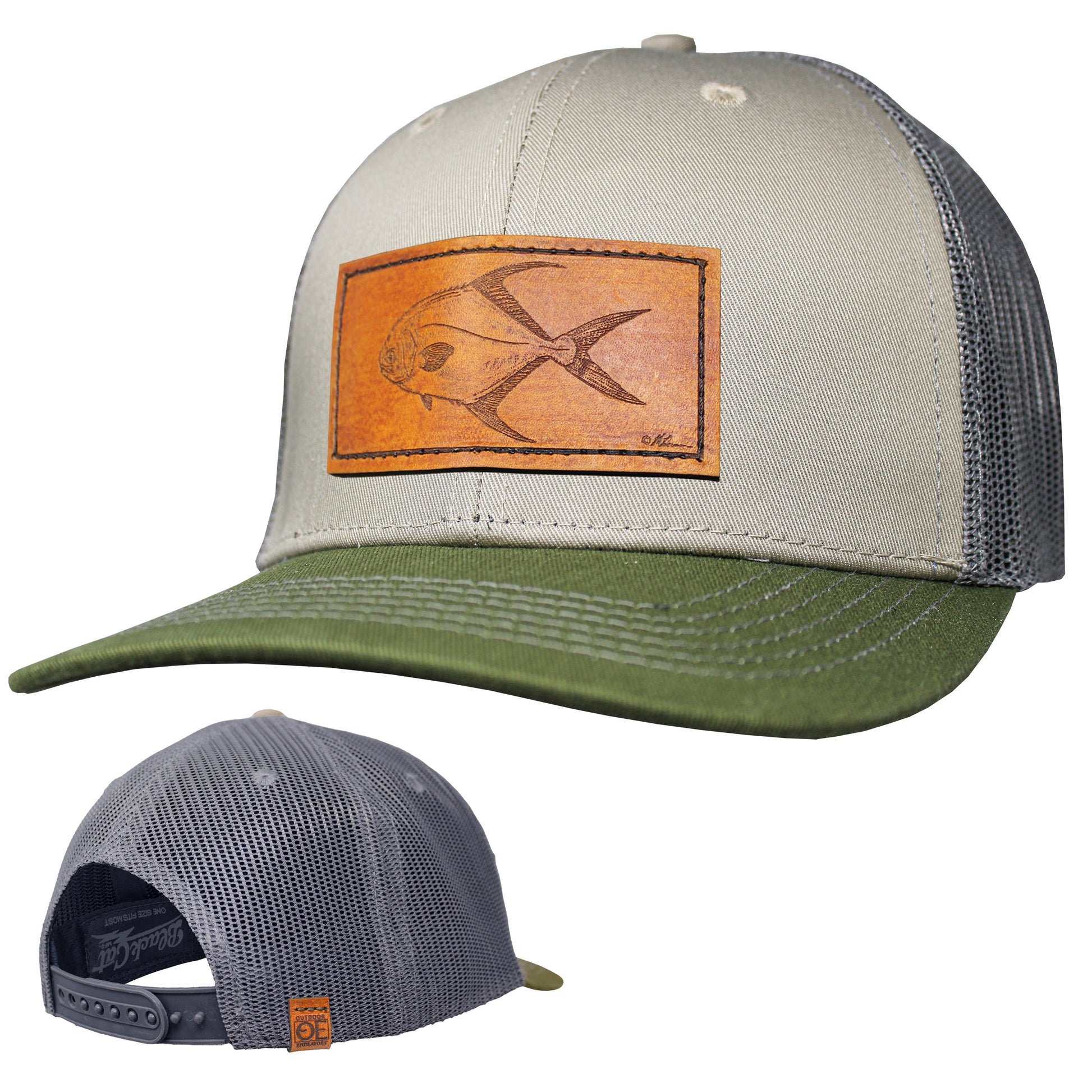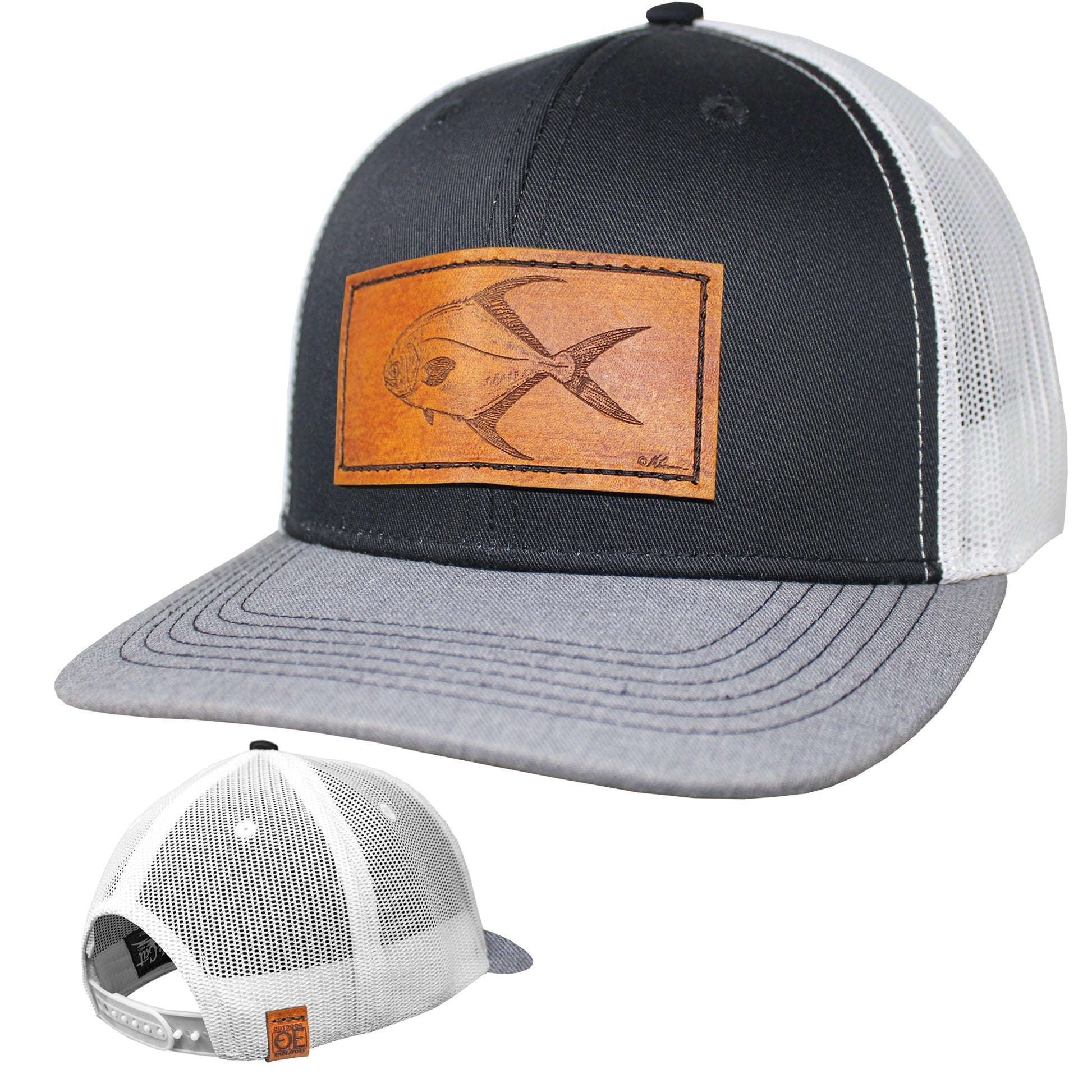 6 panel mid profile trucker cap with plastic closure. Moisture wicking fabrics on sweatband and inner front panel for best performance comfort. Decorated with a quality genuine leather patch with Permit illustration from Matt Herman. Available in 2 colors for limited time!