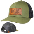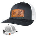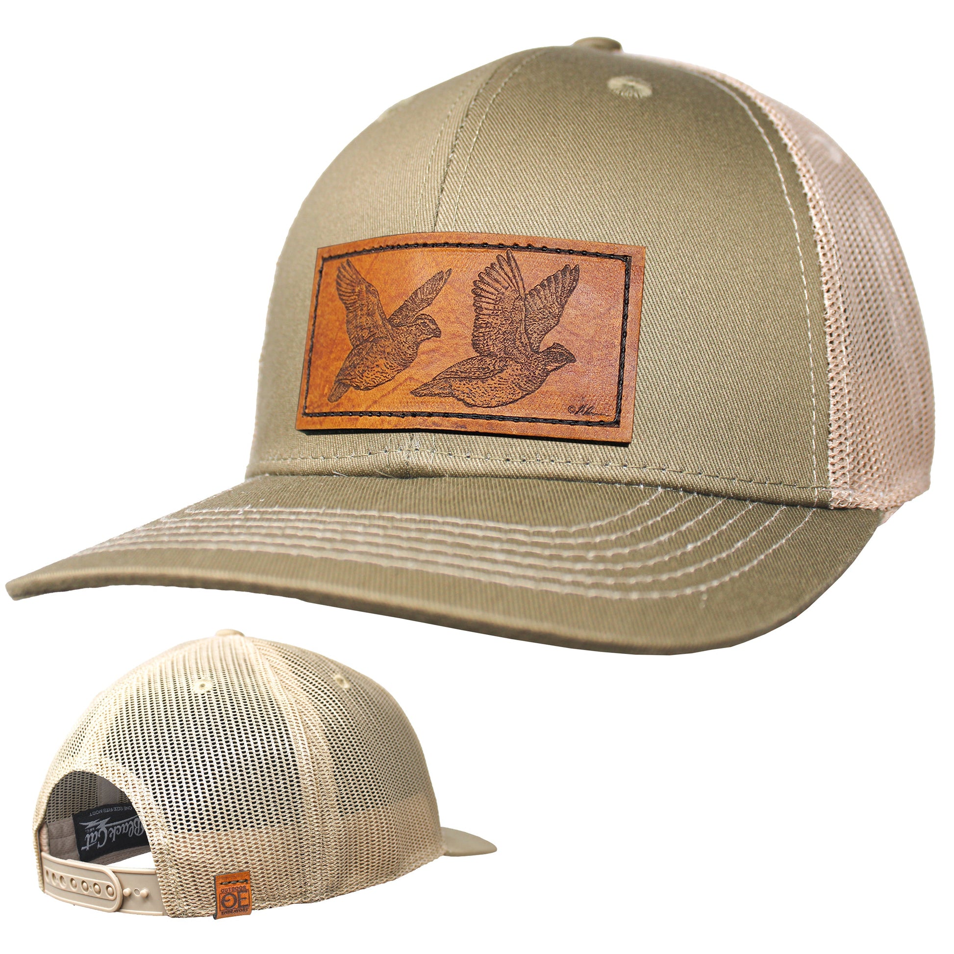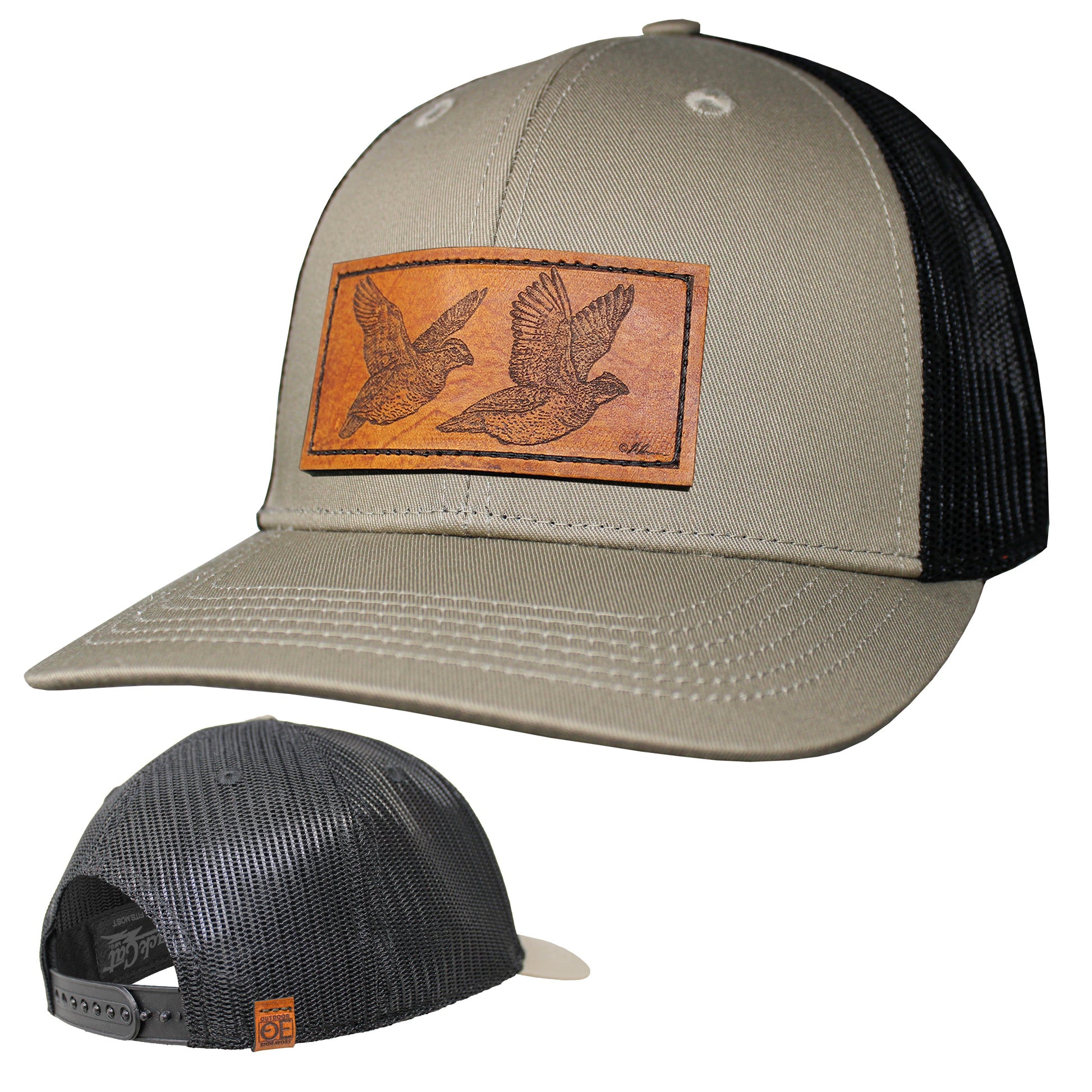 6 panel mid profile trucker cap with plastic closure. Moisture wicking fabrics on sweatband and inner front panel for best performance comfort. Decorated with a quality genuine leather patch with Quail illustration from Matt Herman. Available in 2 colors for limited time!