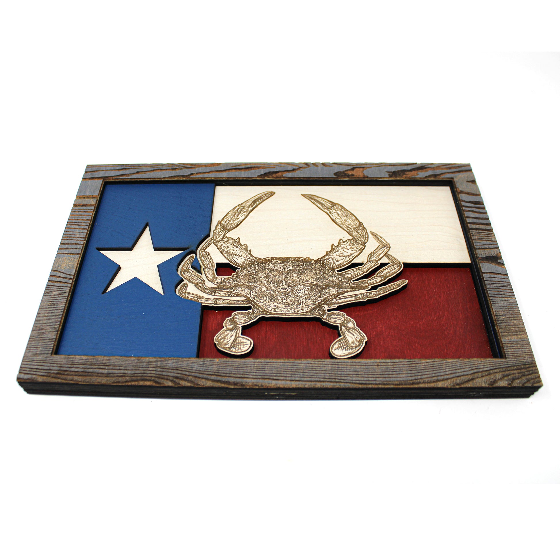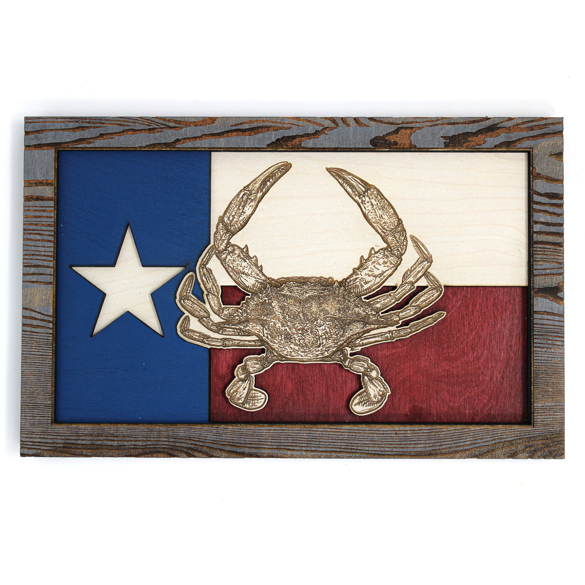 This custom crafted 3D wood wall art decor was created using one of Matt Herman’s illustrated Blue Crab as the focal point with the Texas Flag as the backdrop. The art is then programmed using intricate laser engraving processes to ensure high quality detail. The heavily distressed wooden border frame was custom made for this series. Each piece is designed with 3 layers of birch veneer wood showing hand stained colors of barn red, washed white and weathered grey shades making each one unique in its own way. Proudly made in Tallahassee, FL. USA
