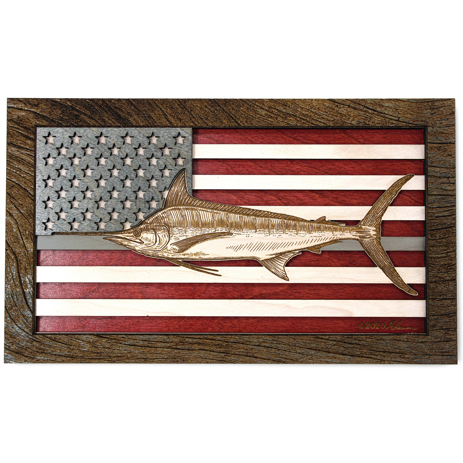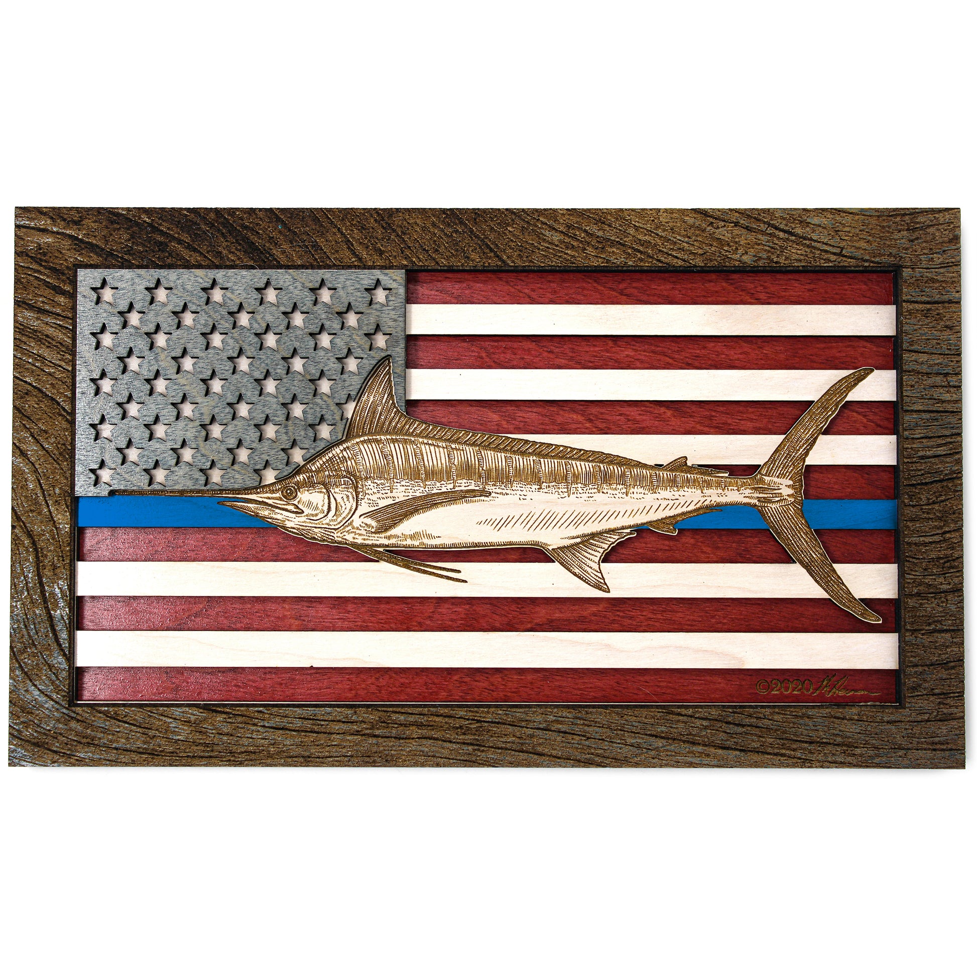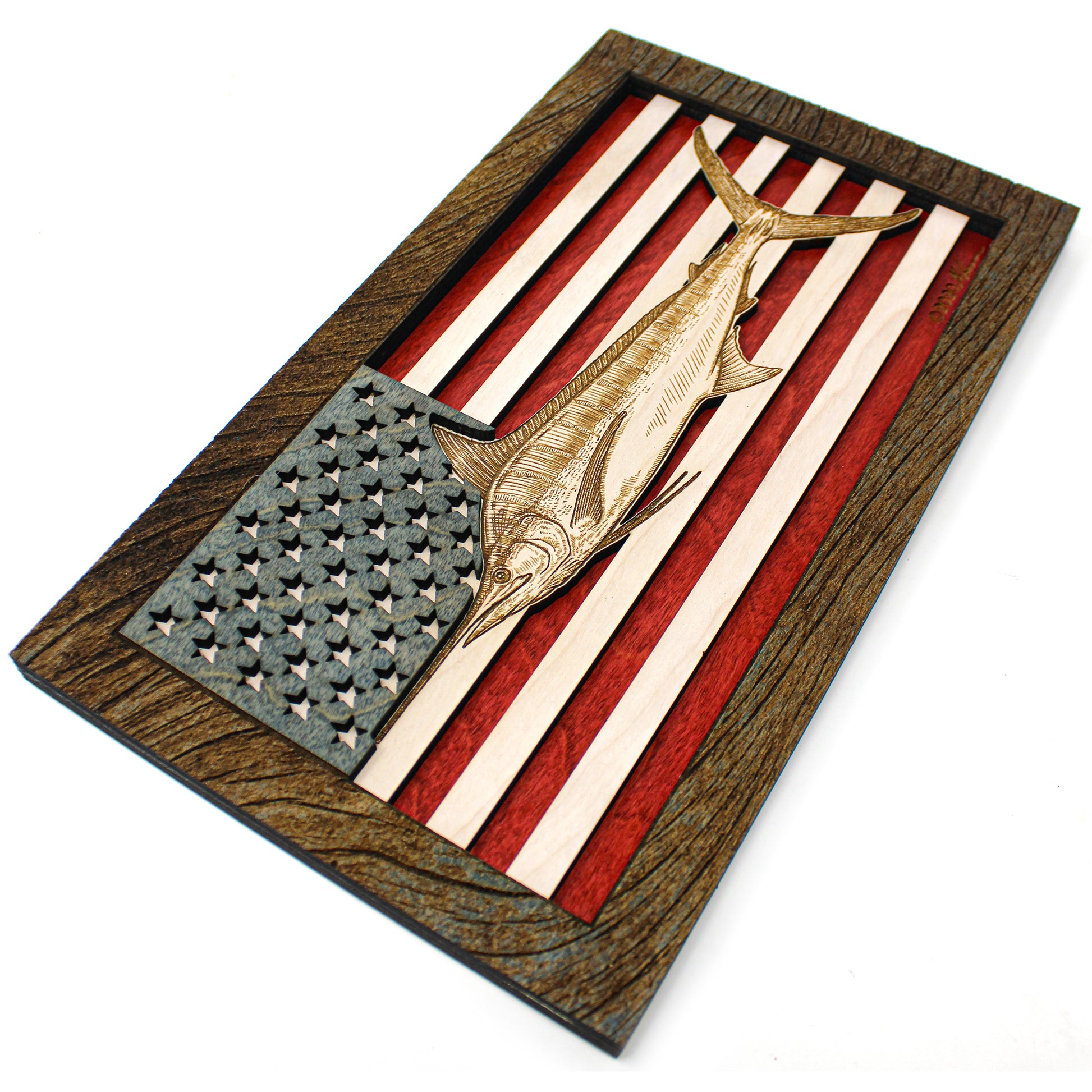 This custom crafted 3D wood wall art decor was created using one of Matt Herman’s illustrated scientific study interpretations of a Blue Marlin as the focal point with the American Flag as the backdrop. The art is then programmed using intricate laser engraving processes to ensure high quality detail. The heavily distressed driftwood border frame was custom made for this series. Each piece is designed with 3 layers of birch veneer wood showing hand stained colors of barn red, washed white and weathered grey shades making each one unique in its own way. Proudly made in Tallahassee, FL. USA