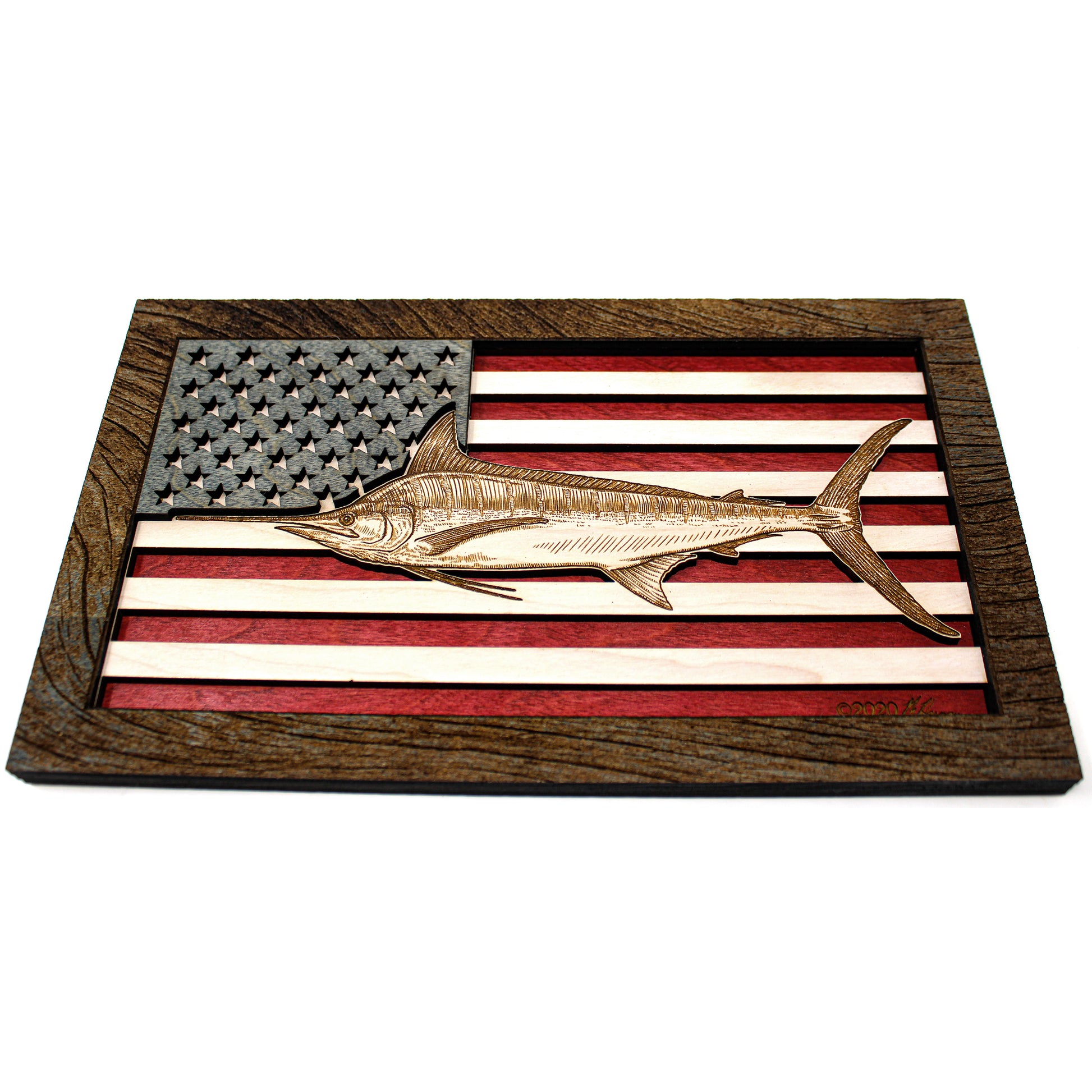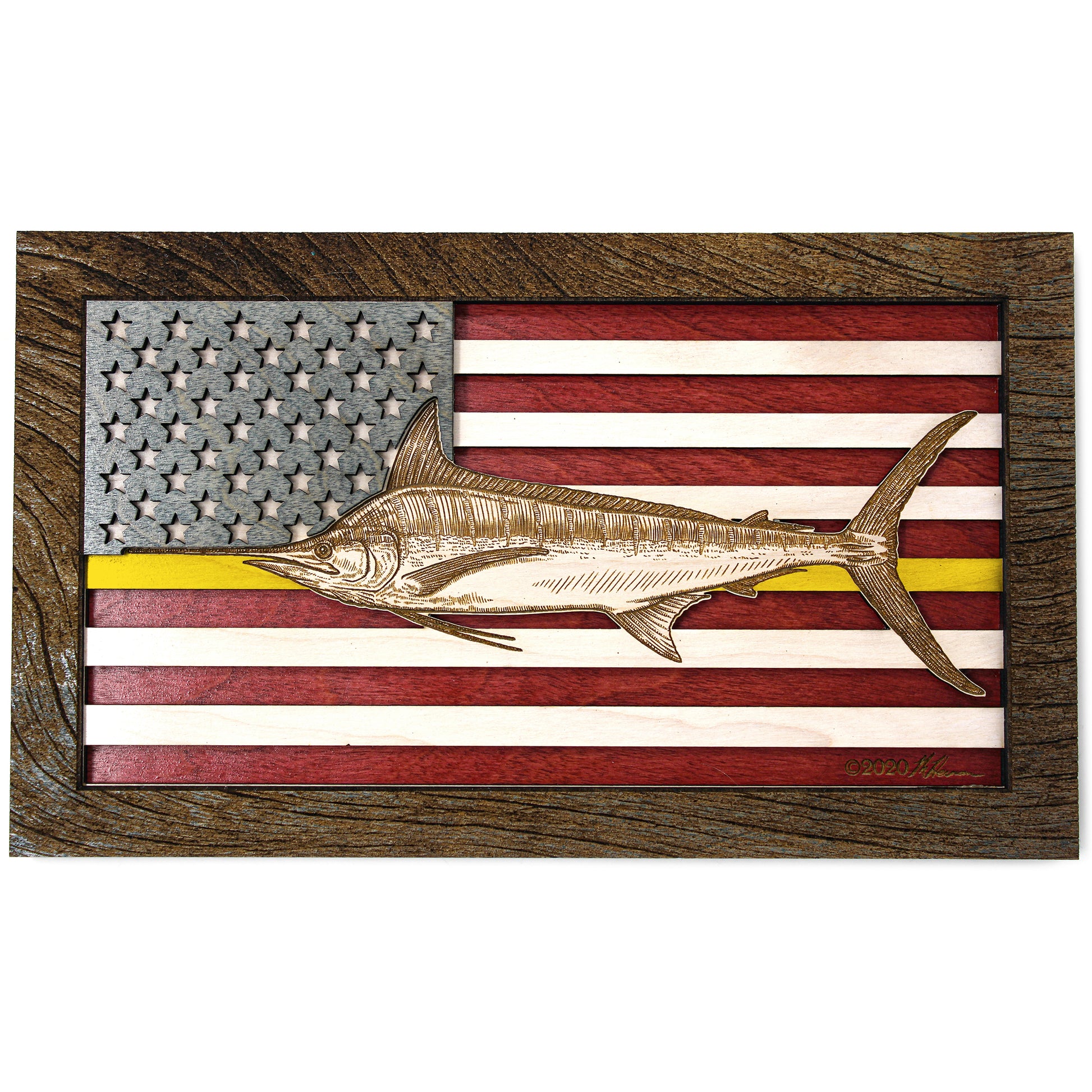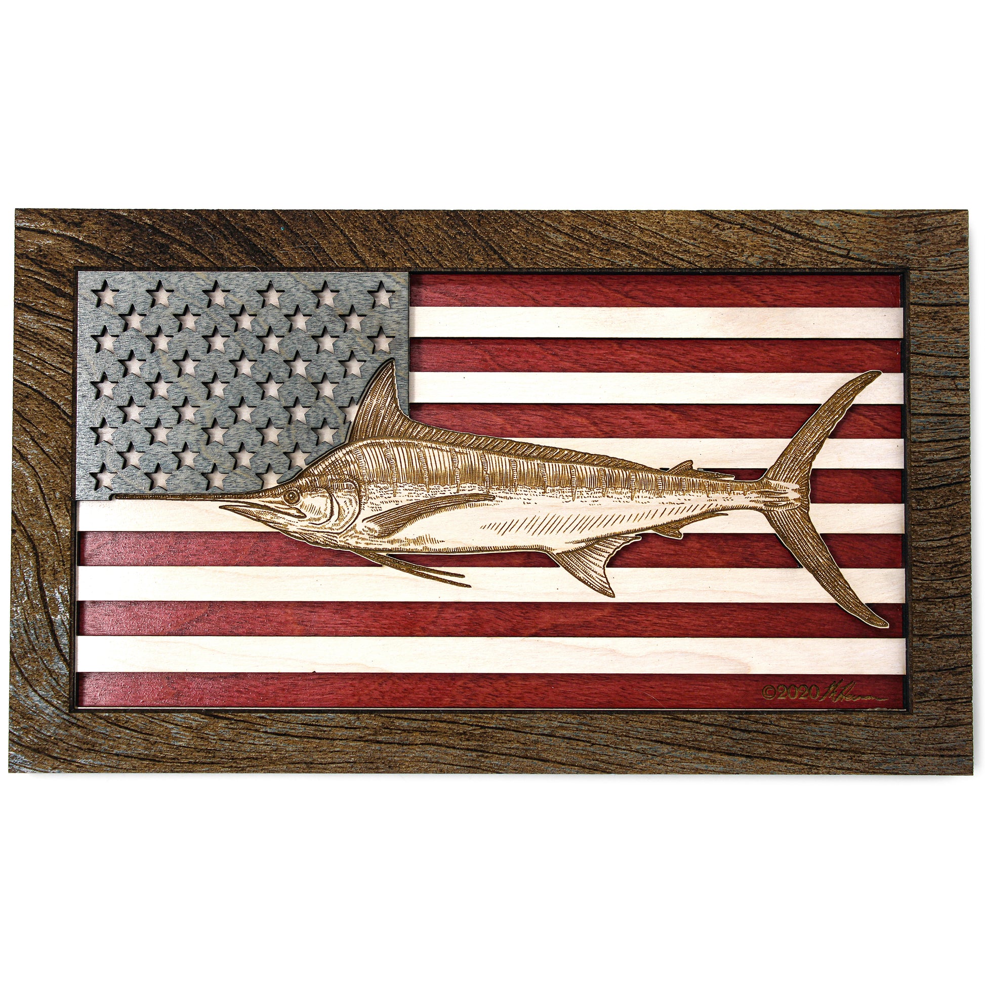 This custom crafted 3D wood wall art decor was created using one of Matt Herman’s illustrated scientific study interpretations of a Blue Marlin as the focal point with the American Flag as the backdrop. The art is then programmed using intricate laser engraving processes to ensure high quality detail. The heavily distressed driftwood border frame was custom made for this series. Each piece is designed with 3 layers of birch veneer wood showing hand stained colors of barn red, washed white and weathered grey shades making each one unique in its own way. Proudly made in Tallahassee, FL. USA