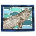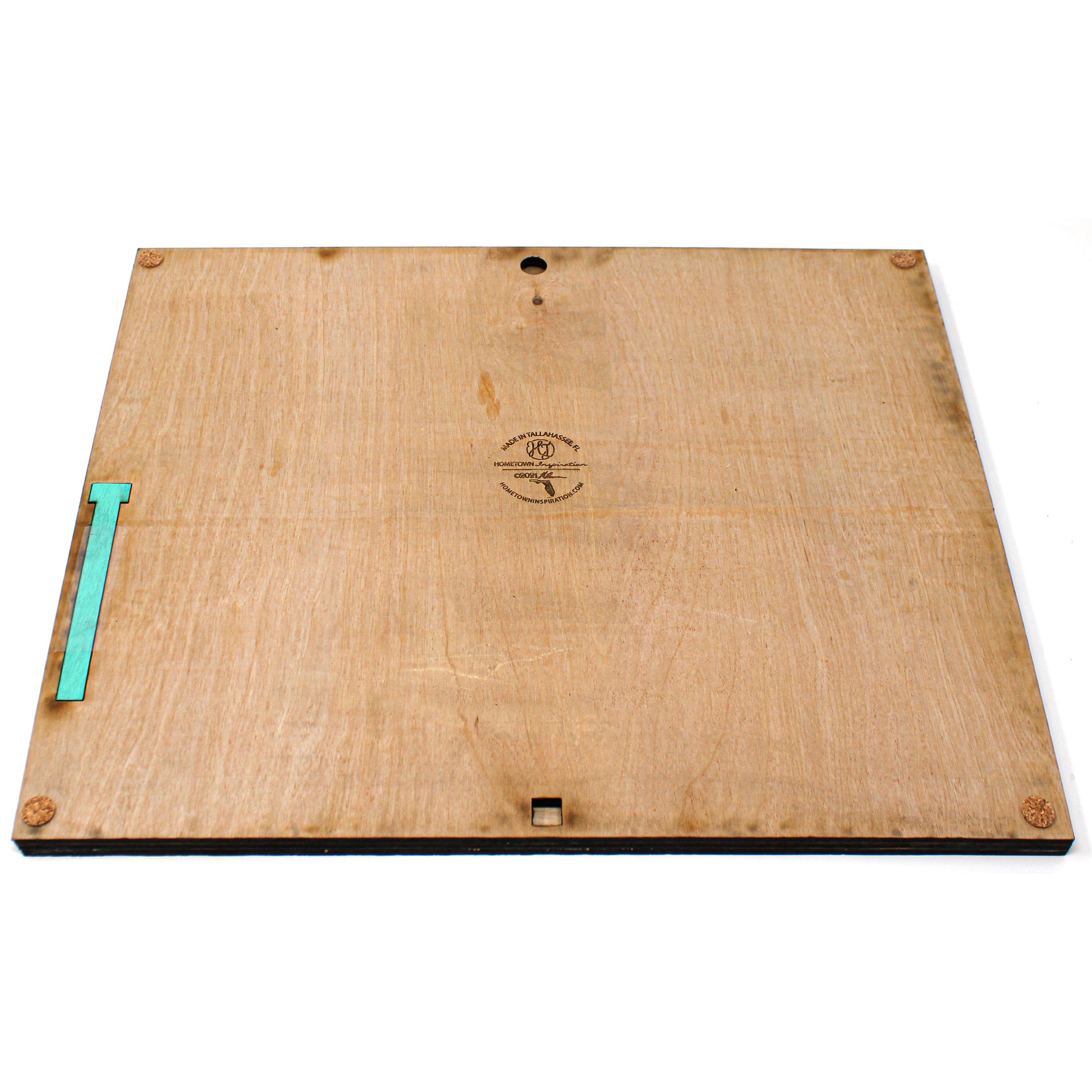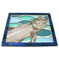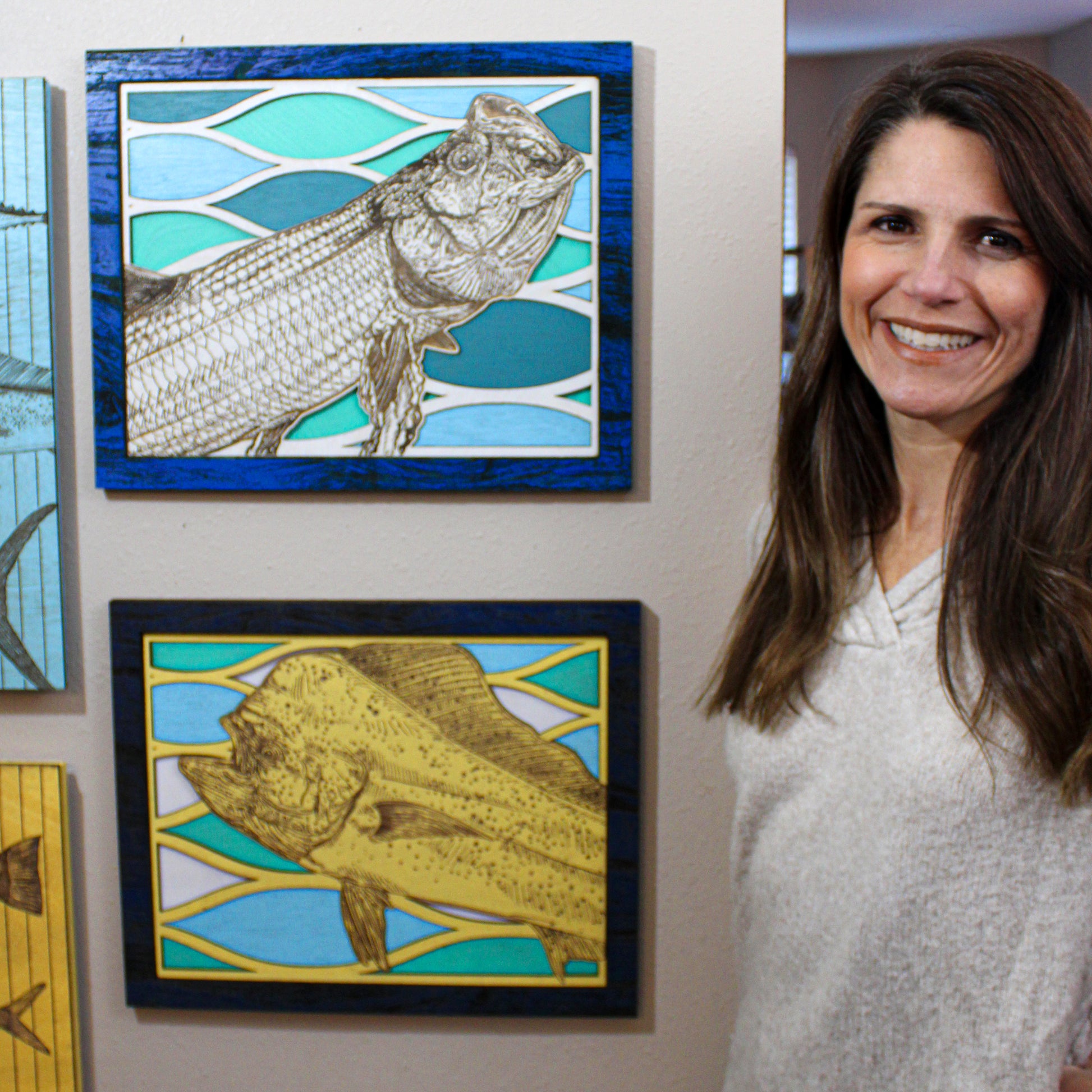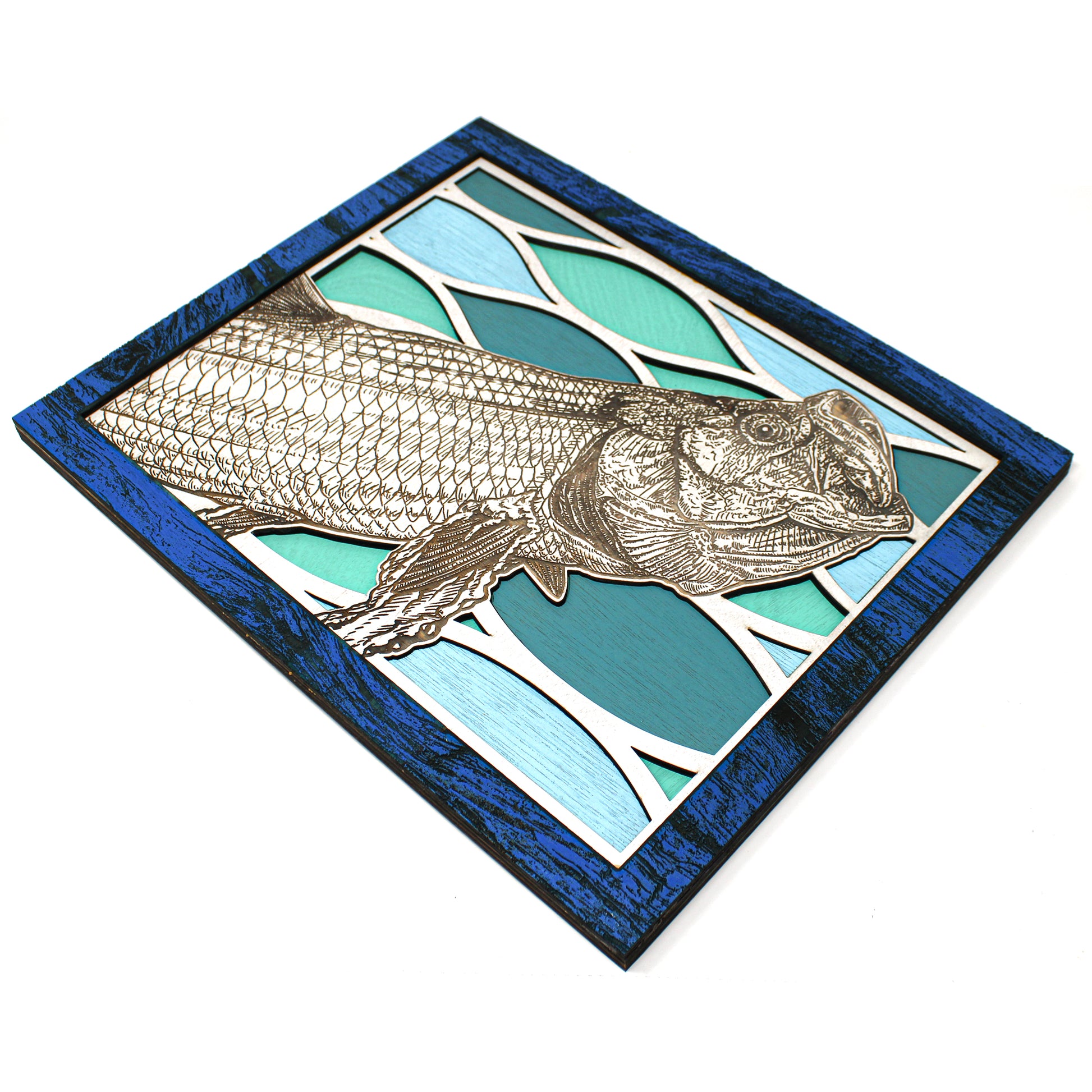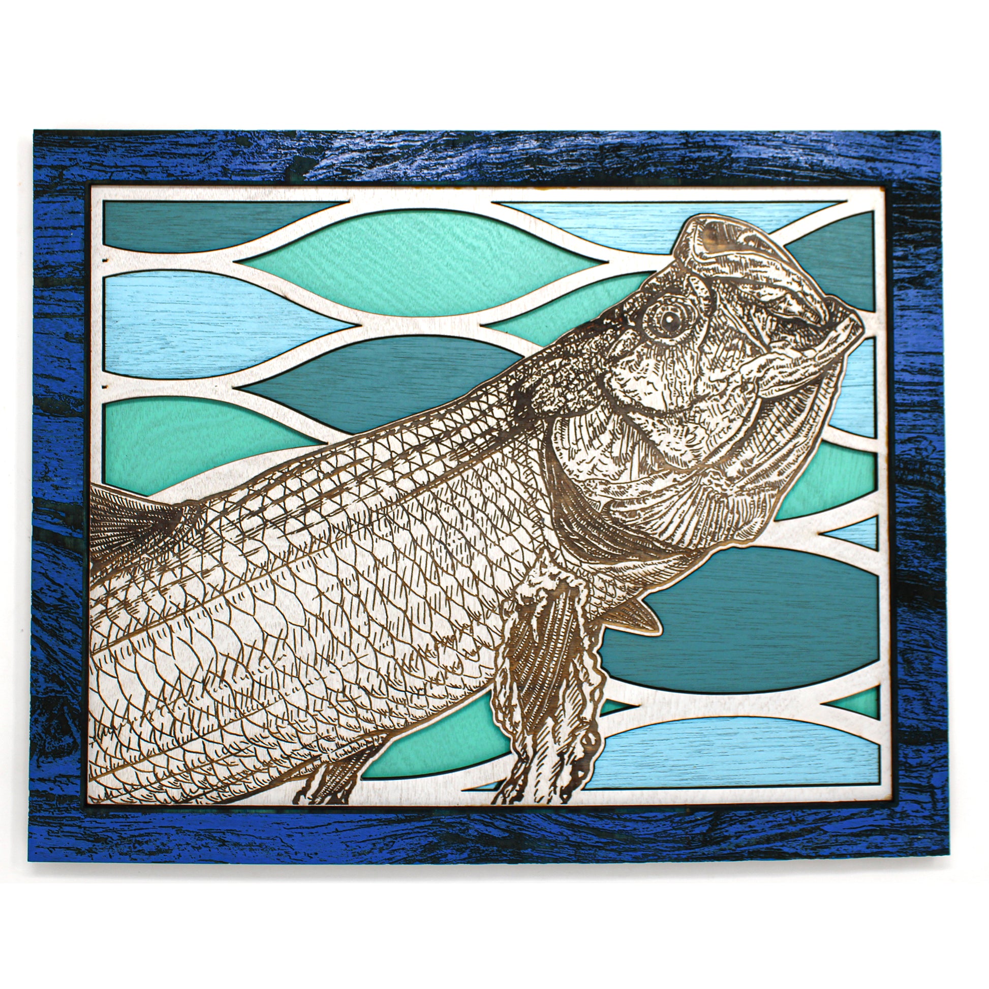 This custom crafted wood 3D wall art shows a Tarpon reaching out for it's next bite through the beautiful colorful reflections of the ocean waters with rays of sunshine beaming through. Created using one of Matt Herman's original illustrations as the focal point. Designed with 3 layers of colored birch with separate thinner layers of cut wood with colors speckled through out making your eyes dance through out the image. Custom design driftwood texture for the border. Perfect part of any beach house decor collection. Proudly made in Tallahassee, FL. USA.