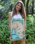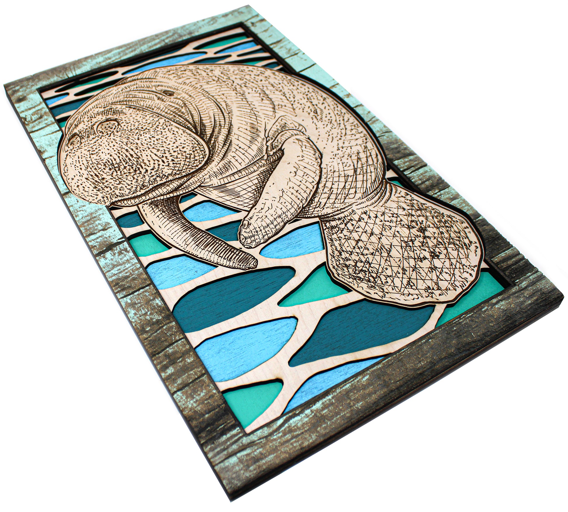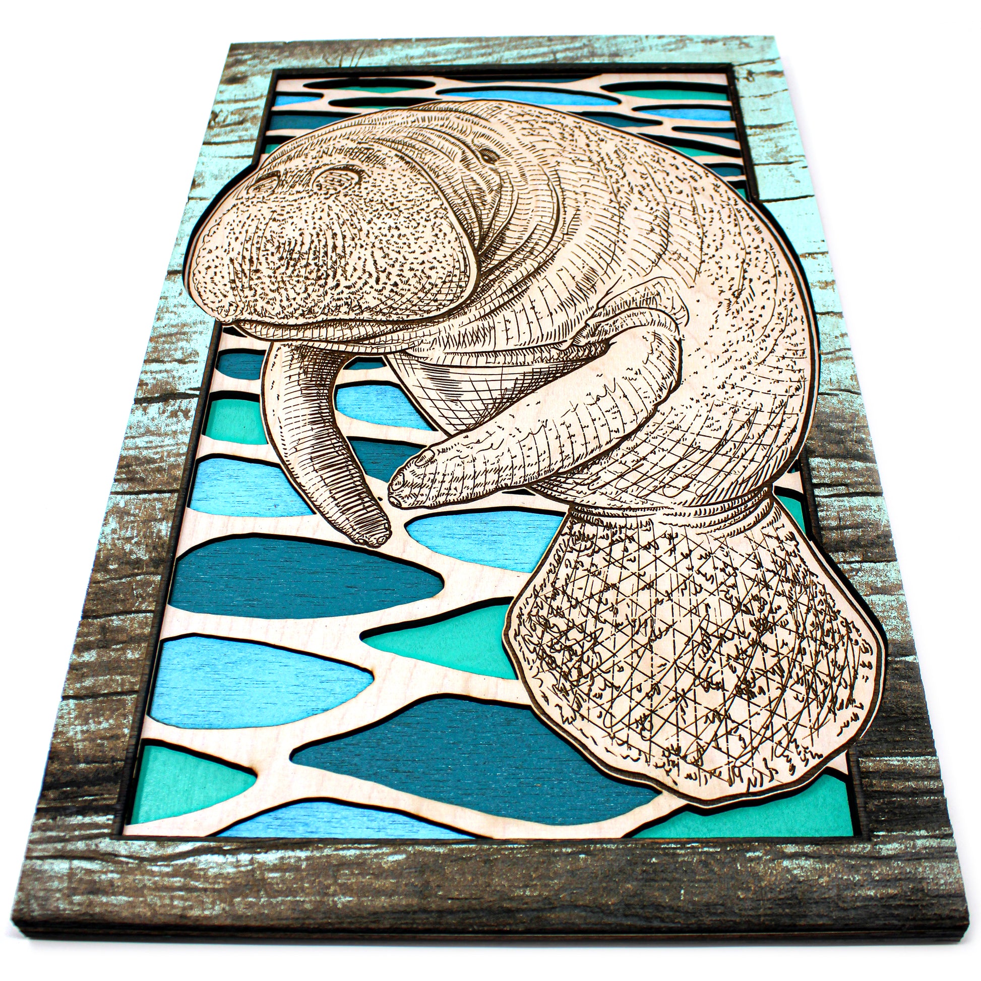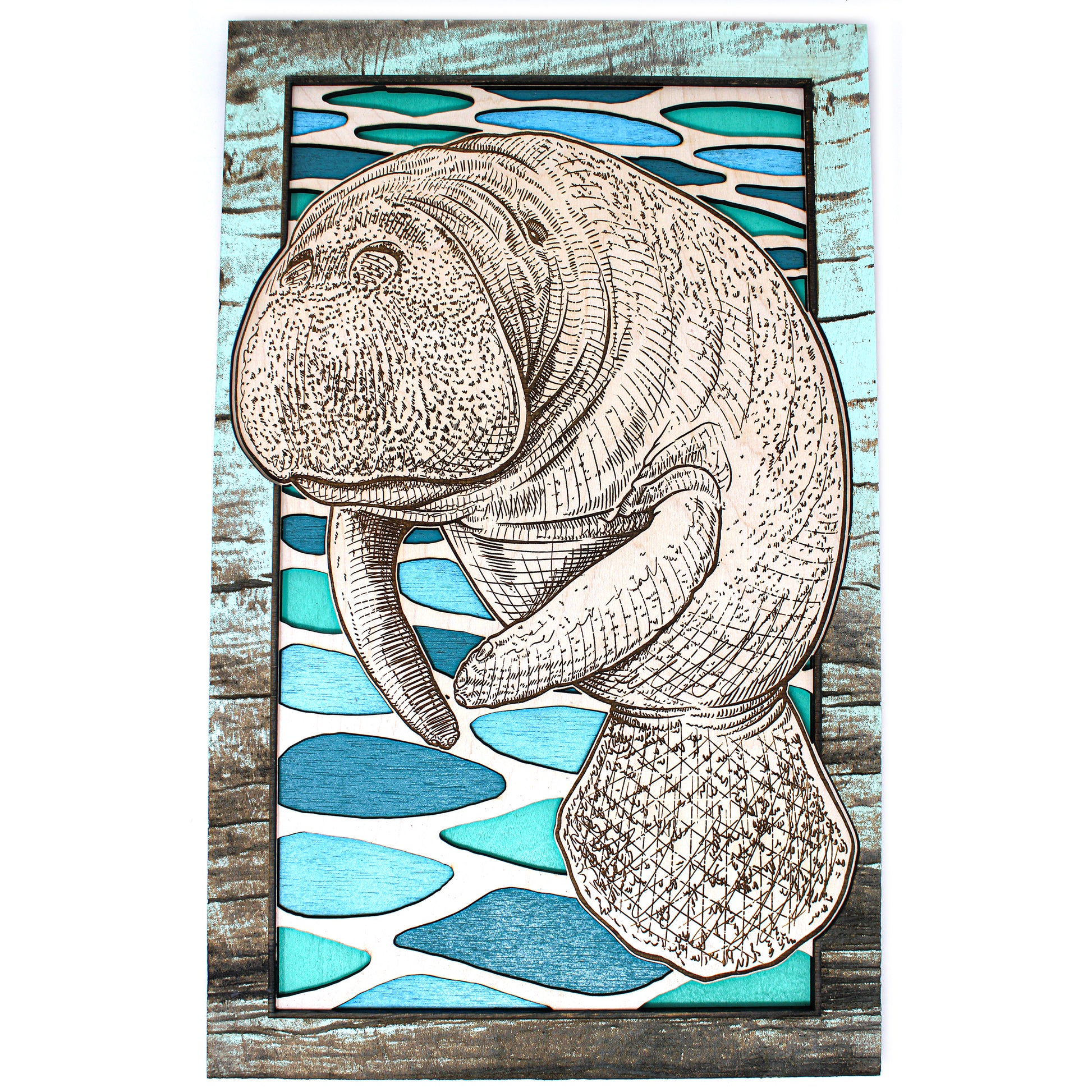 This custom crafted wood 3D wall art shows a Manatee flowing through the beautiful colorful waters of the ocean. Created using one of Matt Herman's original illustrations as the focal point. Designed with 3 layers of birch showing stain color of white and paint colors of sea foam and chalky mint. With separate thinner layers of cut wood with colors of ice blue and sea green speckled through out making your eyes dance through out the image. Custom design driftwood texture for the border. Perfect part of any beach house decor collection. Proudly made in Tallahassee, FL. USA.