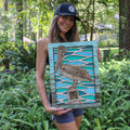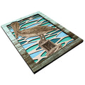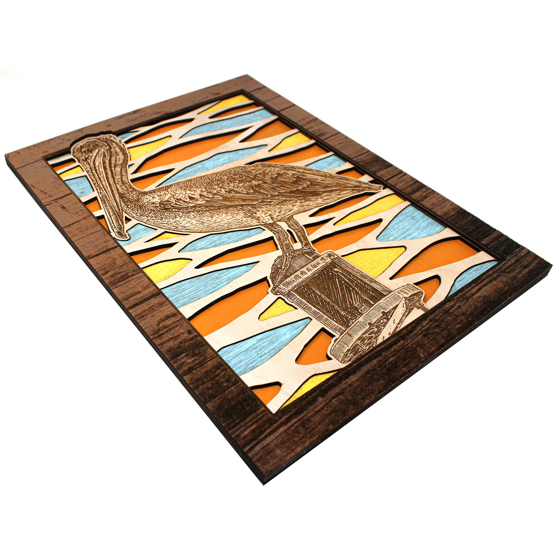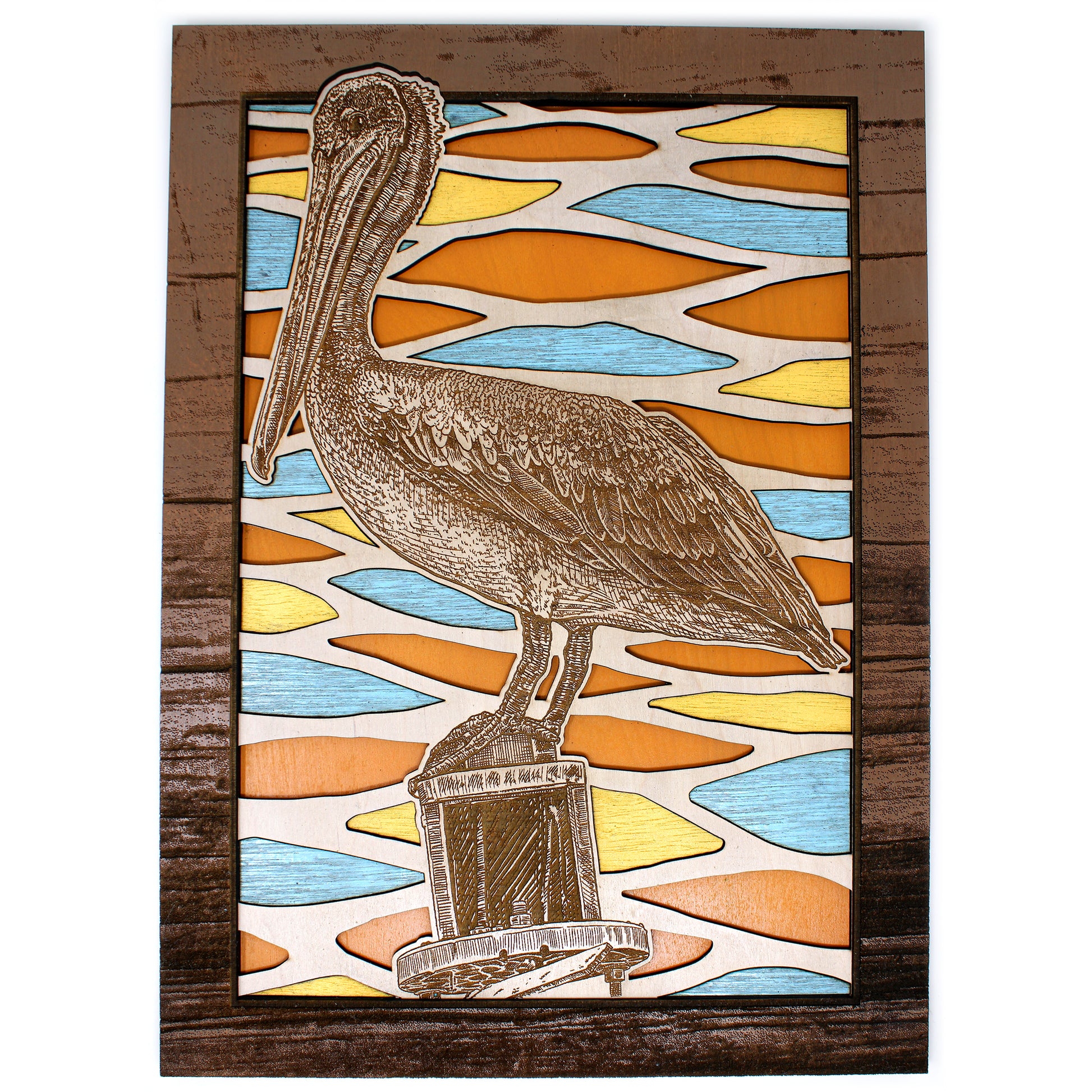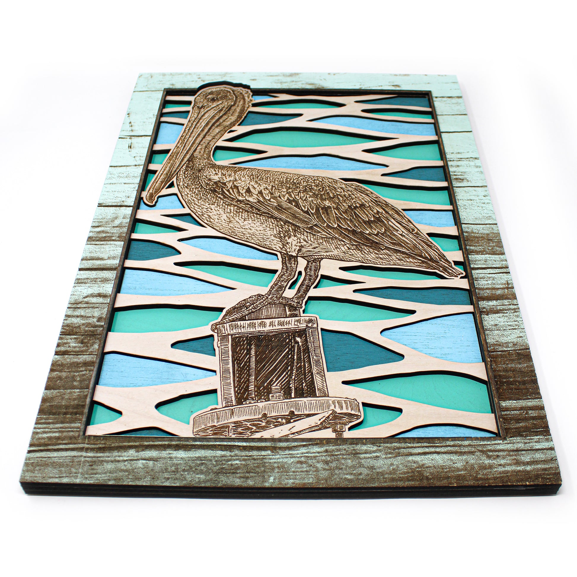 This custom crafted wood 3D wall art shows a Pelican Perched on a channel marker with the beautiful colorful waters of the ocean reflecting in the background. Created using one of Matt Herman's original illustrations as the focal point. Designed with 3 layers of colored birch with separate thinner layers of cut wood with colors speckled through out making your eyes dance through out the image. Custom design driftwood texture for the border. Perfect part of any beach house decor collection. Proudly made in Tallahassee, FL. USA.