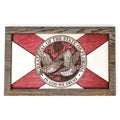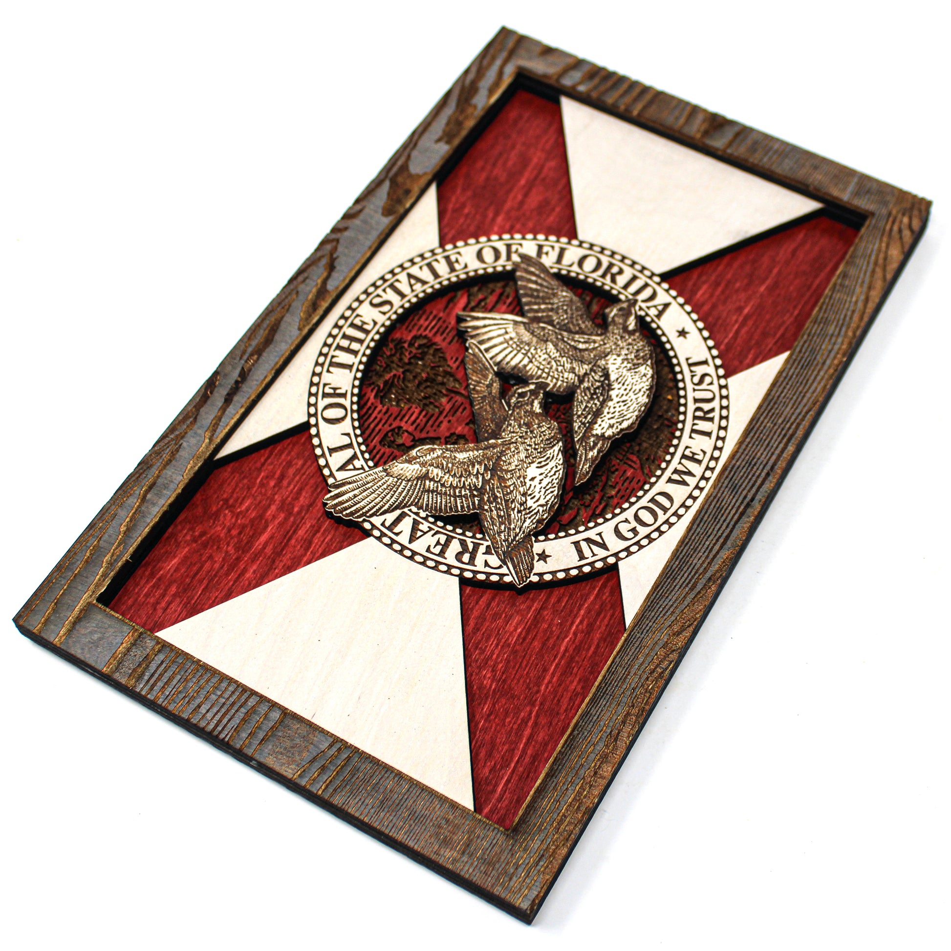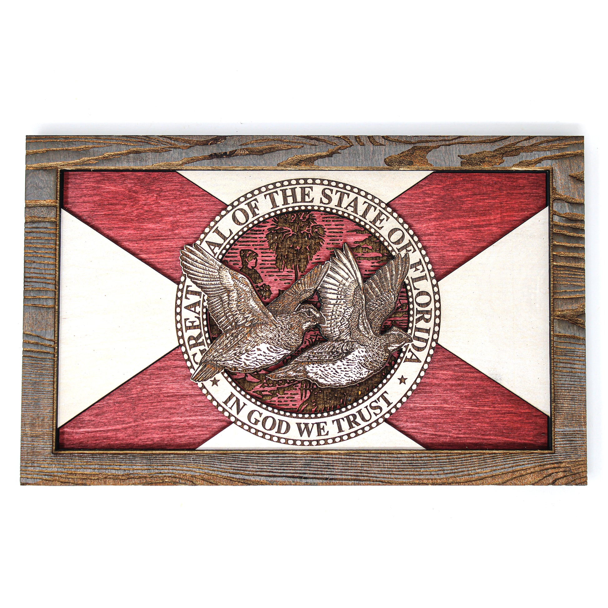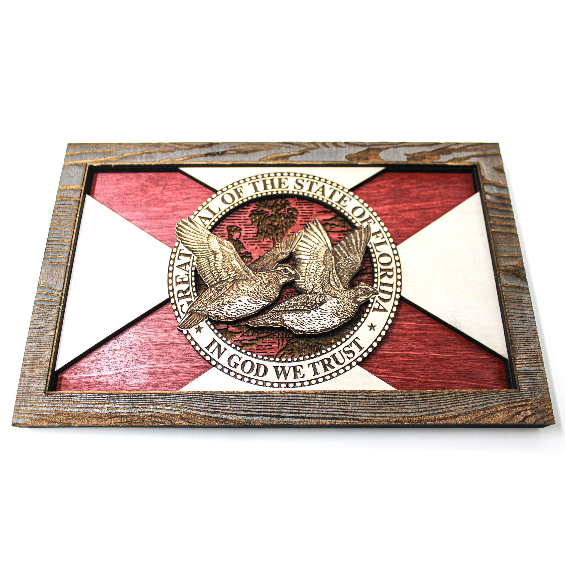 This custom crafted 3D wood wall art decor was created using one of Matt Herman’s illustrated flying Quail as the focal point with the Florida Flag as the backdrop. The art is then programmed using intricate laser engraving processes to ensure high quality detail. The heavily distressed wooden border frame was custom made for this series. Each piece is designed with 3 layers of birch veneer wood showing hand stained colors of barn red, washed white and weathered grey shades making each one unique in its own way. Proudly made in Tallahassee, FL. USA