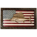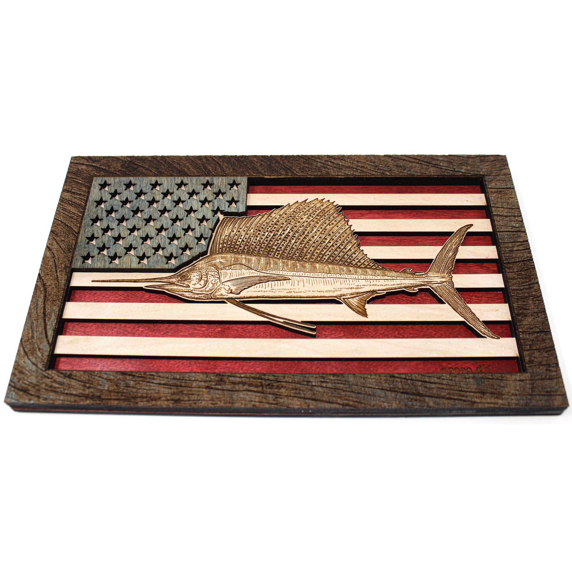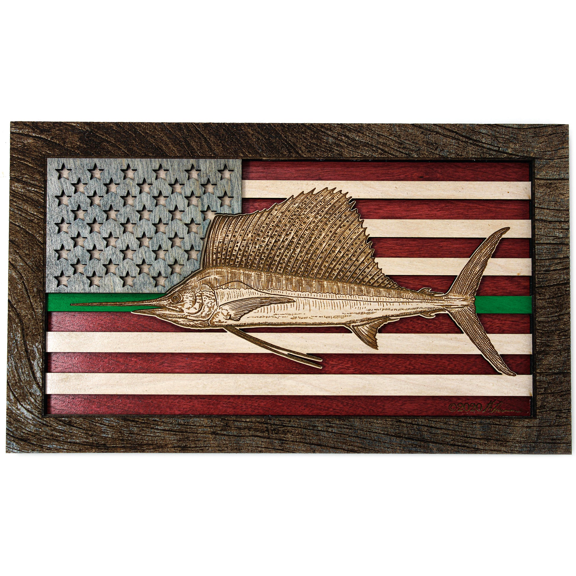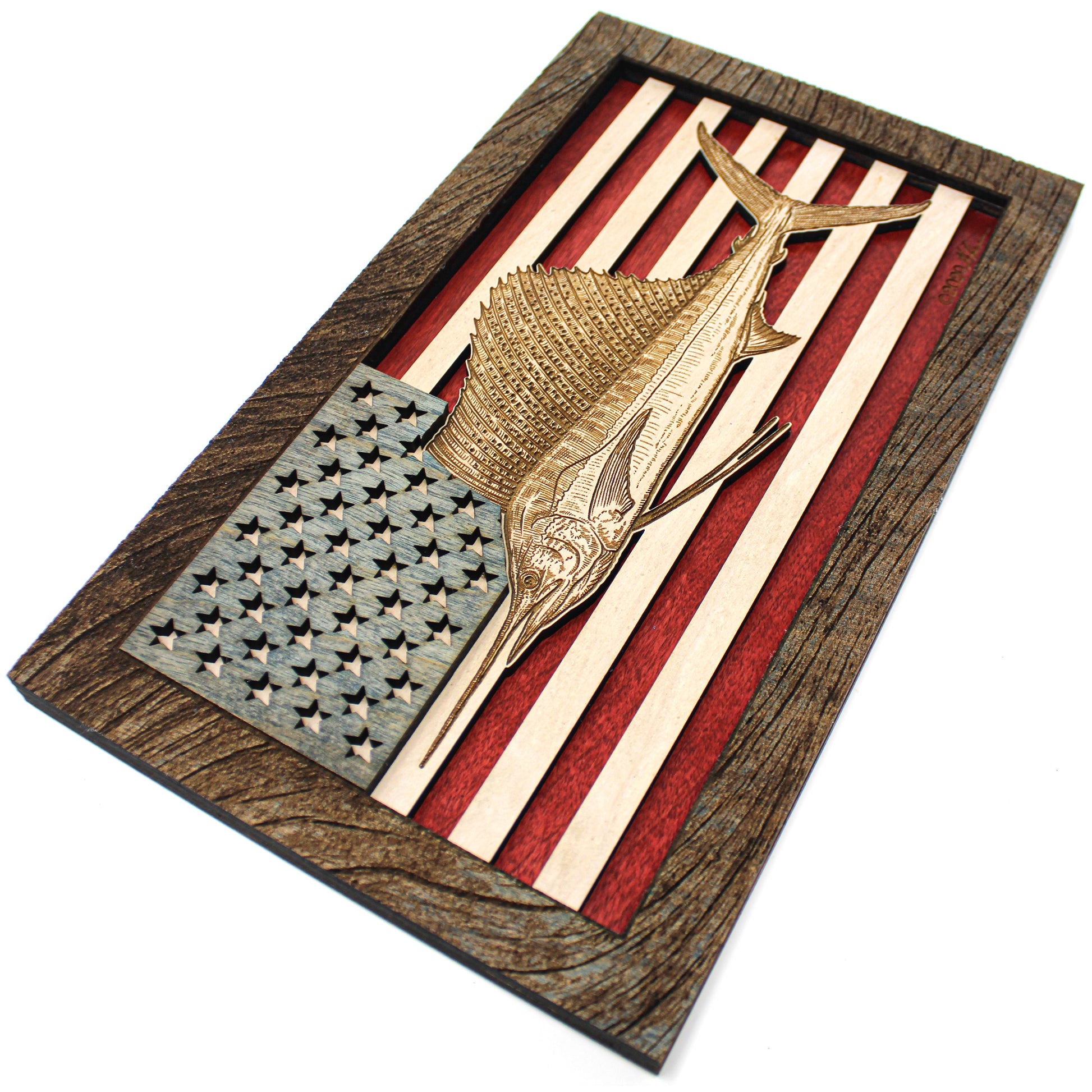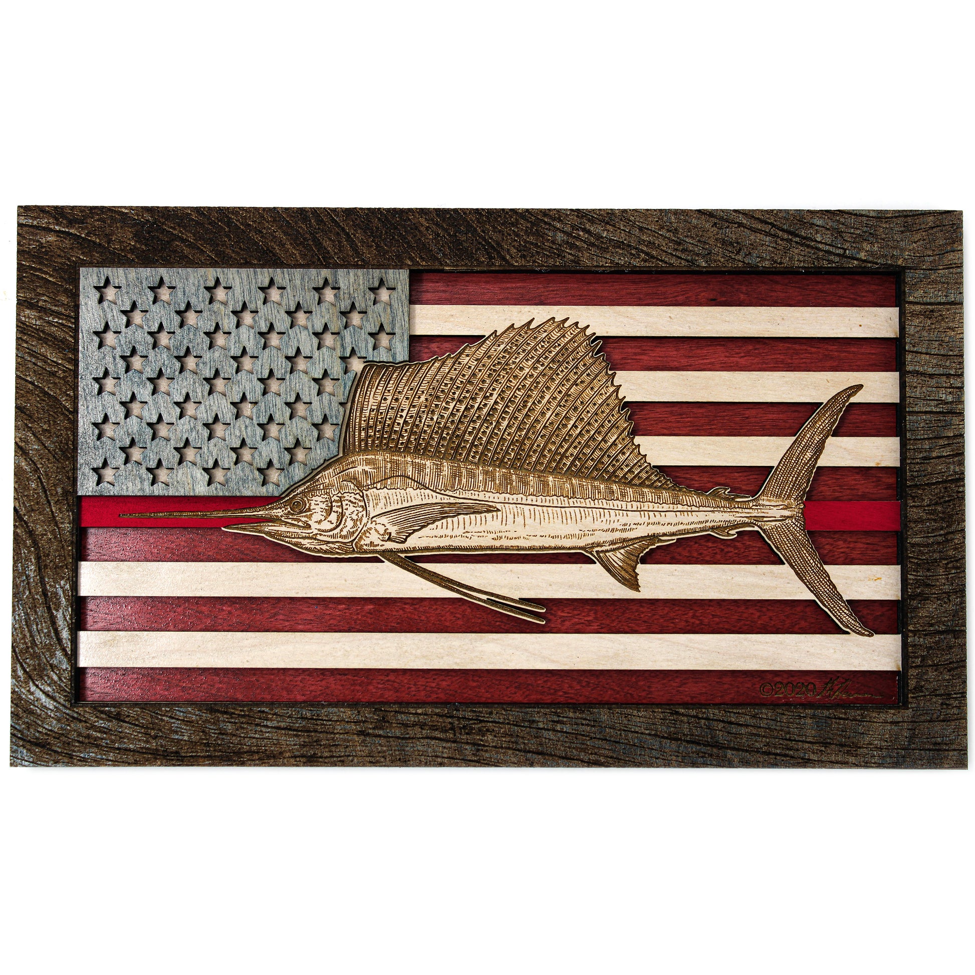 This custom crafted 3D wood wall art decor was created using one of Matt Herman’s illustrated scientific study interpretations of a Sailfish as the focal point with the American Flag as the backdrop. The art is then programmed using intricate laser engraving processes to ensure high quality detail. The heavily distressed driftwood border frame was custom made for this series. Each piece is designed with 3 layers of birch veneer wood showing hand stained colors of barn red, washed white and weathered grey shades making each one unique in its own way. Proudly made in Tallahassee, FL. USA