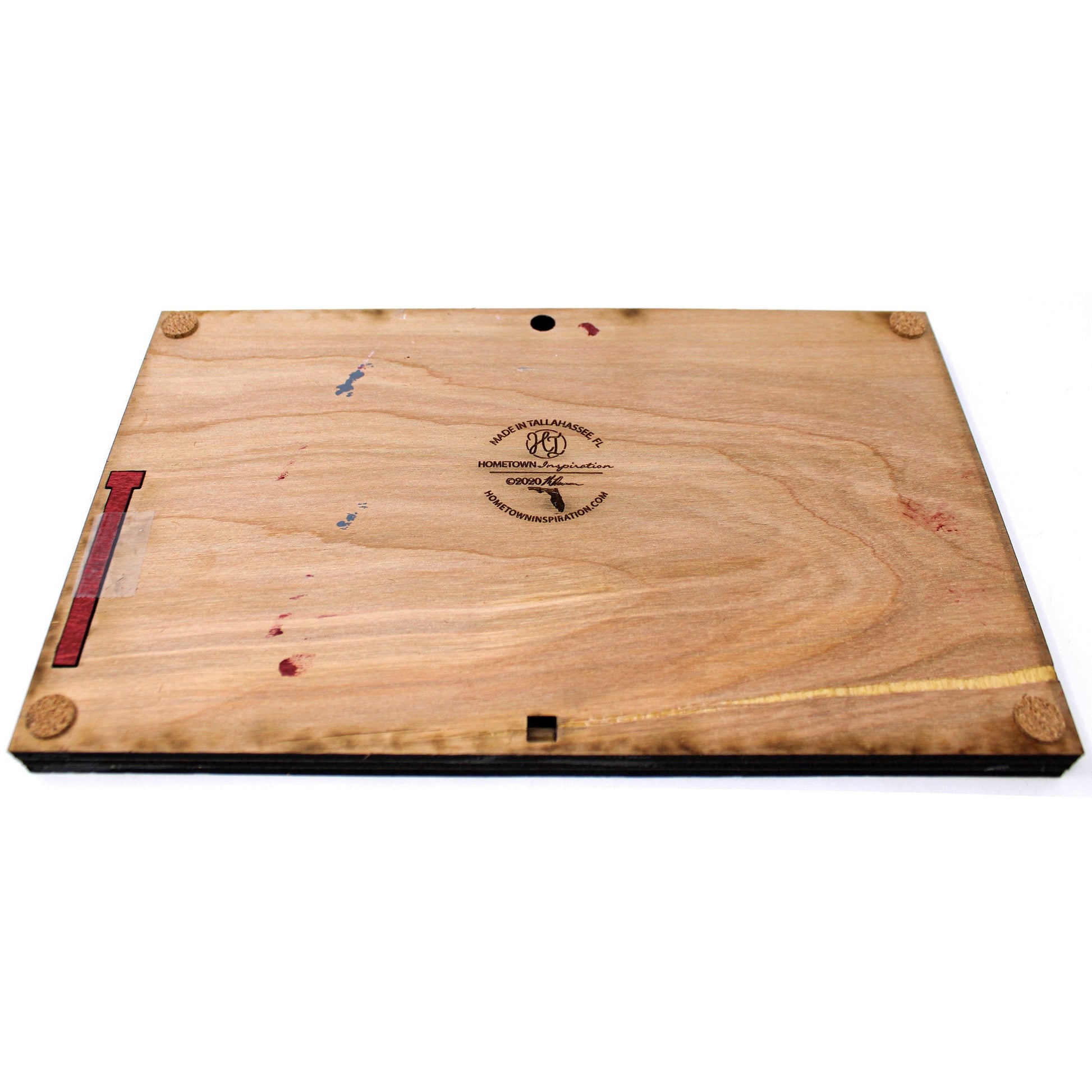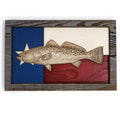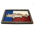 This custom crafted 3D wood wall art decor was created using one of Matt Herman’s illustrated scientific study interpretations of a Speckled Sea Trout as the focal point with the Texas Flag as the backdrop. The art is then programmed using intricate laser engraving processes to ensure high quality detail. The heavily distressed wooden border frame was custom made for this series. Each piece is designed with 3 layers of birch veneer wood showing hand stained colors of barn red, washed white and weathered grey shades making each one unique in its own way. Proudly made in Tallahassee, FL. USA