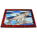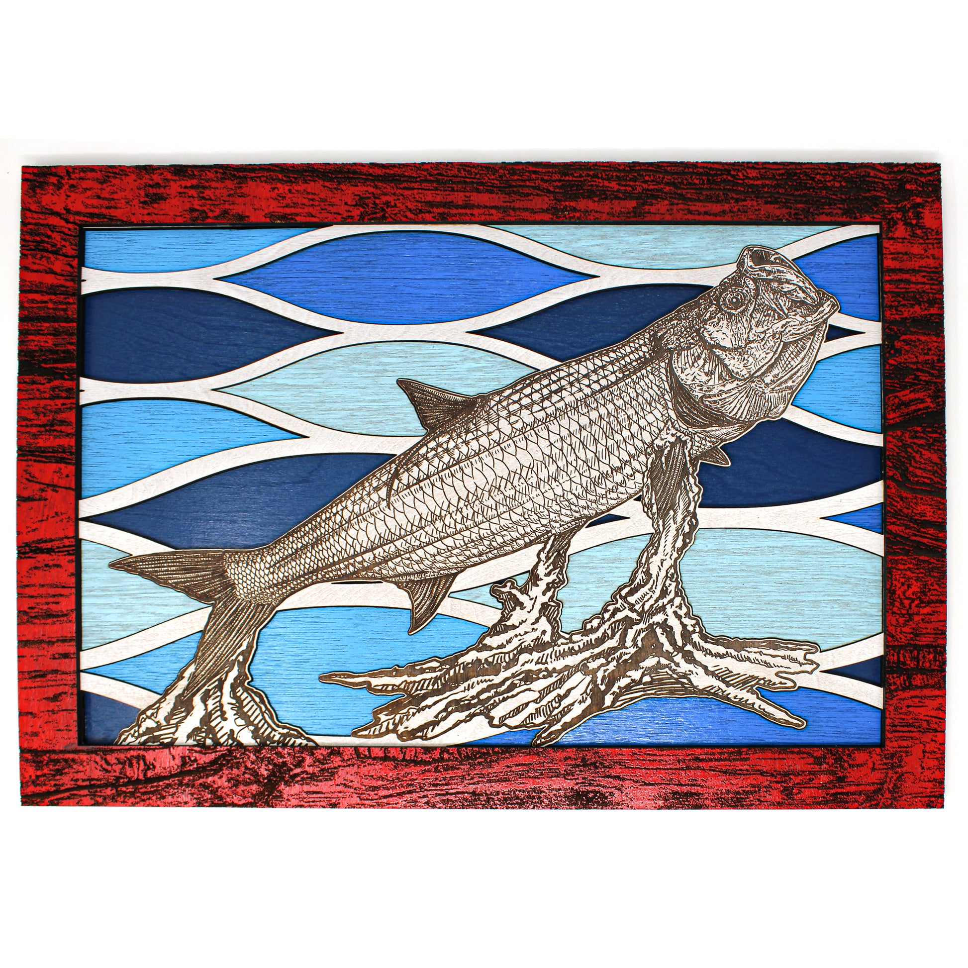 This custom crafted wood 3D wall art shows a Tarpon jumping out of the water successfully shaking that hook through the beautiful colorful reflections of the ocean waters with rays of sunshine beaming through. Created using one of Matt Herman's original illustrations as the focal point. Designed with 3 layers of colored birch with separate thinner layers of cut wood with colors speckled through out making your eyes dance through out the image. Custom design driftwood texture for the border. Perfect part of any beach house decor collection. Proudly made in Tallahassee, FL. USA.