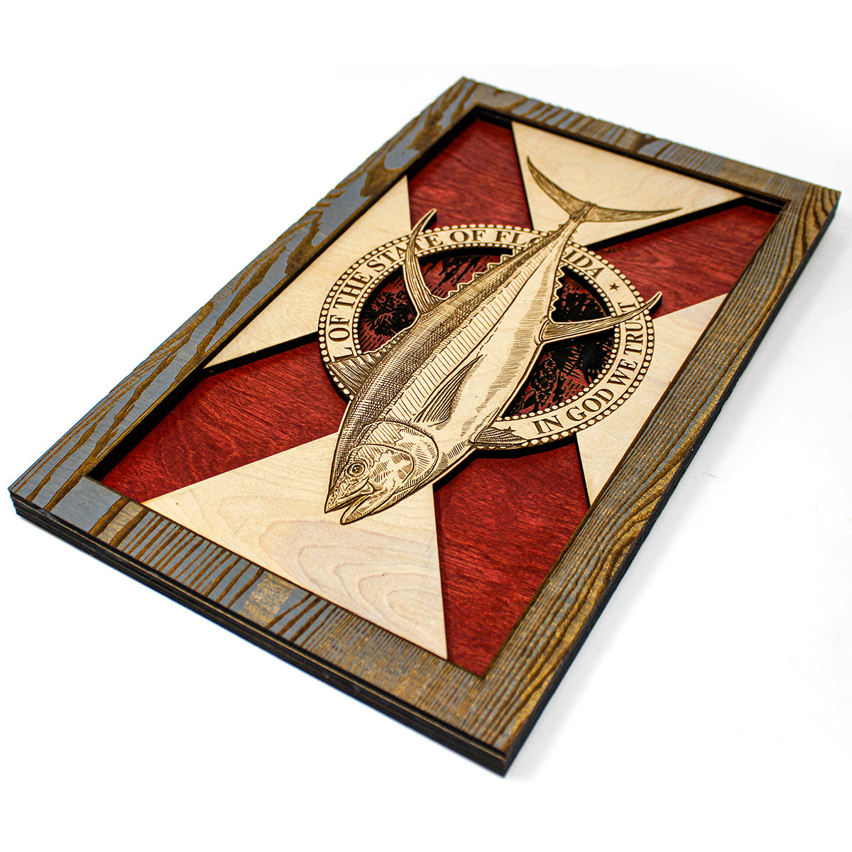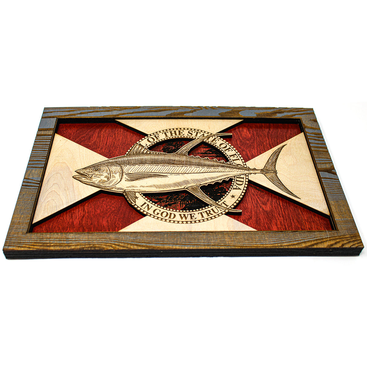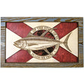 This custom crafted 3D wood wall art decor was created using one of Matt Herman’s illustrated scientific study interpretations of a Yellowfin Tuna as the focal point with the Florida Flag as the backdrop. The art is then programmed using intricate laser engraving processes to ensure high quality detail. The heavily distressed wooden border frame was custom made for this series. Each piece is designed with 3 layers of birch veneer wood showing hand stained colors of barn red, washed white and weathered grey shades making each one unique in its own way. Proudly made in Tallahassee, FL. USA