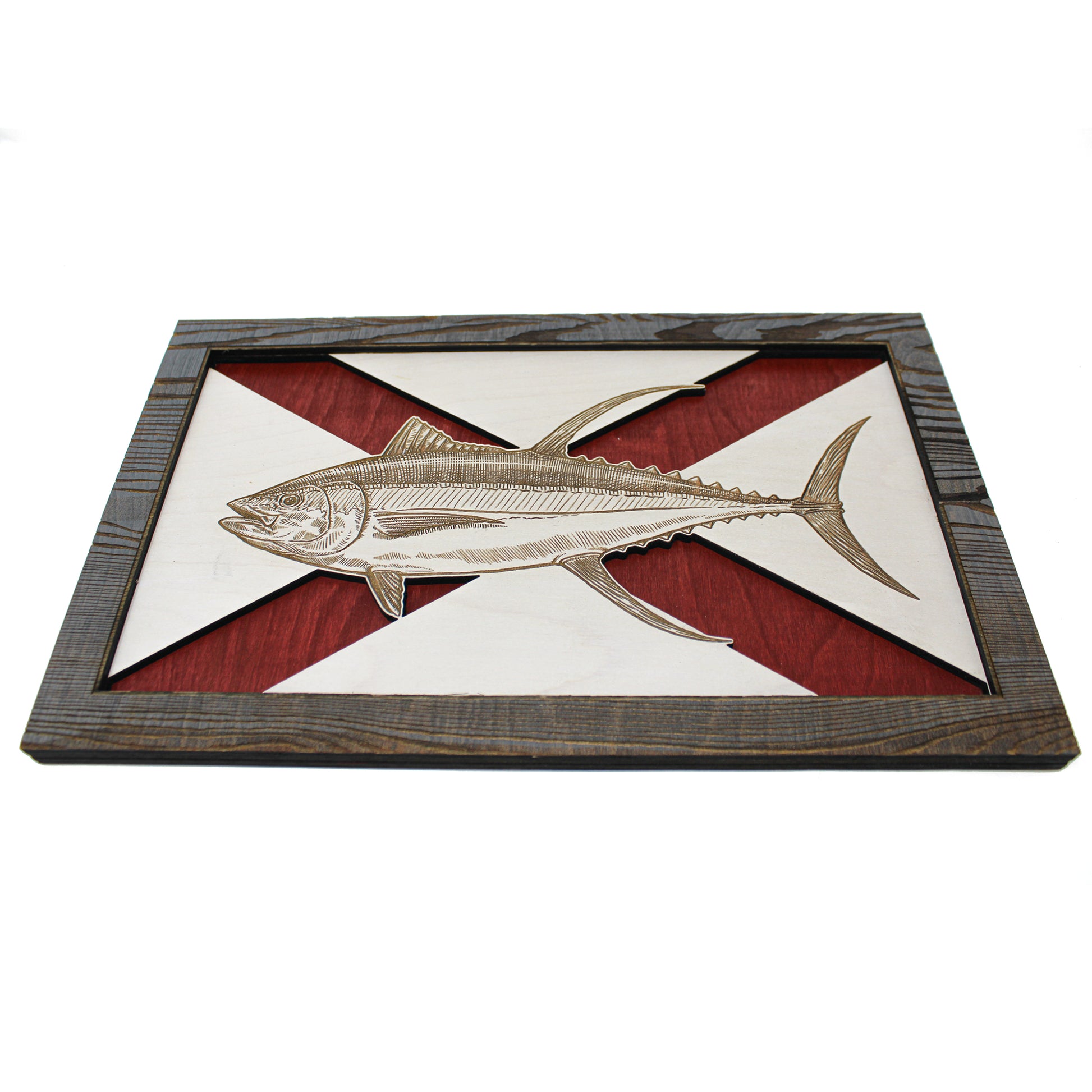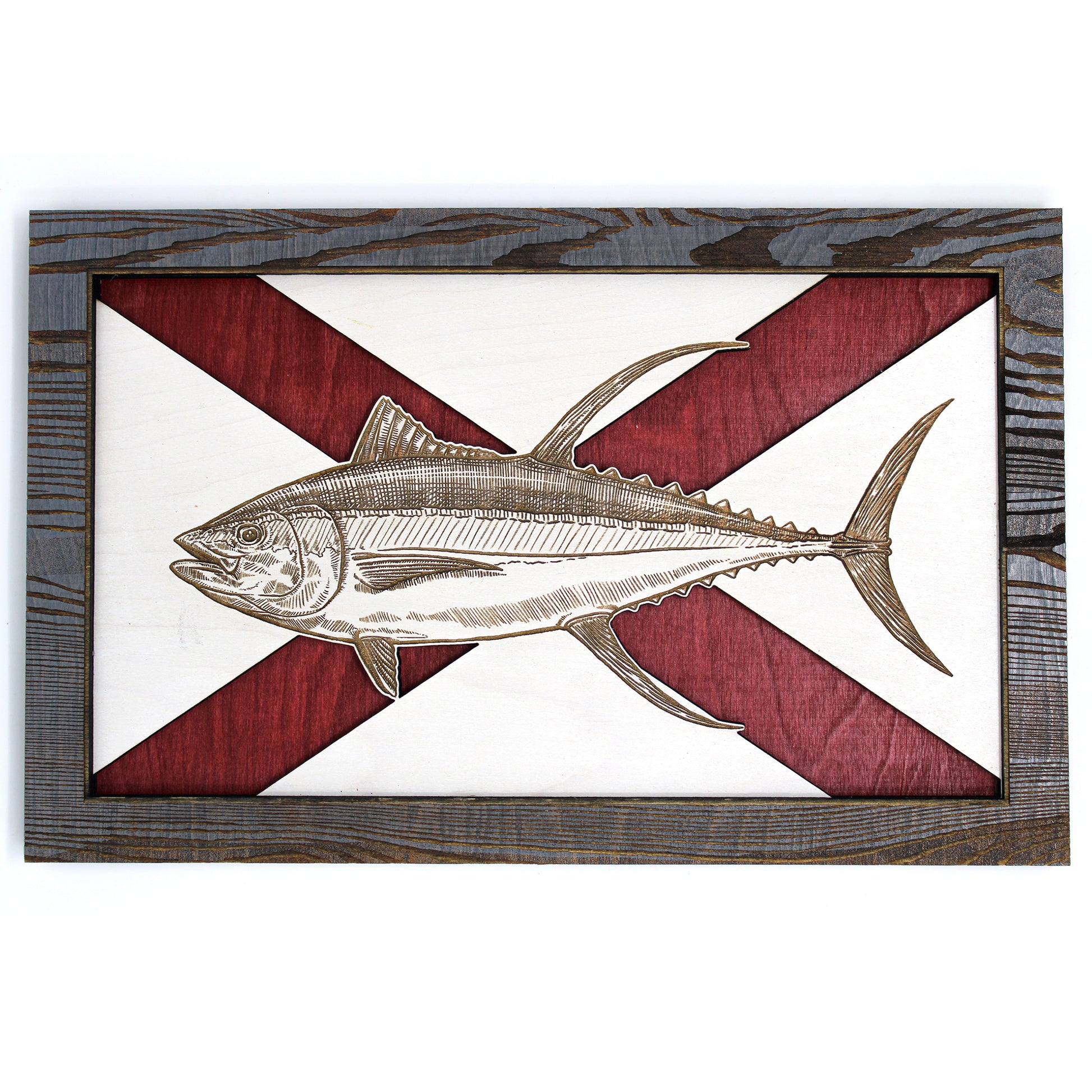 This custom crafted 3D wood wall art decor was created using one of Matt Herman’s illustrated scientific study interpretations of a Yellowfin Tuna as the focal point with the Alabama Flag as the backdrop. The art is then programmed using intricate laser engraving processes to ensure high quality detail. The heavily distressed wooden border frame was custom made for this series. Each piece is designed with 3 layers of birch veneer wood showing hand stained colors of barn red, washed white and weathered grey shades making each one unique in its own way. Proudly made in Tallahassee, FL. USA