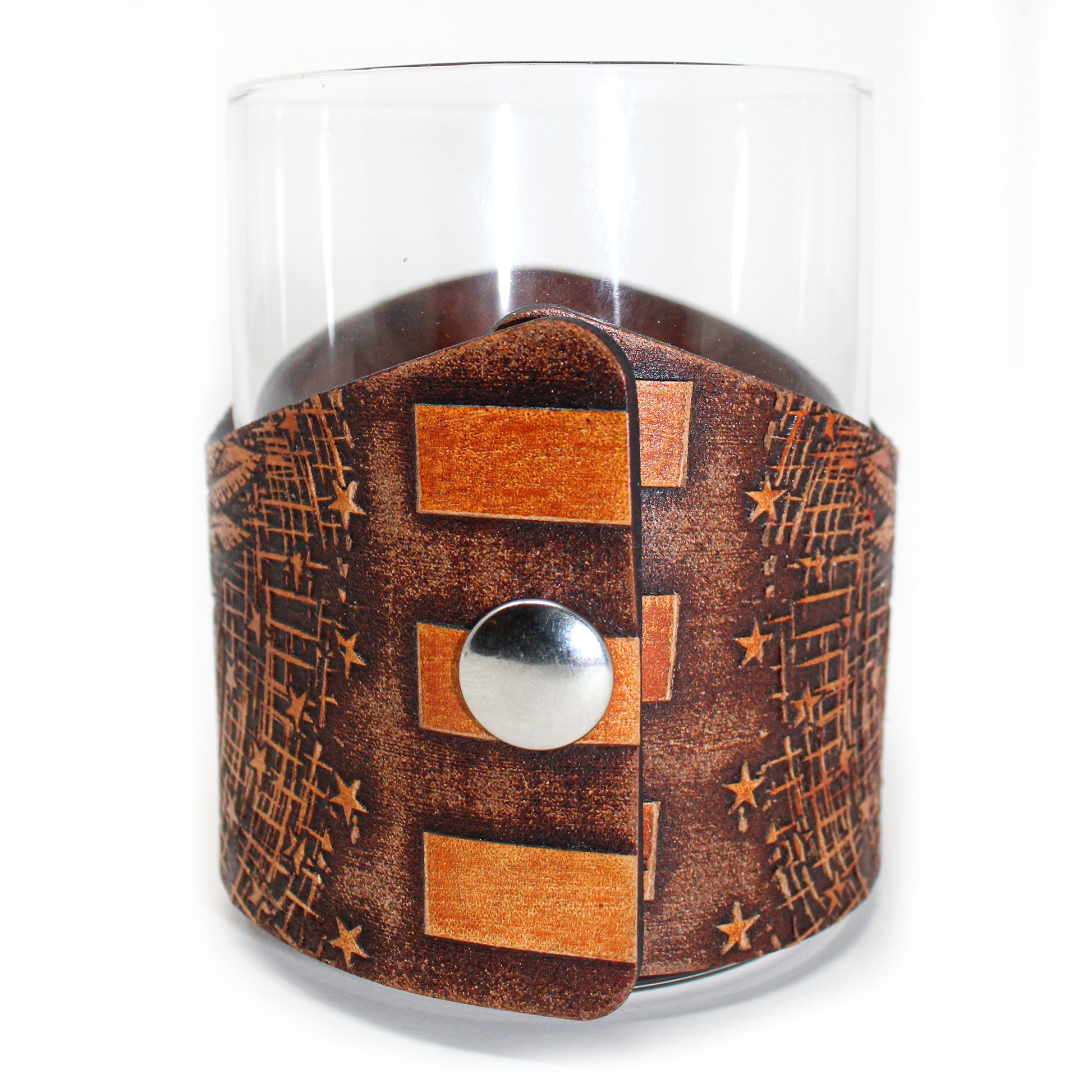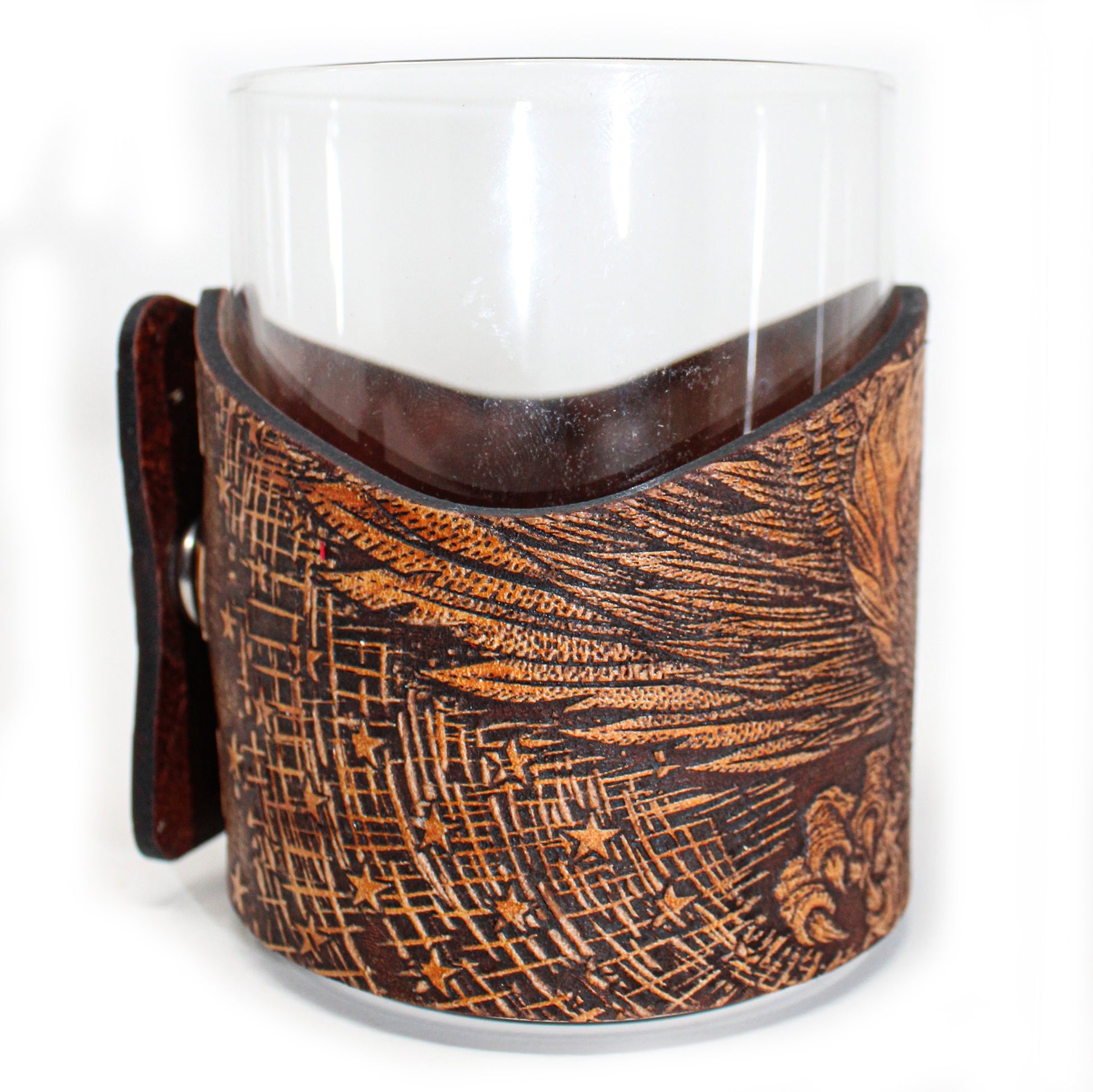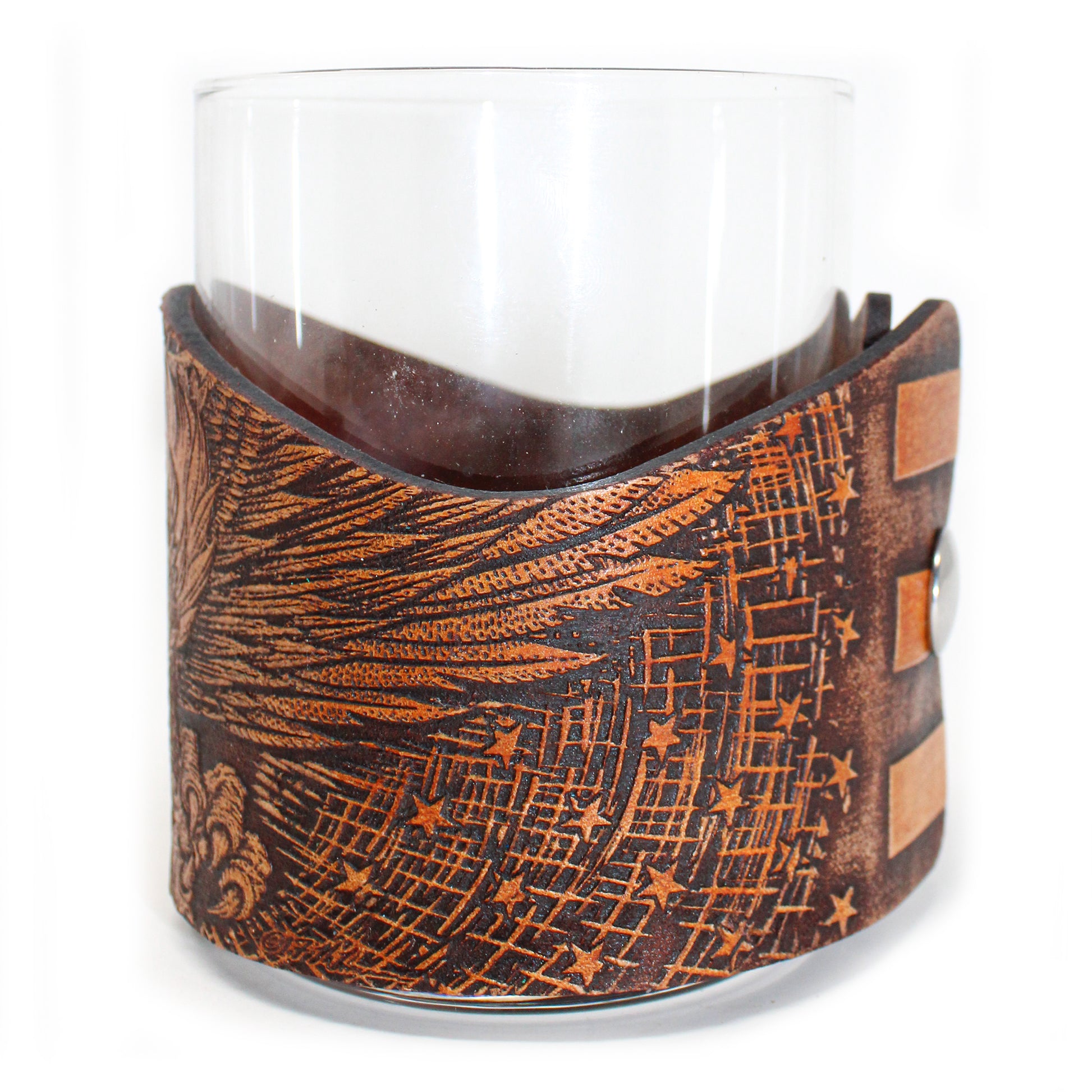 Our Patriotic series consists of a large variety of Americana wraps with 11 oz rocks glasses. This style is decorated with an illustration from Matt Herman having an Eagle diving in for attack. Using thick 7-10 oz leather with precision programed laser engraving and fastened with a sturdy stainless steel marine grade snap. This design concept makes the leather wraps easy to unsnap for cleaning purposes or to simply stow away and change out for another wrap style. All leather is hand stained, hand distressed and hand finished which gives every piece it's own unique look.