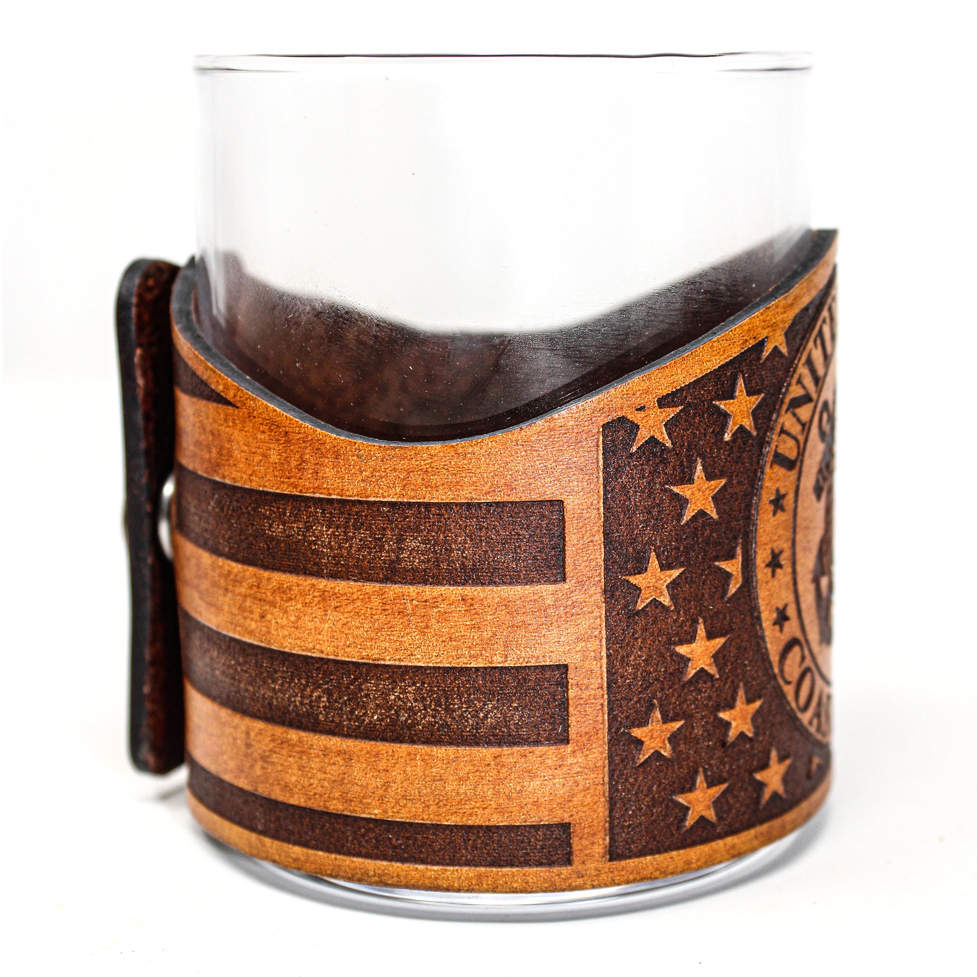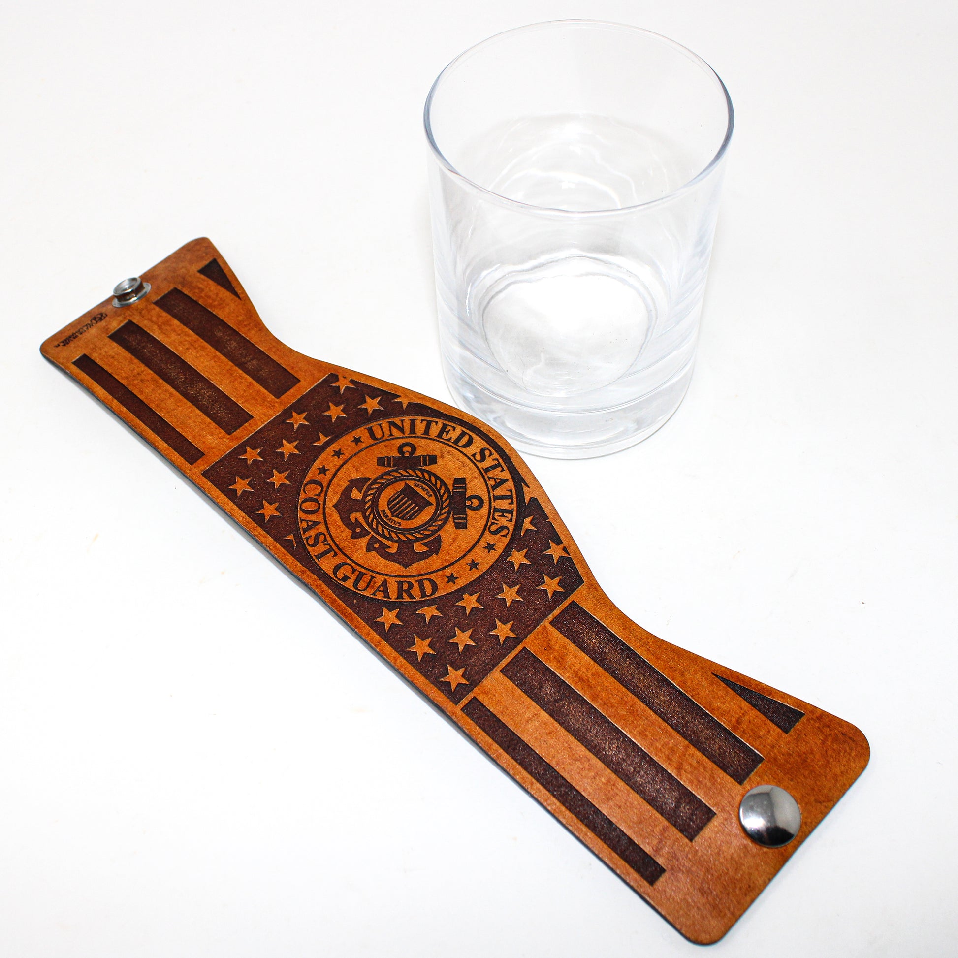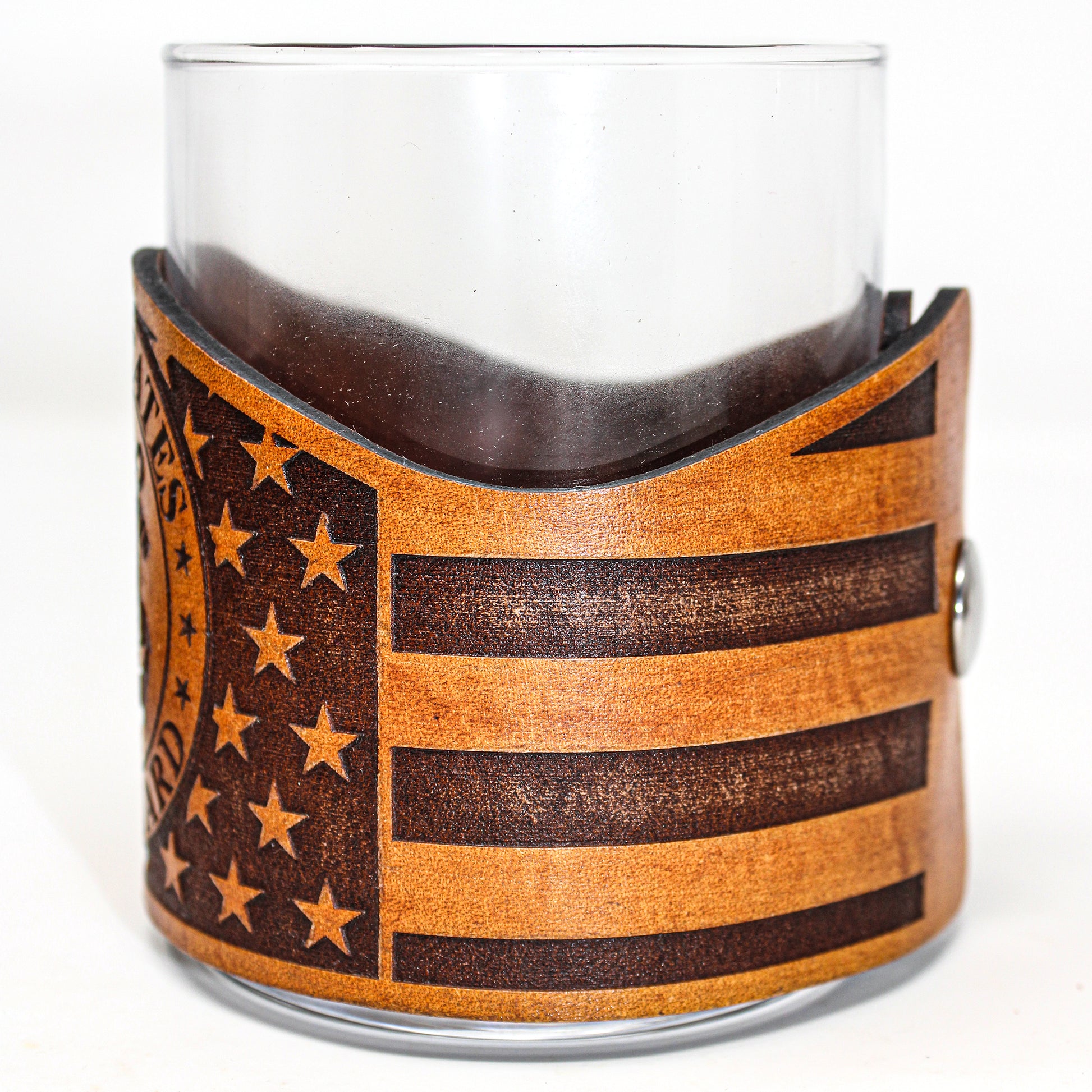Our Military series consists of a large variety of Americana wraps with 11 oz rocks glasses. This style is decorated with COAST GUARD seal placed over the American flag. Using thick 7-10 oz leather with precision programed laser engraving and fastened with a sturdy stainless steel marine grade snap. This design concept makes the leather wraps easy to unsnap for cleaning purposes or to simply stow away and change out for another wrap style. All leather is hand stained, hand distressed and hand finished which gives every piece it's own unique look.