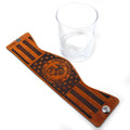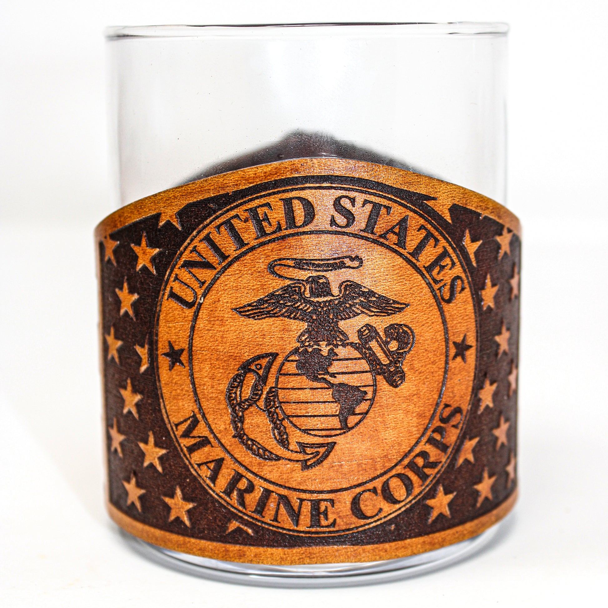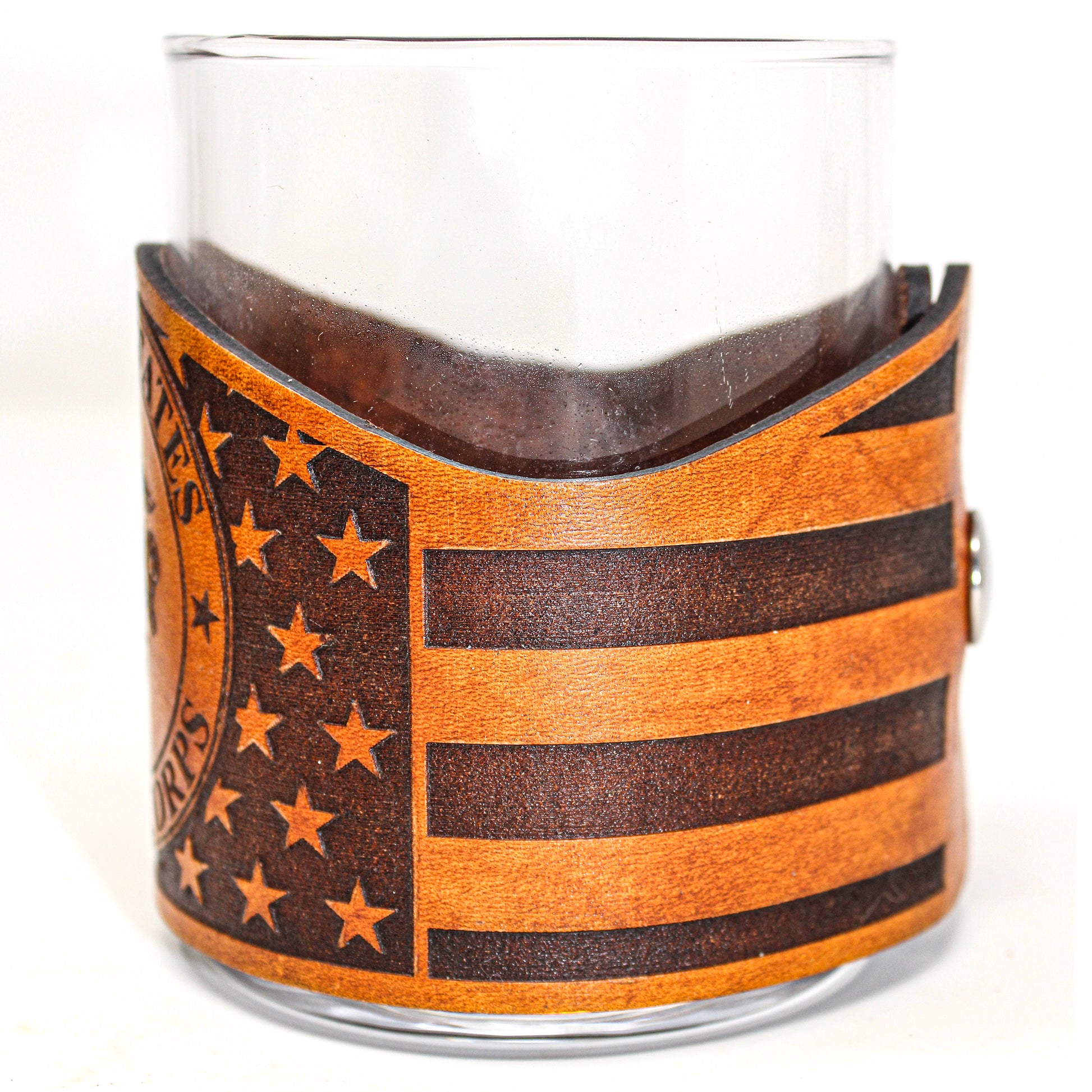 Our Military series consists of a large variety of Americana wraps with 11 oz rocks glasses. This style is decorated with MARINE CORPS seal placed over the American flag. Using thick 7-10 oz leather with precision programed laser engraving and fastened with a sturdy stainless steel marine grade snap. This design concept makes the leather wraps easy to unsnap for cleaning purposes or to simply stow away and change out for another wrap style. All leather is hand stained, hand distressed and hand finished which gives every piece it's own unique look.