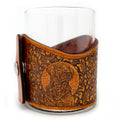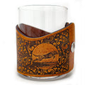 Our Bird Dog Engraver series consists of a large variety of dog and fowl species wraps with 11 oz rocks glasses. This style is decorated with the Mallards illustrated with LABs on both sides and then framed with a classic rifle engravers pattern. Using thick 7-10 oz leather with precision programed laser engraving and fastened with a sturdy stainless steel marine grade snap. This design concept makes the leather wraps easy to unsnap for cleaning purposes or to simply stow away and change out for another wrap style. All leather is hand stained, hand distressed and hand finished which gives every piece it's own unique look.