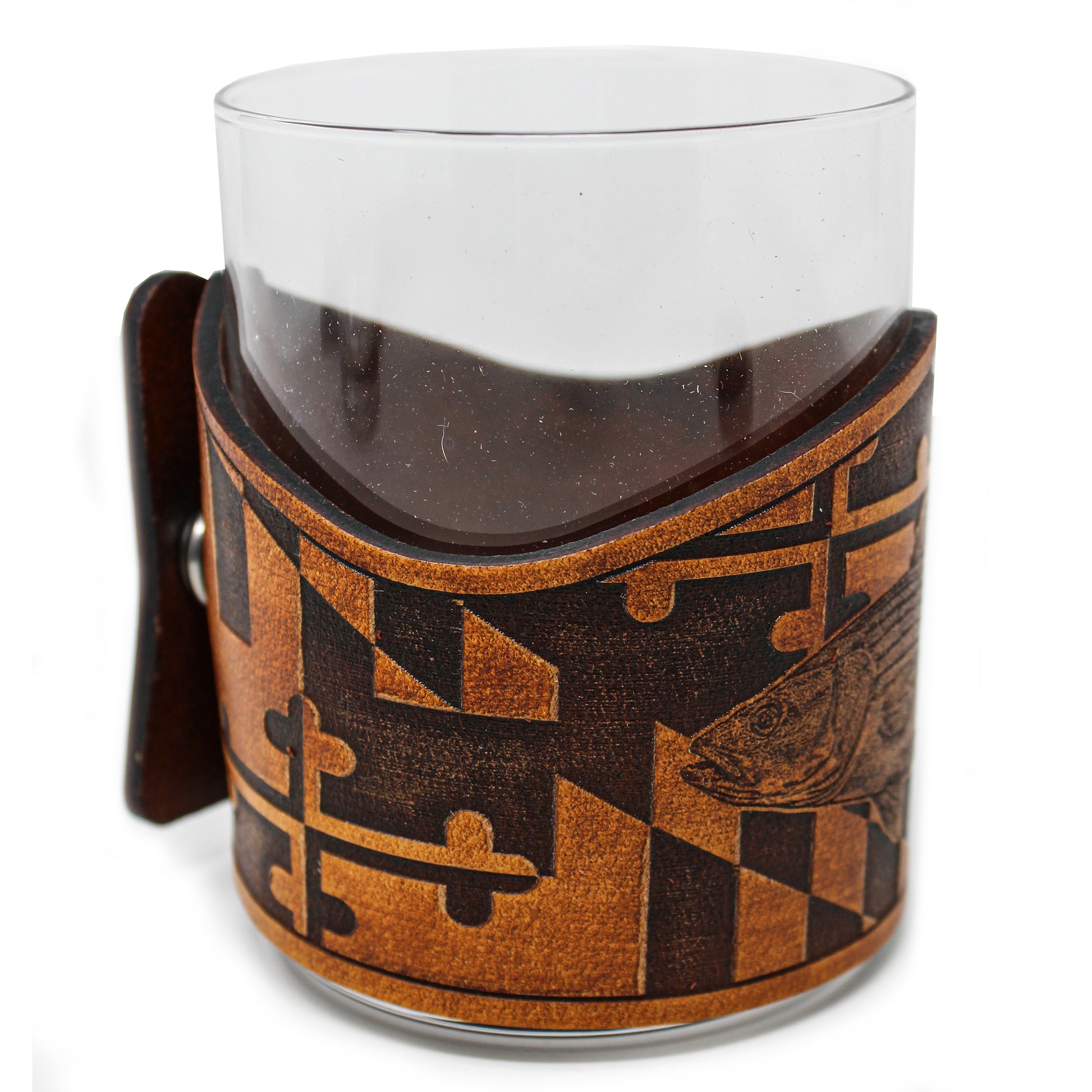 Our Fish Engraver series consist of a large variety of fish species wraps with 11 oz rocks glasses. This style is decorated with the Striped Sea Bass illustrated scientific study rendition and the iconic Maryland Flag pattern wrapped fully around glass. Using thick 7-10 oz leather with precision programed laser engraving and fastened with a sturdy stainless steel marine grade snap. This design concept makes the leather wraps easy to unsnap for cleaning purposes or to simply stow away and change out for another wrap style. All leather is hand stained, hand distressed and hand finished which gives every piece it's own unique look.