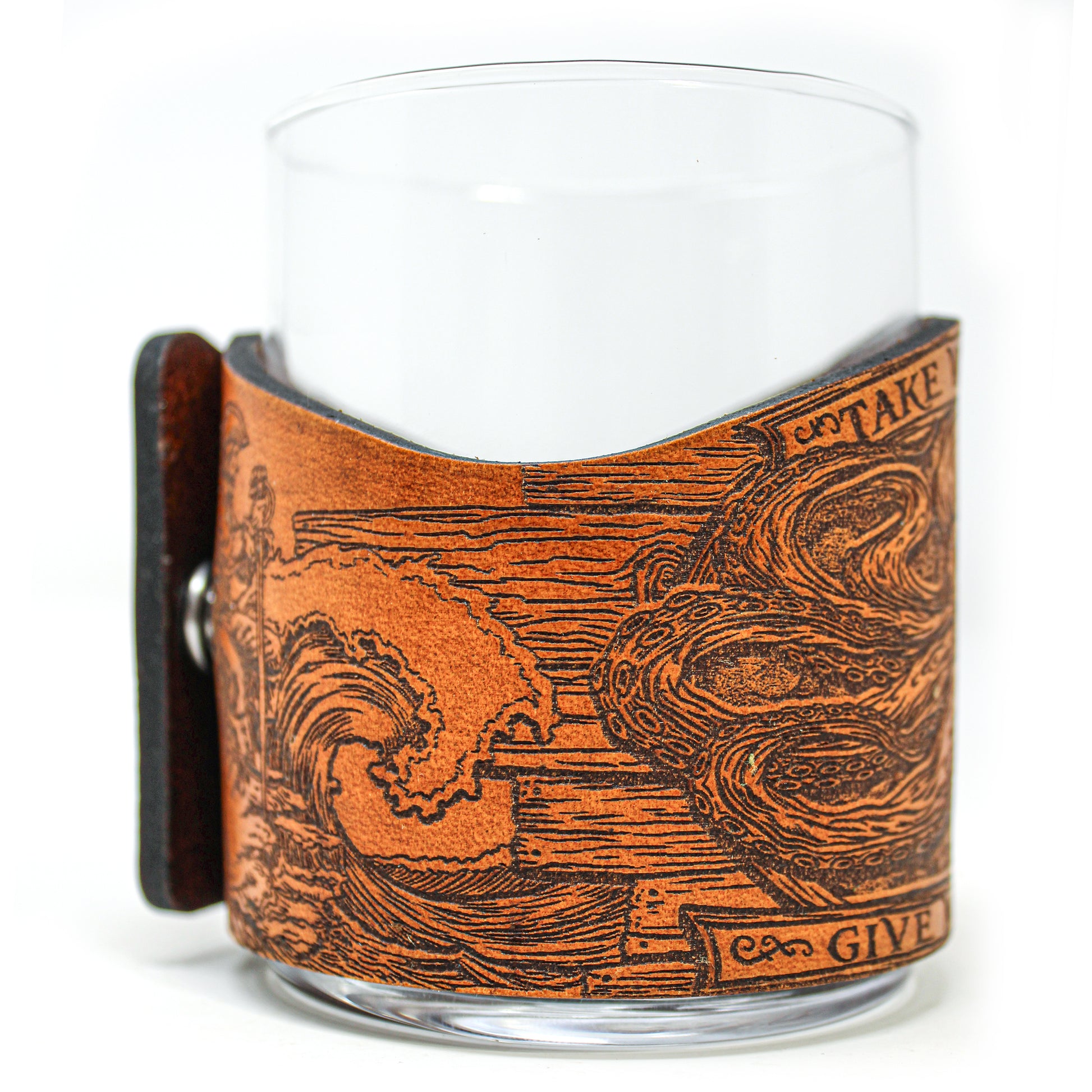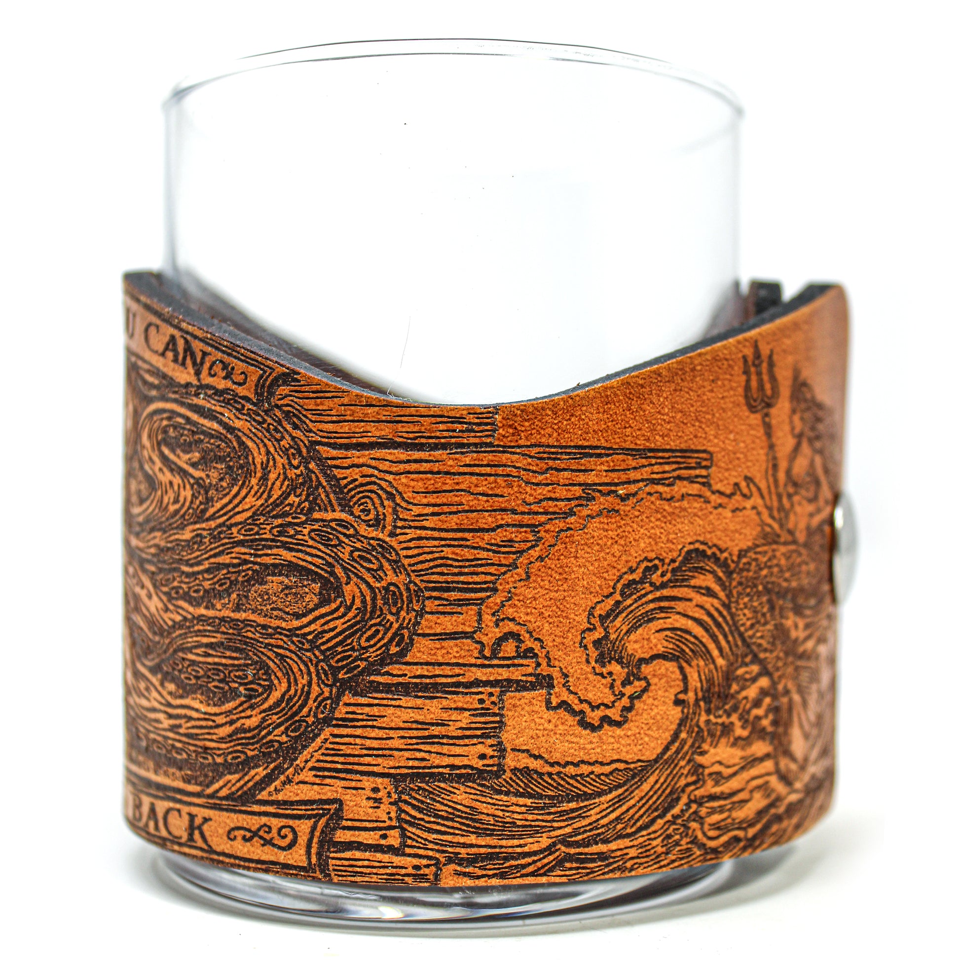Our Pirate Toast Engraver Sets consist of a large variety of options with illustrations on 3 sides of each glass framed with a nautical theme with a pirate and a mermaid on each side. Using thick 7-10 oz leather with precision programed laser engraving and fastened with a sturdy stainless steel marine grade snap. This design concept makes the leather wraps easy to unsnap for cleaning purposes or to simply stow away and change out for another wrap style. All leather is hand stained and hand finished which gives every piece it's own unique look.