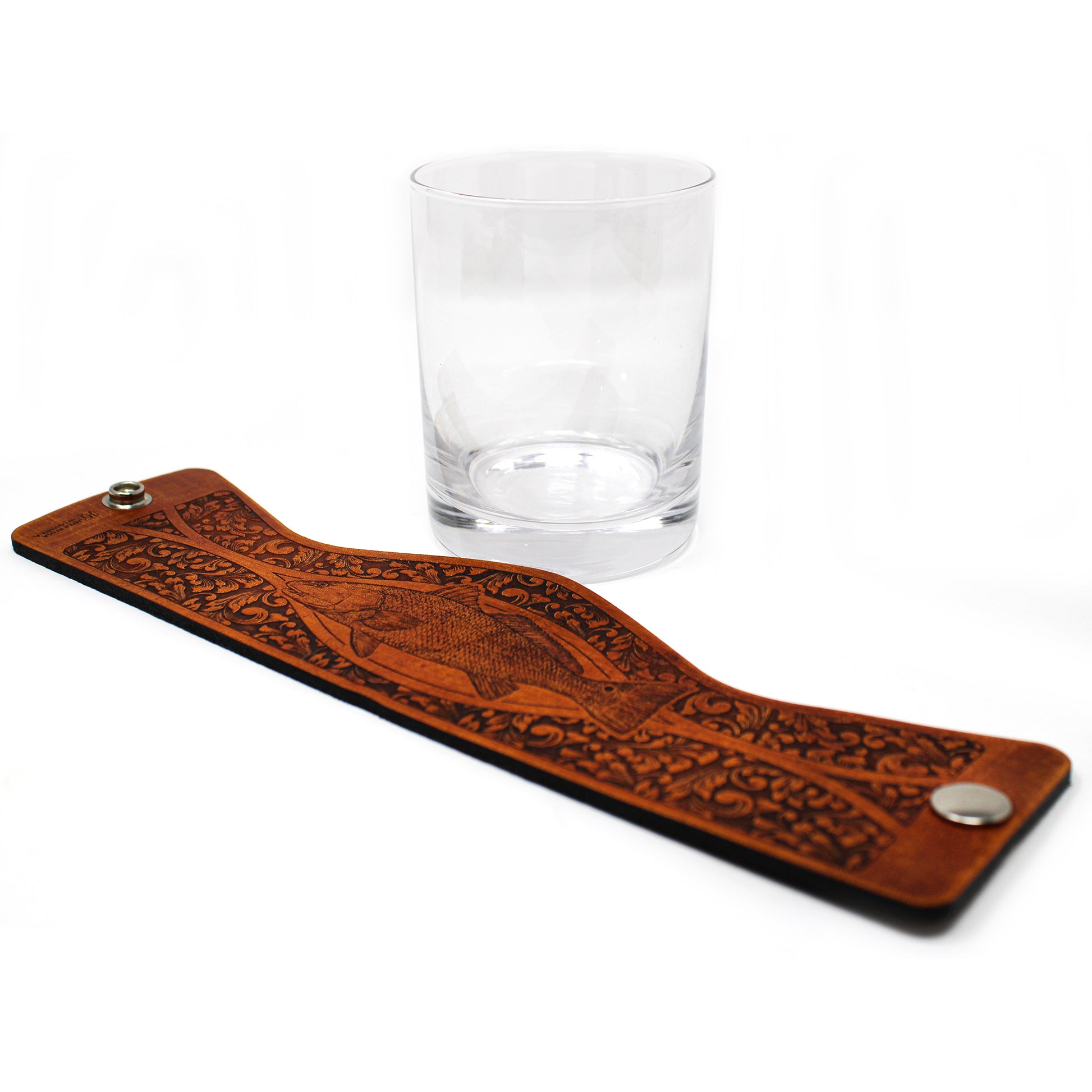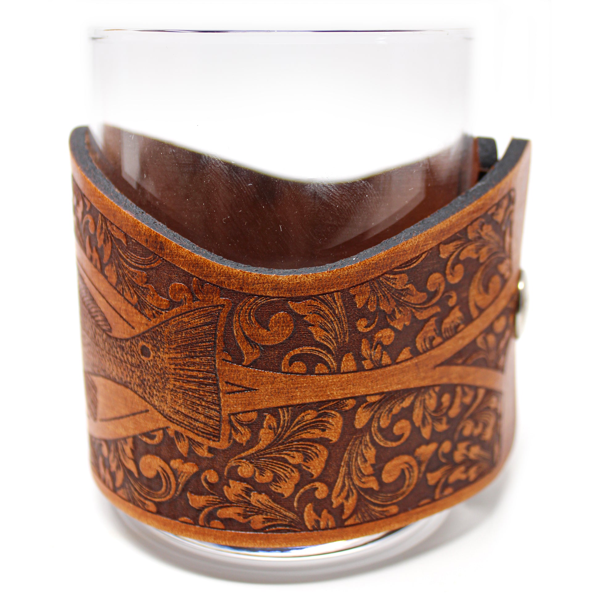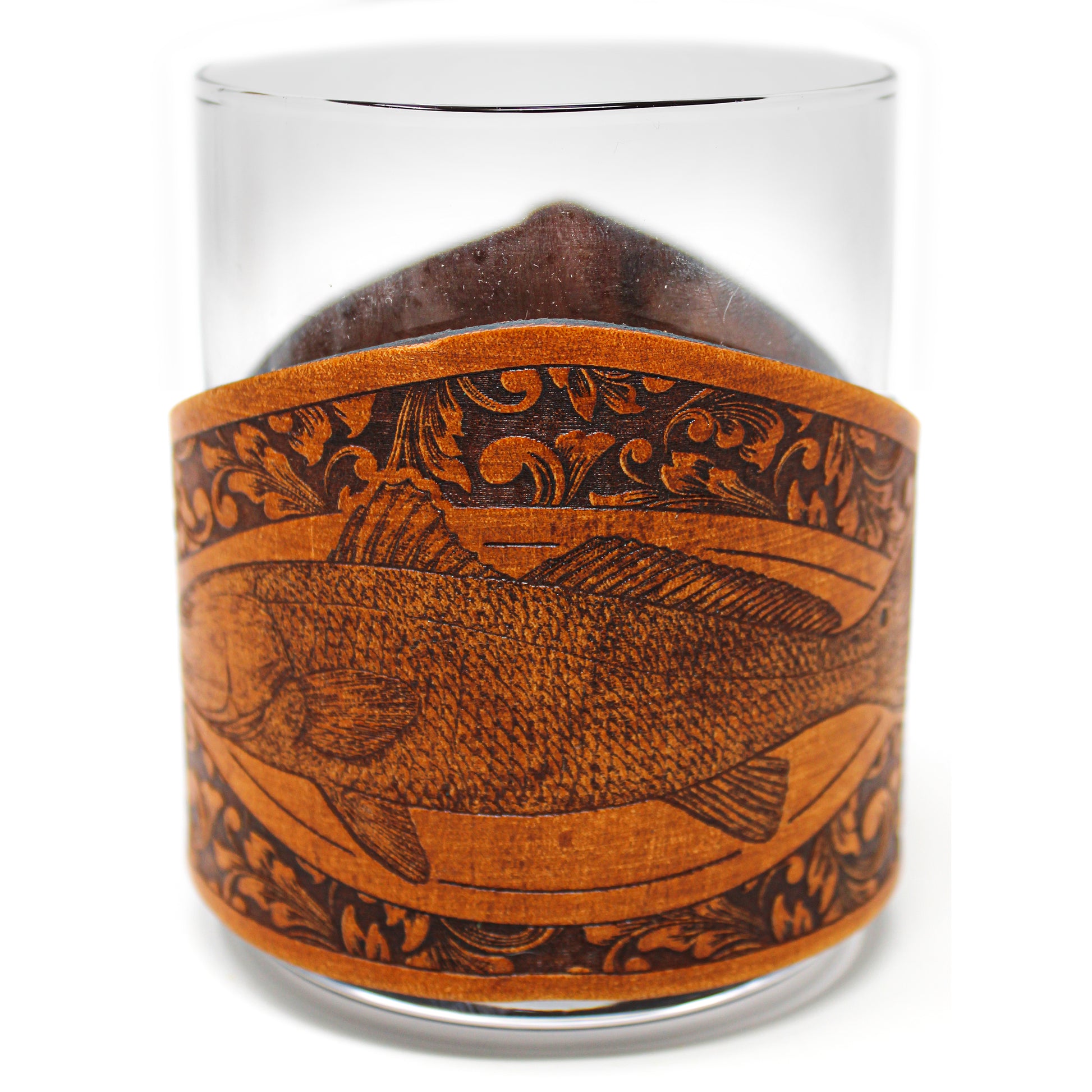 Our Fish Engraver series consist of a large variety of fish species wraps with 11 oz rocks glasses. This style is decorated with the Redfish illustrated scientific study rendition and then framed with a classic rifle engravers pattern. Using thick 7-10 oz leather with precision programed laser engraving and fastened with a sturdy stainless steel marine grade snap. This design concept makes the leather wraps easy to unsnap for cleaning purposes or to simply stow away and change out for another wrap style. All leather is hand stained, hand distressed and hand finished which gives every piece it's own unique look.