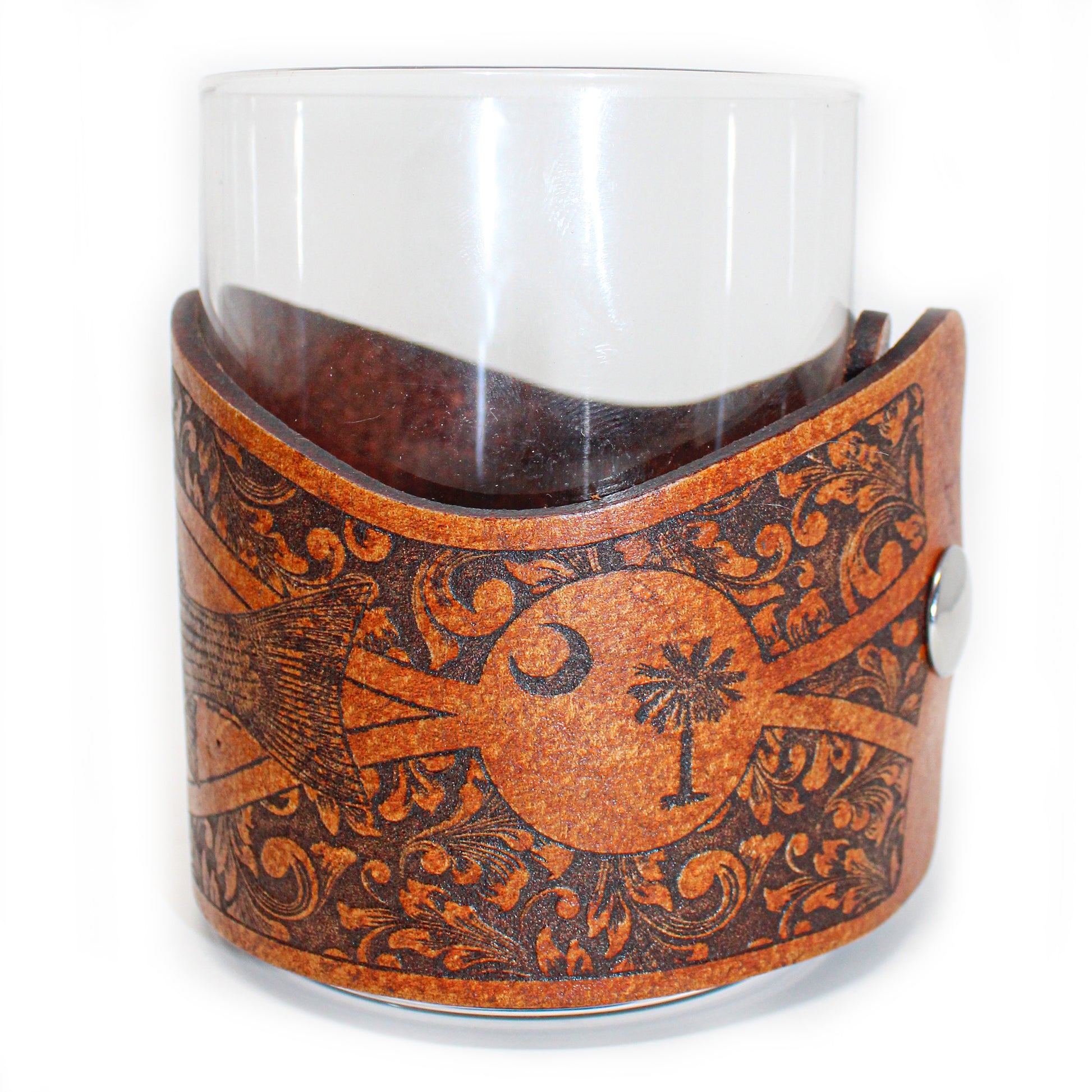 Our Fish Engraver series consist of a large variety of fish species wraps with 11 oz rocks glasses. This style is decorated with the Striped Sea Bass illustrated scientific study rendition and the iconic Crescent Moon Palmetto. Then framed with a classic rifle engravers pattern. Using thick 7-10 oz leather with precision programed laser engraving and fastened with a sturdy stainless steel marine grade snap. This design concept makes the leather wraps easy to unsnap for cleaning purposes or to simply stow away and change out for another wrap style. All leather is hand stained, hand distressed and hand finished which gives every piece it's own unique look.