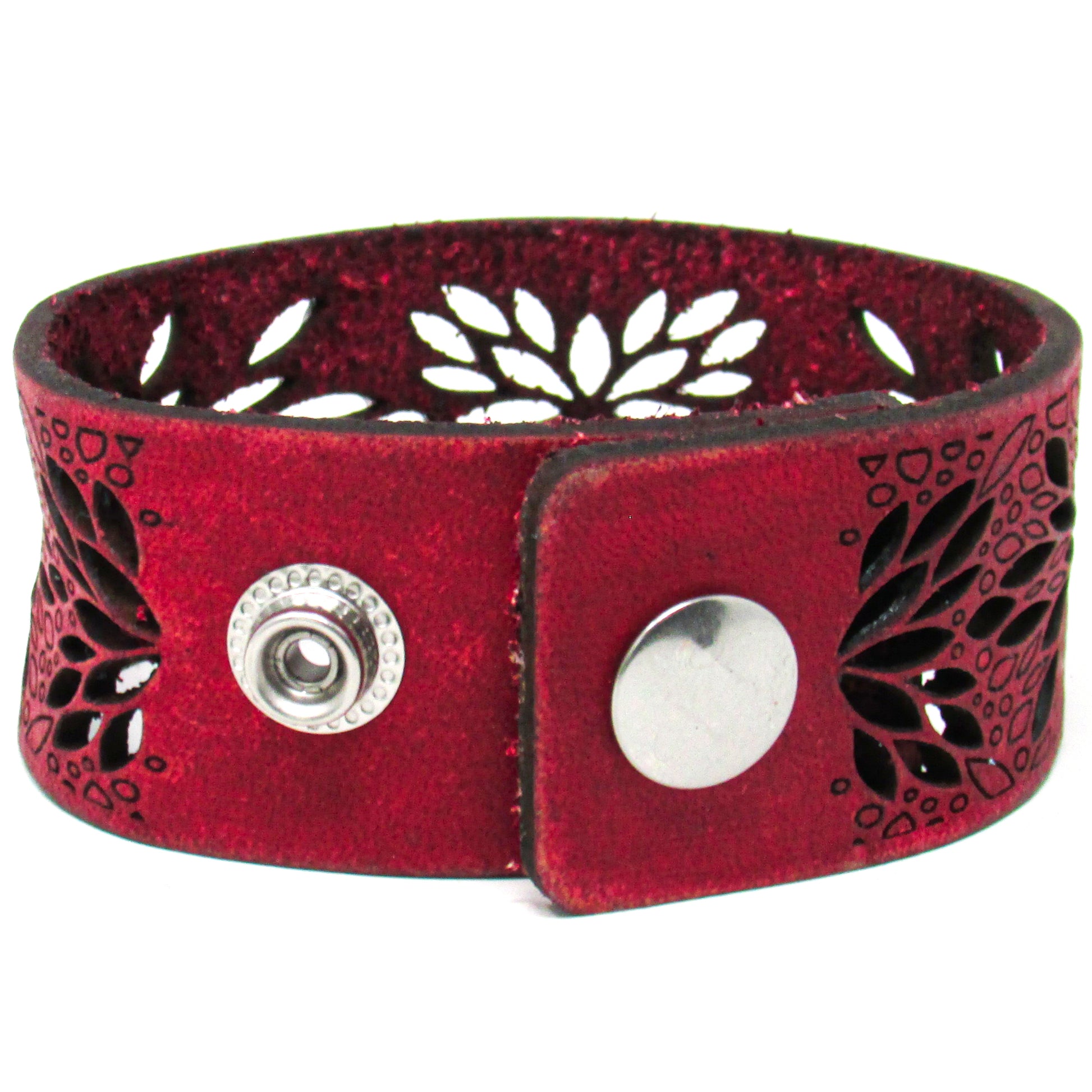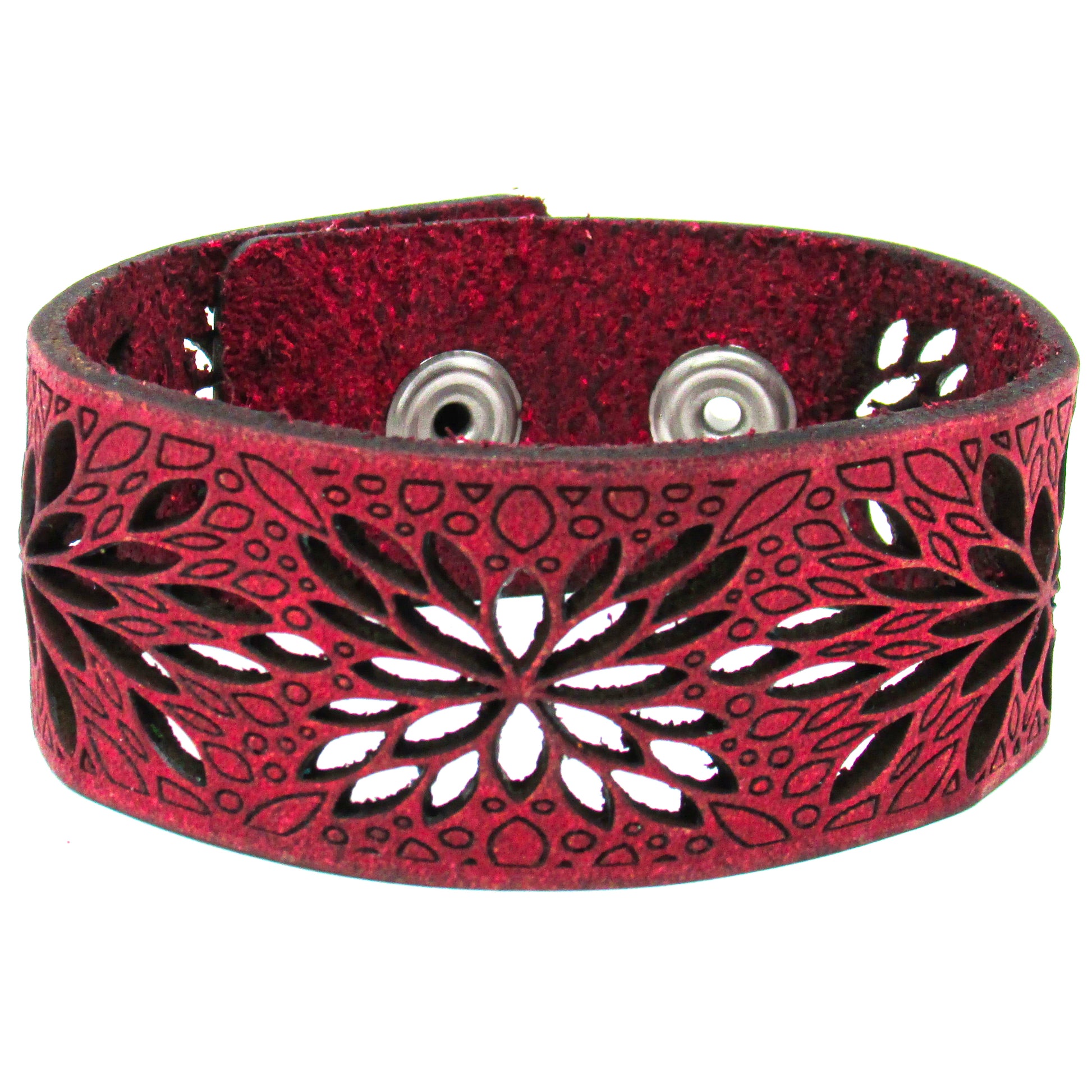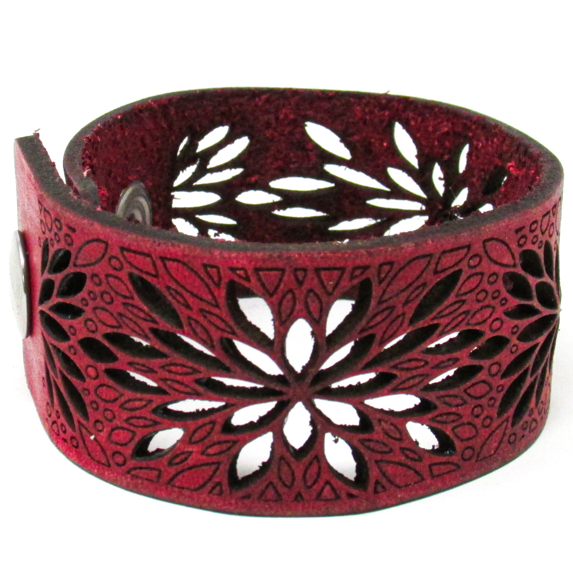 Simple, but elegant design featuring a flower burst cut pattern design. Made of 100% leather with standard 4-6 oz thickness. Featuring stainless steel snaps for those fun in the sun days on the beach. See current color dye choices to choose from.