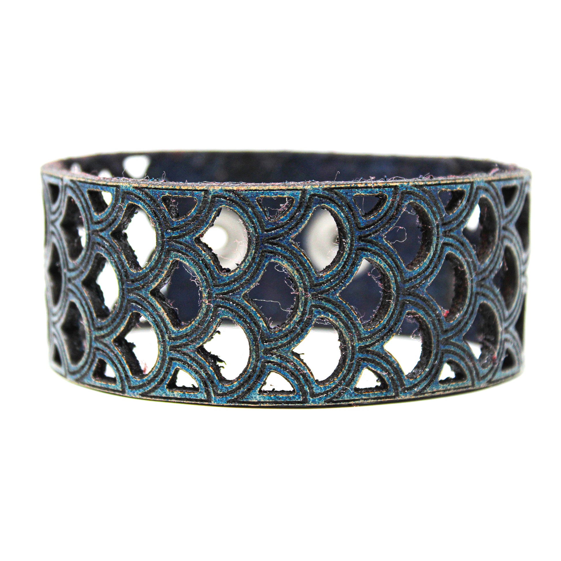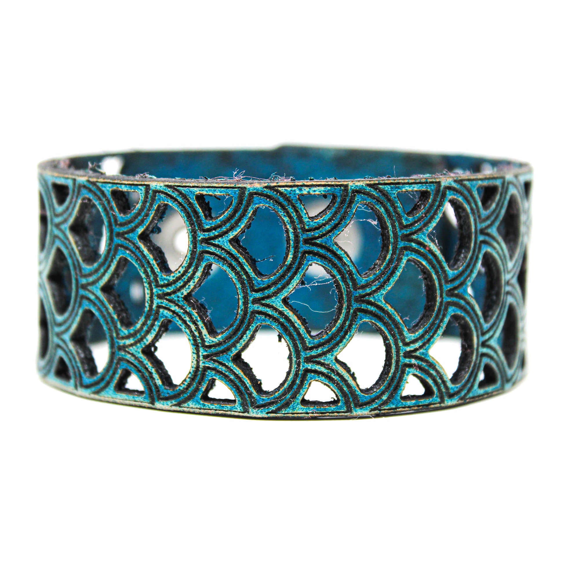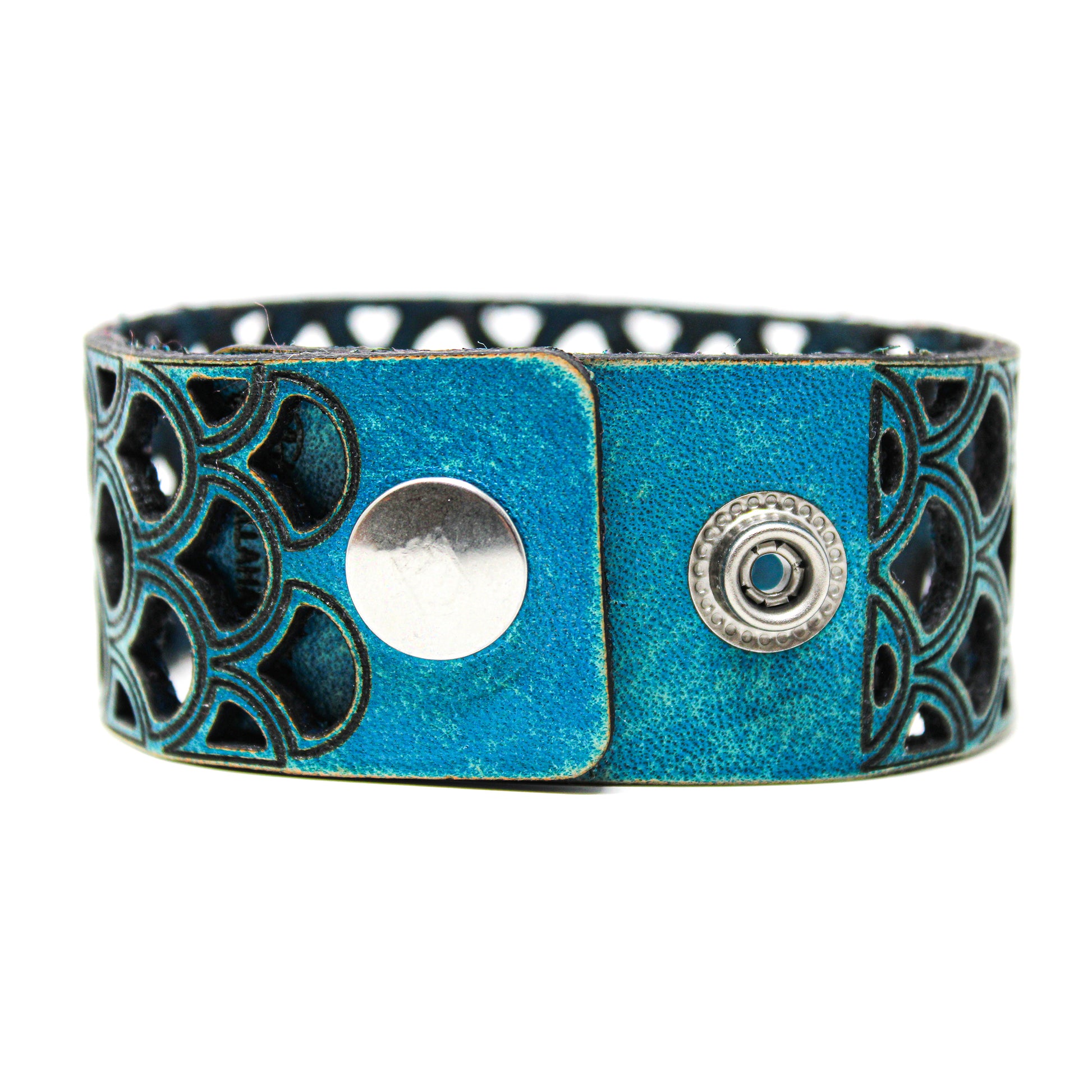 Simple, but elegant design featuring a Mermaid scales cut pattern design. Made of 100% leather with standard 4-6 oz thickness. Featuring stainless steel snaps for those fun in the sun days on the beach. See current color dye choices to choose from.
