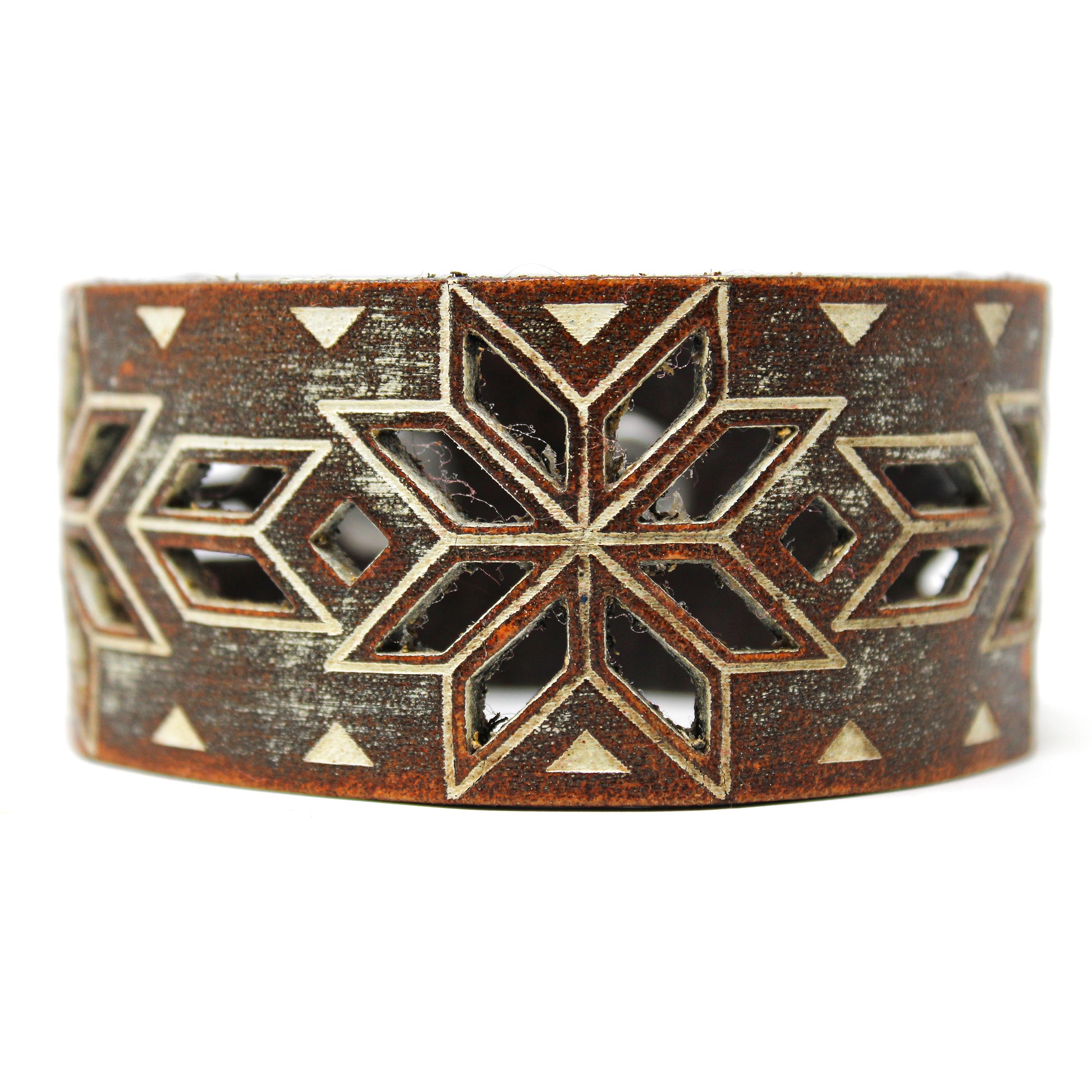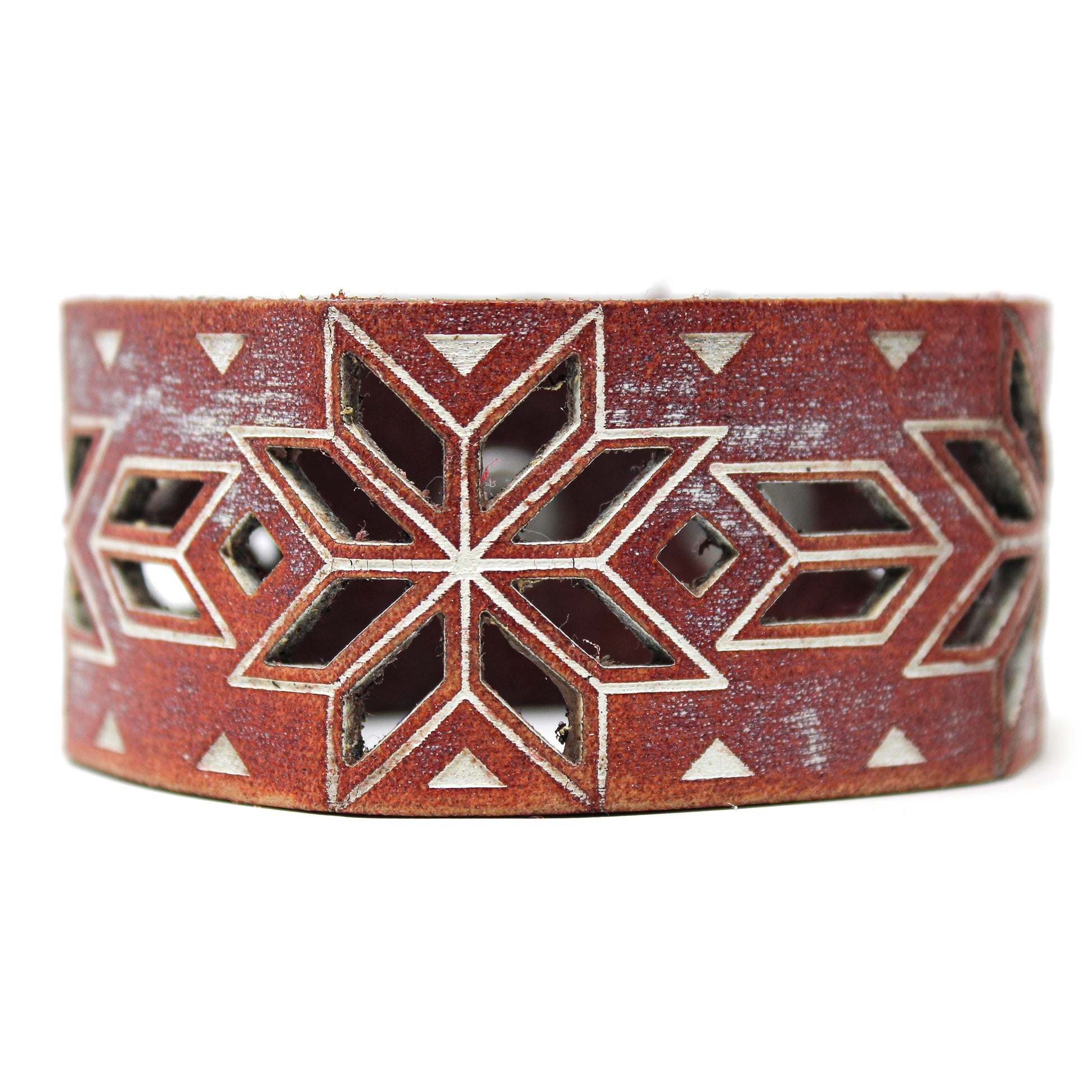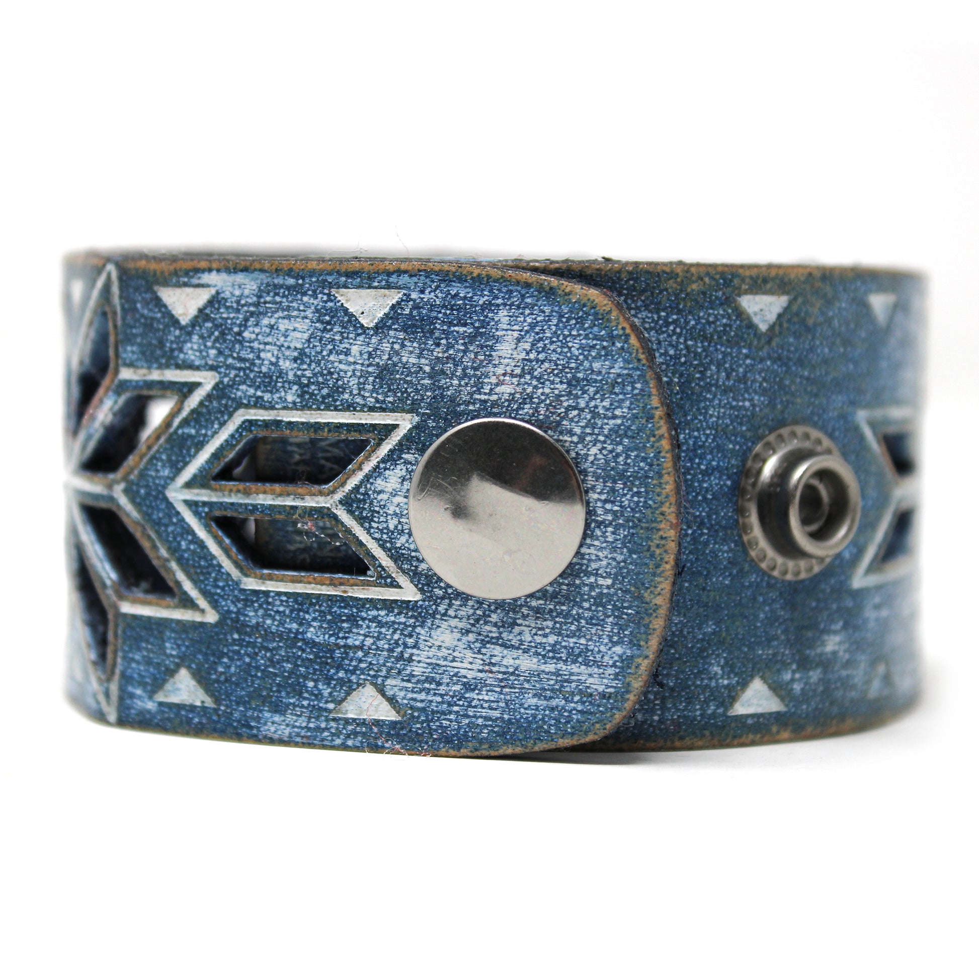 Simple, but elegant design featuring rhythmic triangles and cut outs. Made of 100% leather with standard 4-6 oz thickness. Featuring stainless steel snaps for those fun in the sun days on the beach. See current color dye choices to choose from.