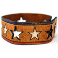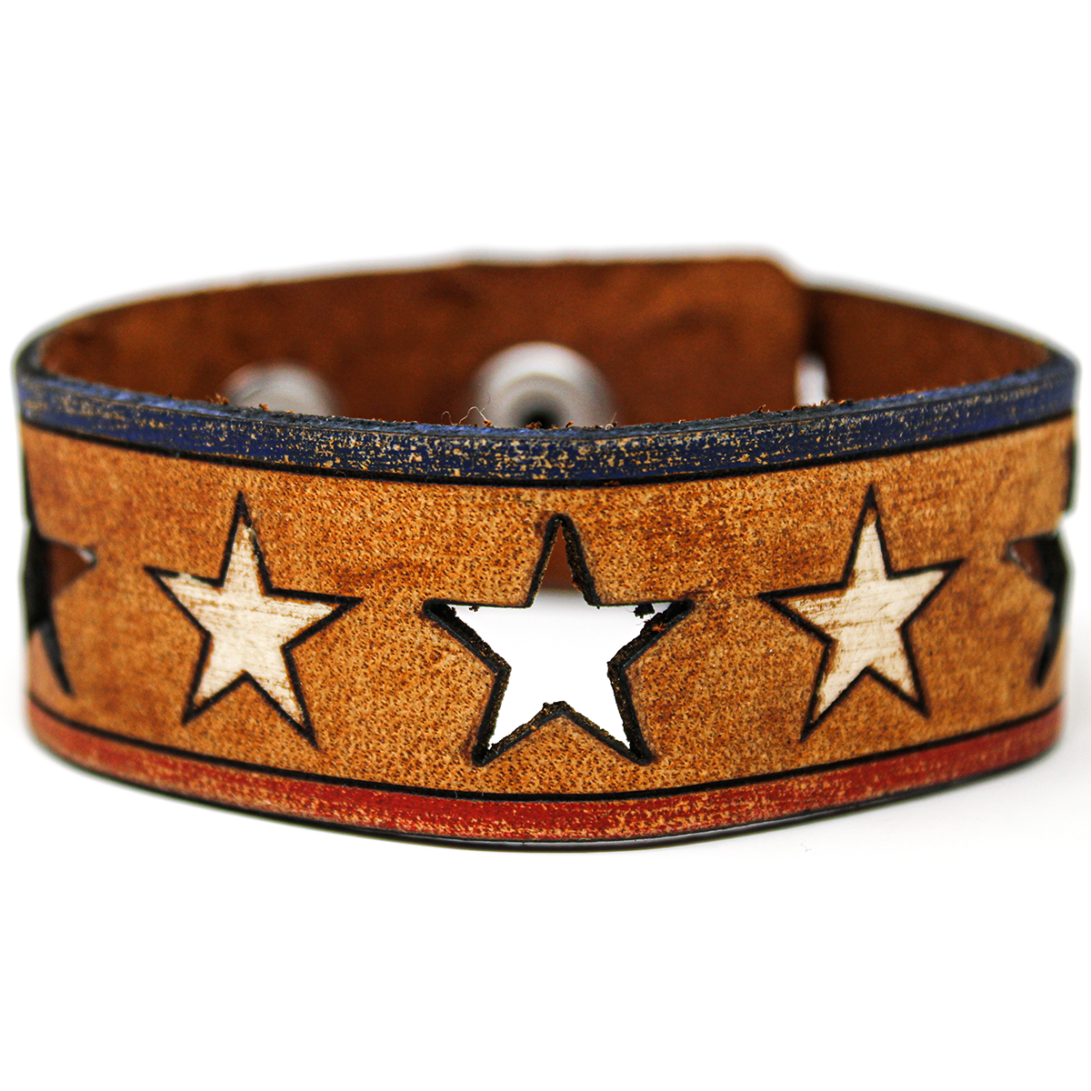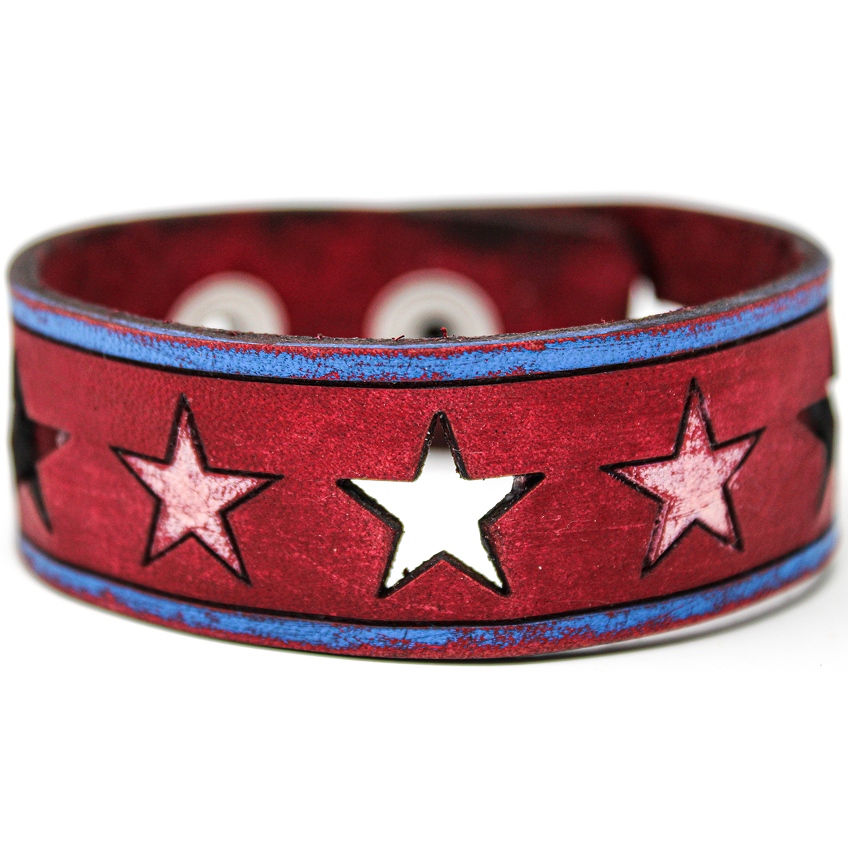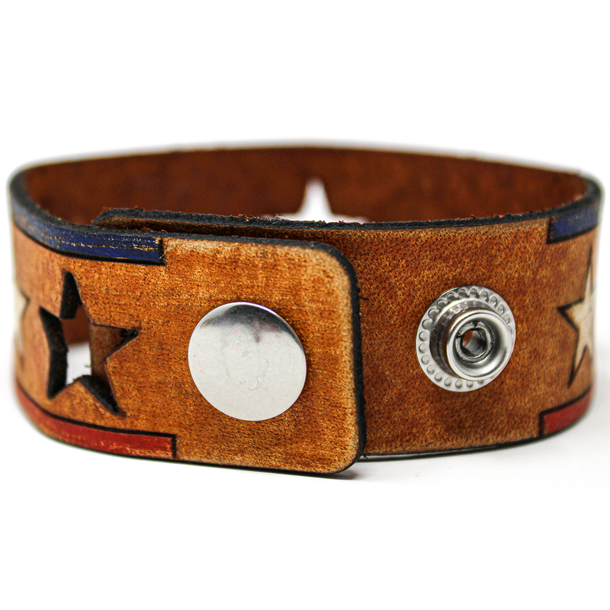 Simple, but elegant design featuring a Stars and Bars repeat design. Hand painted and distressed. Made of 100% leather with standard 4-6 oz thickness. Featuring stainless steel snaps for those fun in the sun days on the beach.