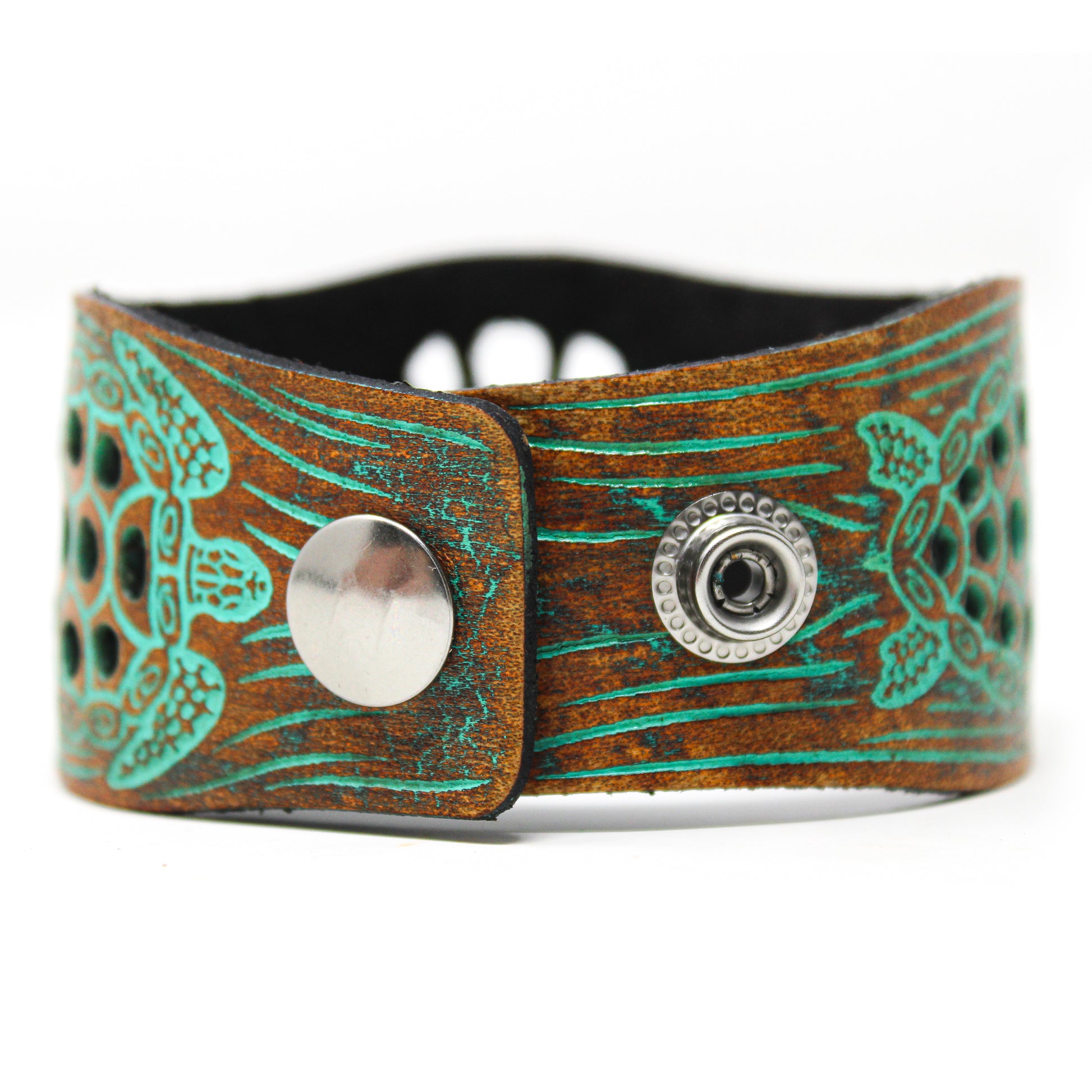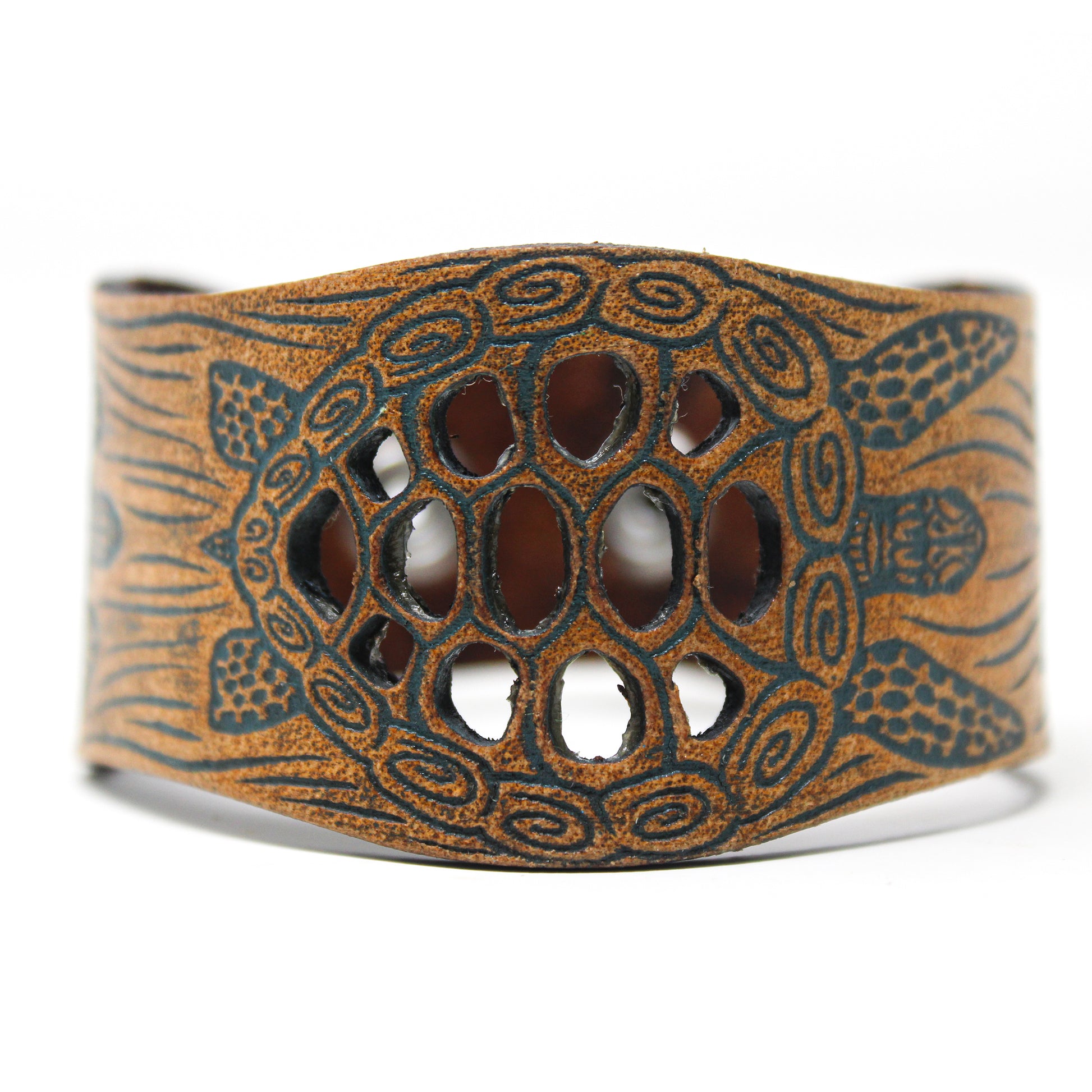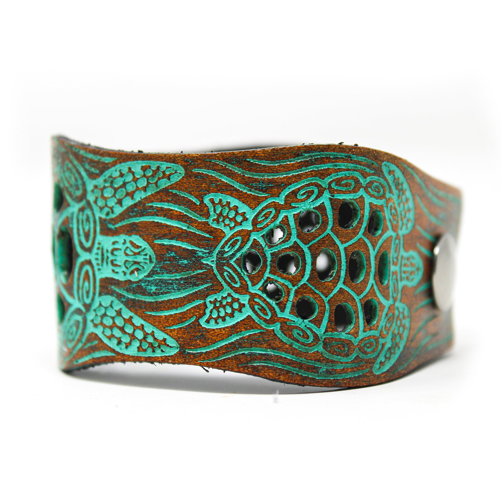 Simple, but elegant design featuring rhythmic turtles swimming in the current design and cut outs. Made of 100% leather with standard 4-6 oz thickness. Featuring stainless steel snaps for those fun in the sun days on the beach. See current color dye choices to choose from.