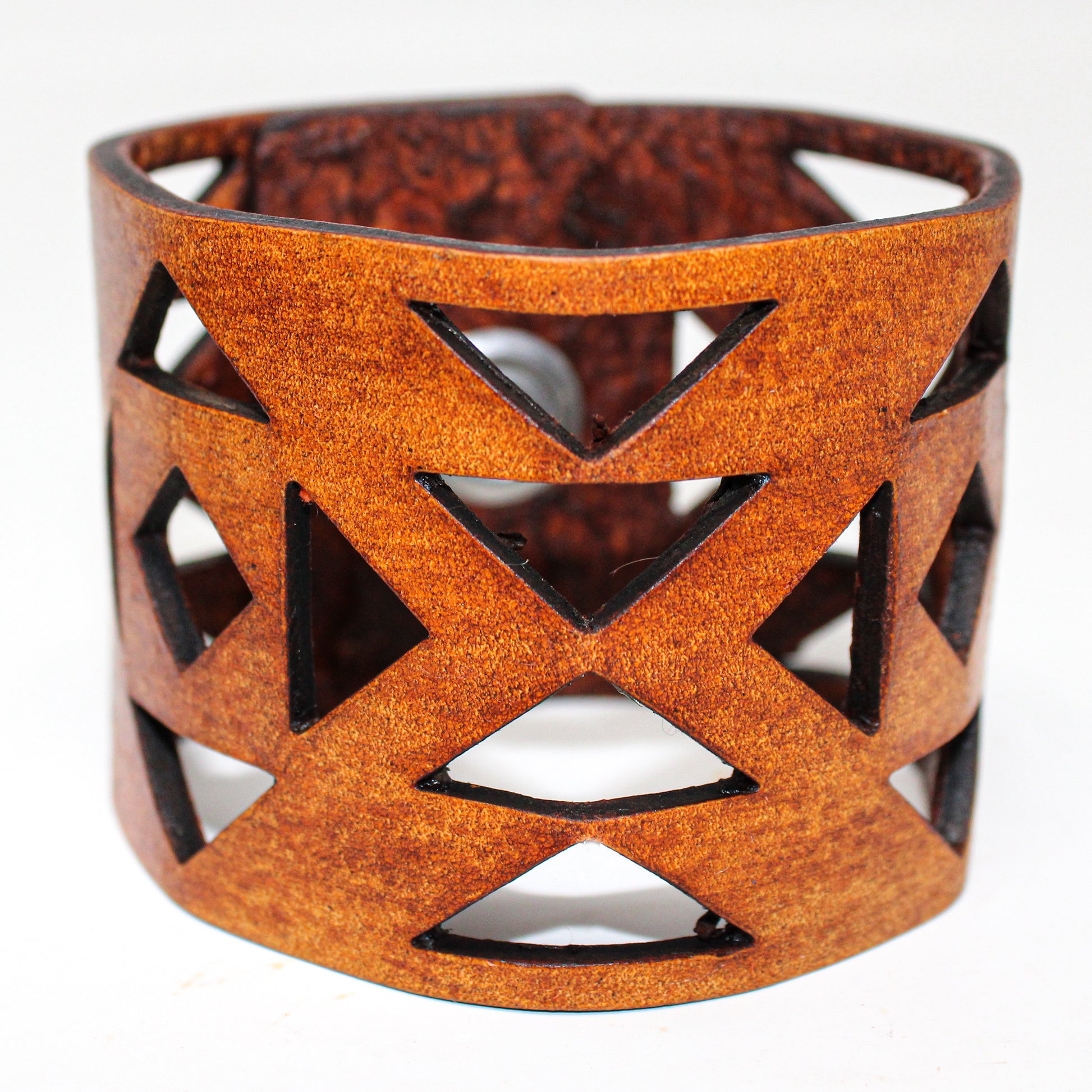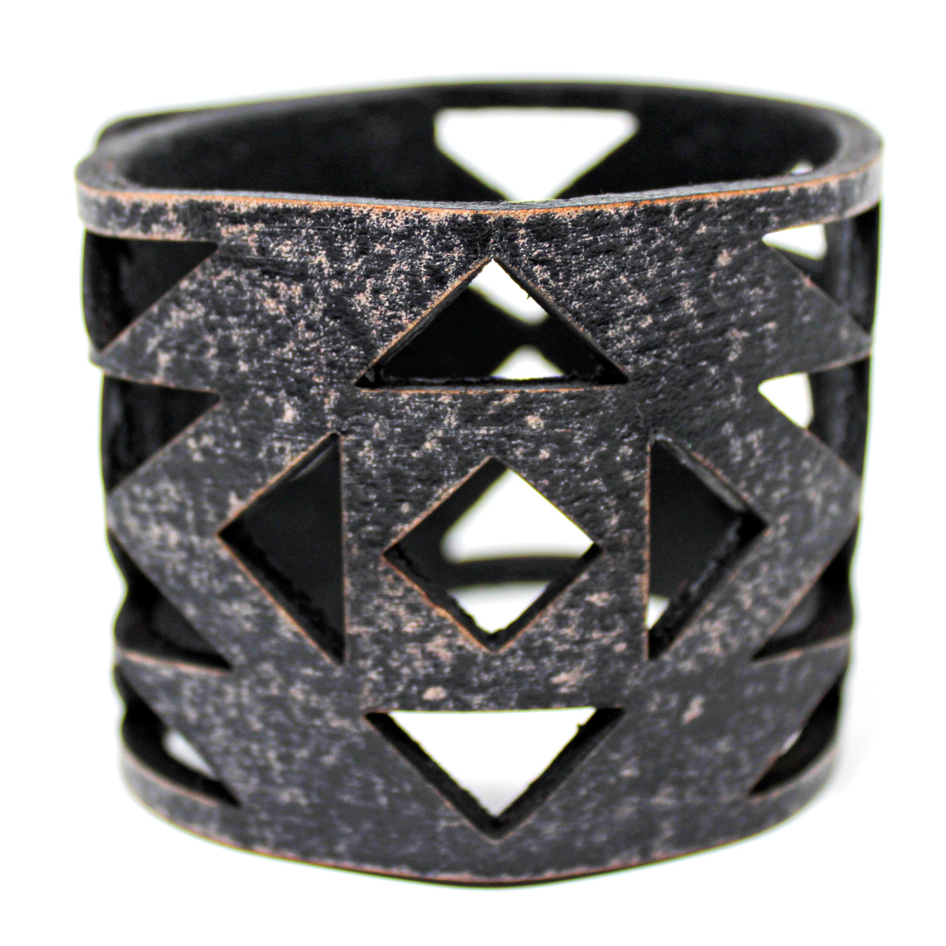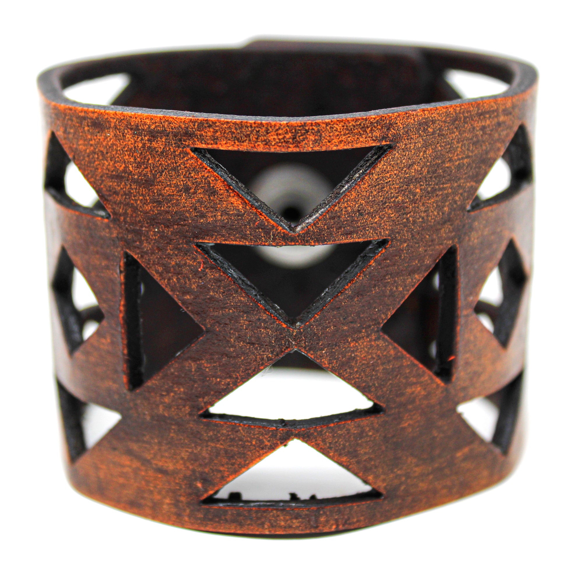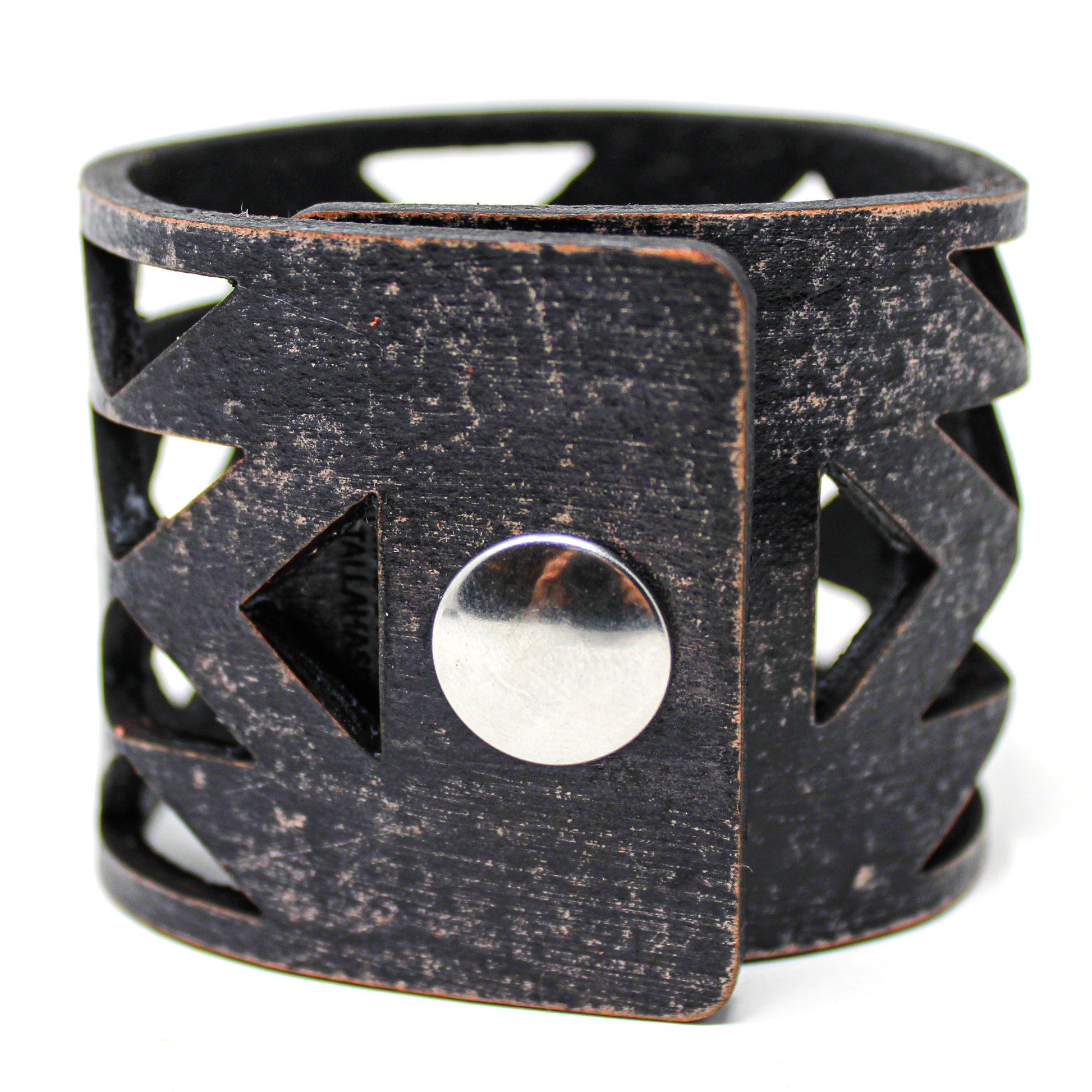 Simple, but elegant line of thick 100% leather Cuffs with laser engraved and cut designs featuring a series of tribal triangle cuts inspired by American Indian Tribal patterns. Artisan hand finished treatments. Featuring stainless steel snaps for those fun in the sun days on the beach. Proudly made in Tallahassee, FL USA.
