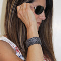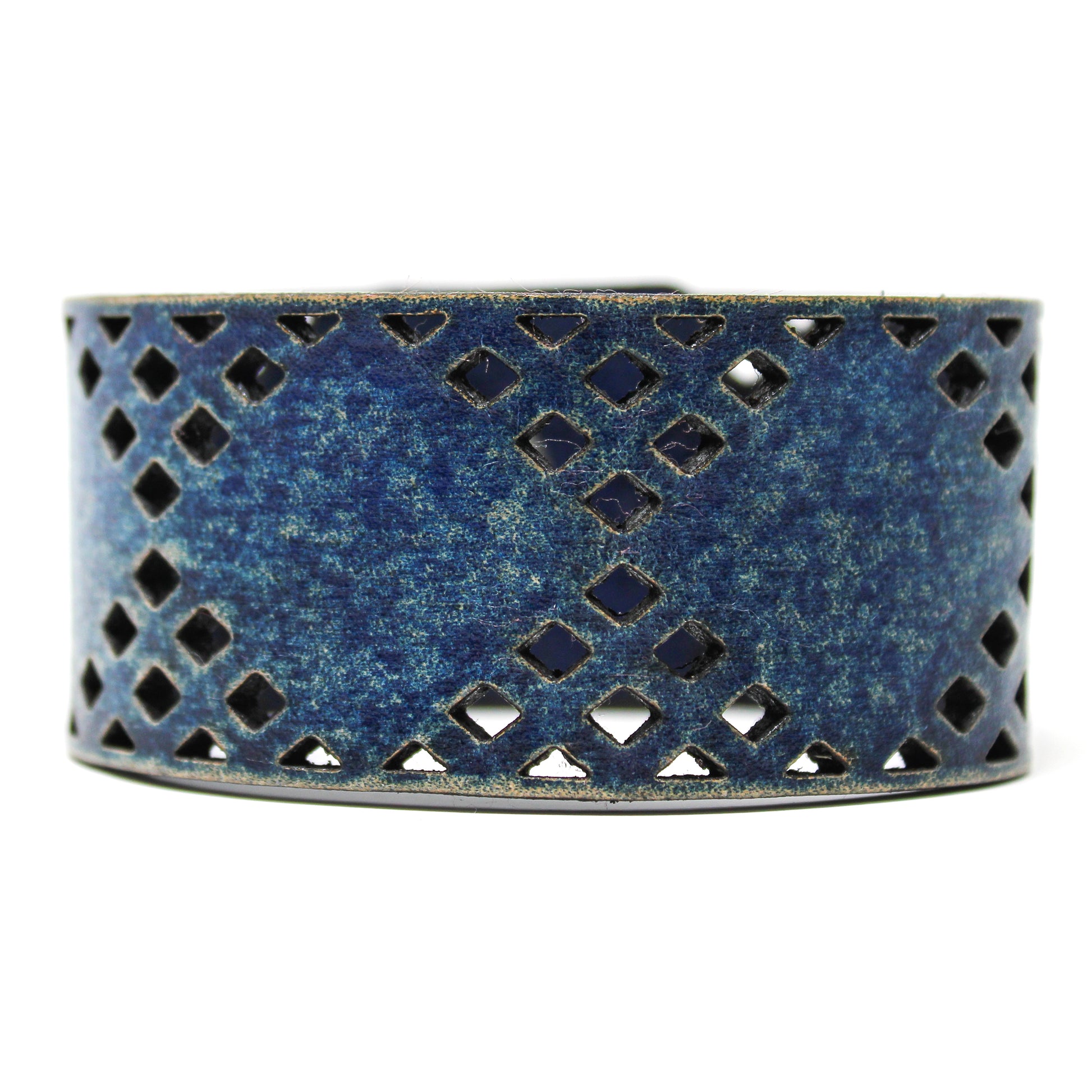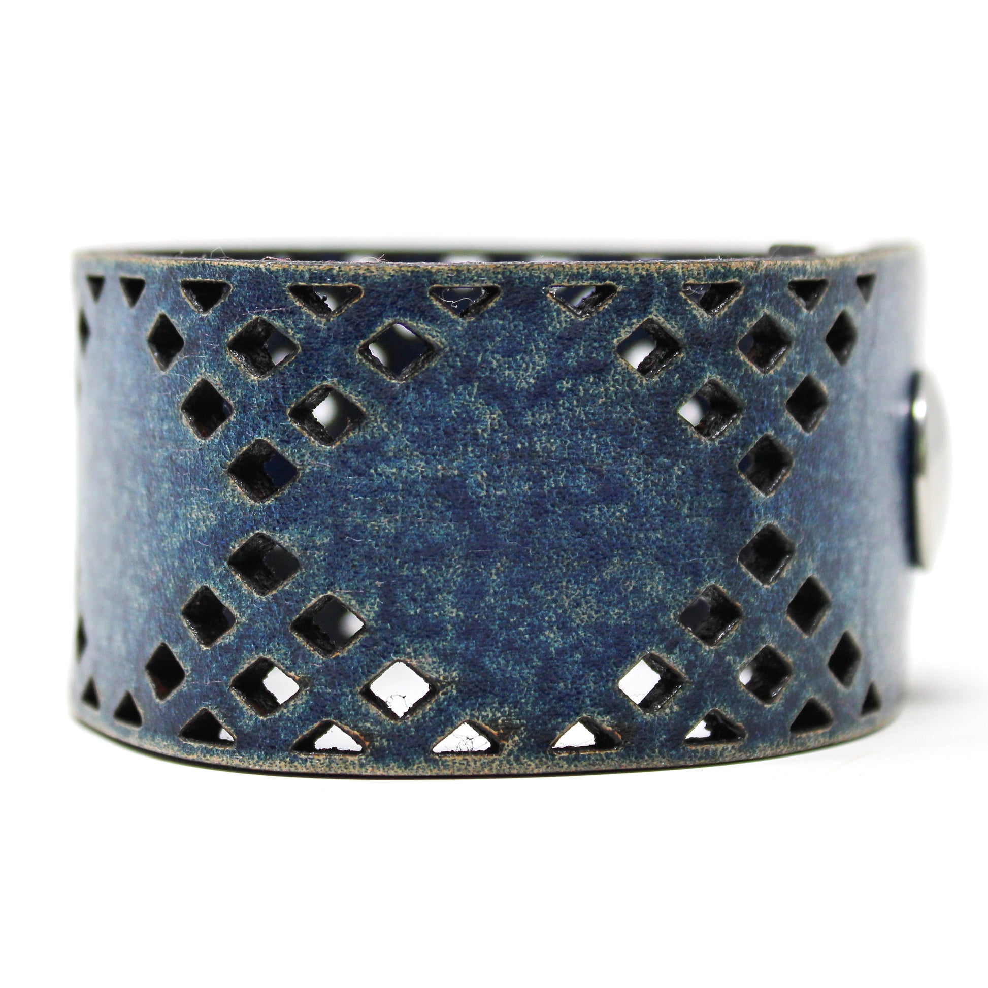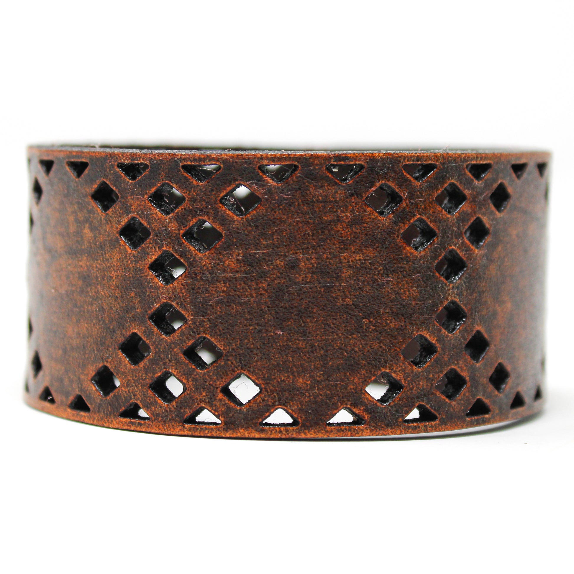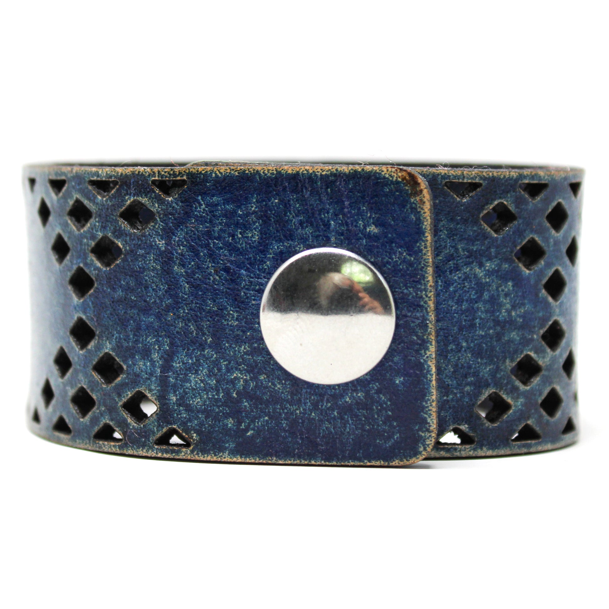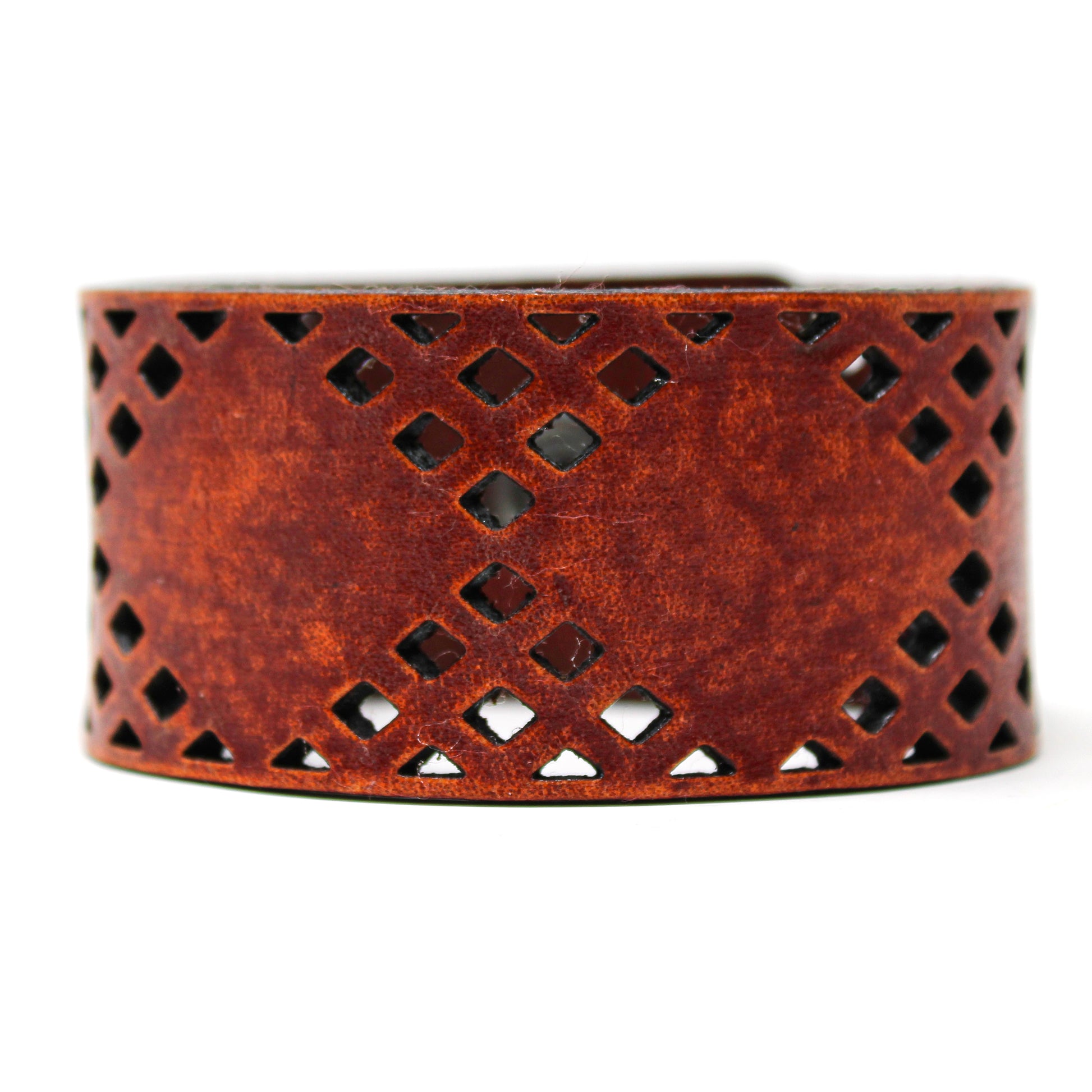 Simple, but elegant line of thick 100% leather Cuffs with laser engraved and cut designs featuring a series of diamond cuts inspired from a pattern you see around the iconic cowboy hat. Artisan hand finished treatments. Featuring stainless steel snaps for those fun in the sun days on the beach. Proudly made in Tallahassee, FL USA.